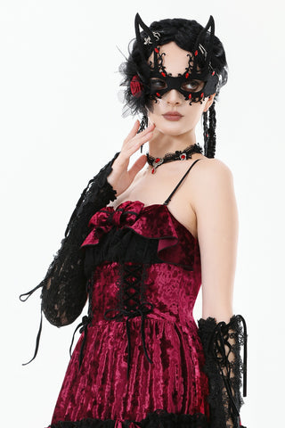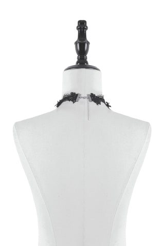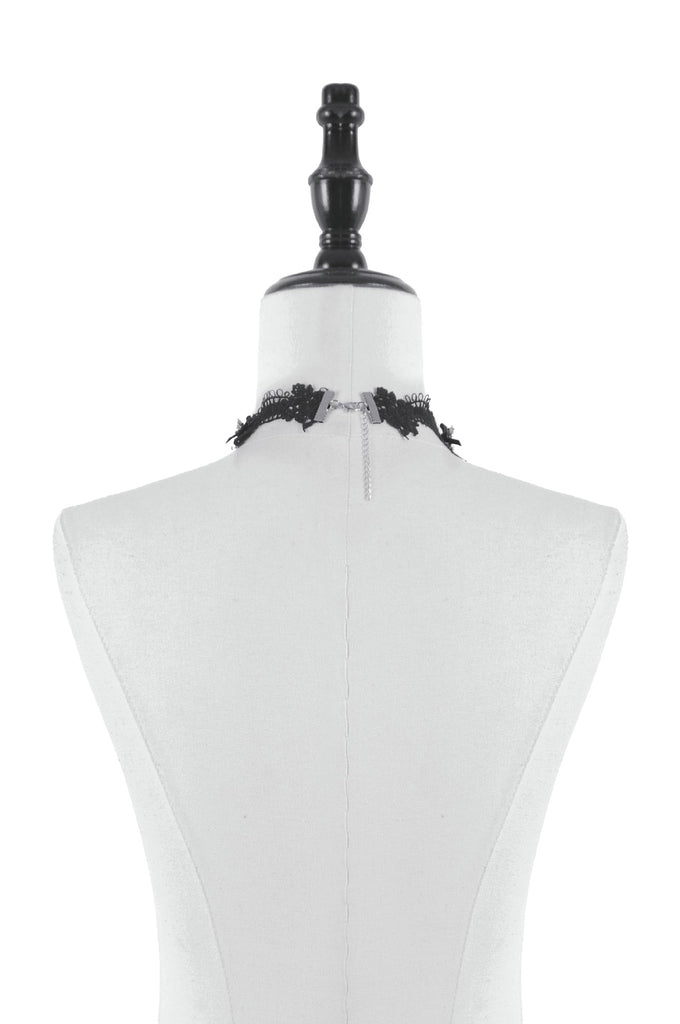A gothic relic of beauty and sorrow—this black lace choker wraps the neck in delicate darkness. Embellished with blood-red faux gemstones and antique silver accents, it curves in a soft wave that flatters the neckline and commands attention.