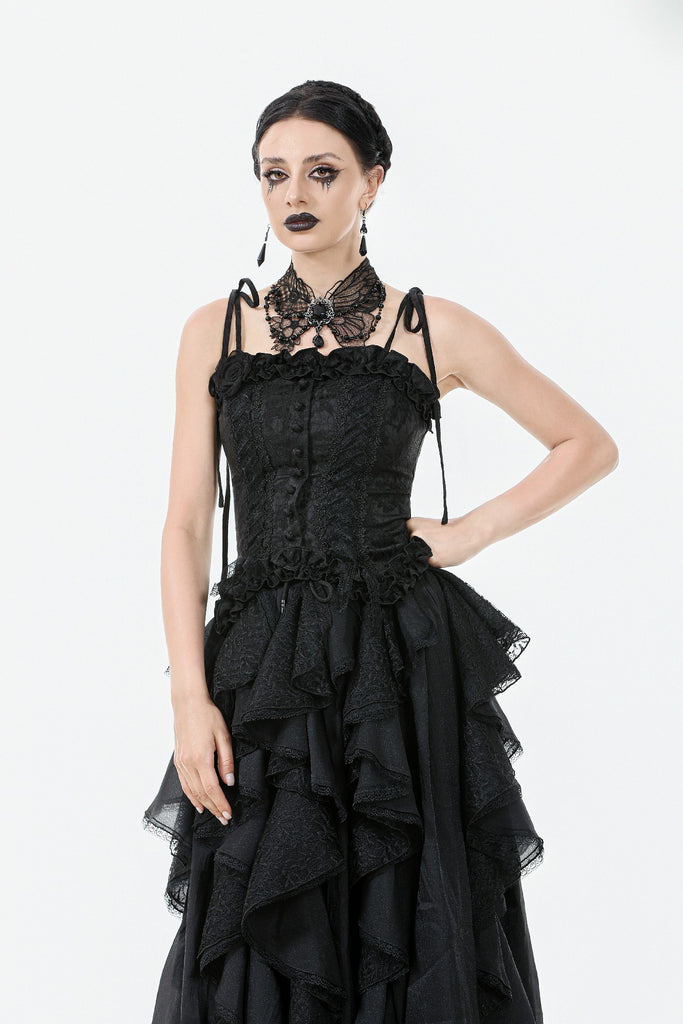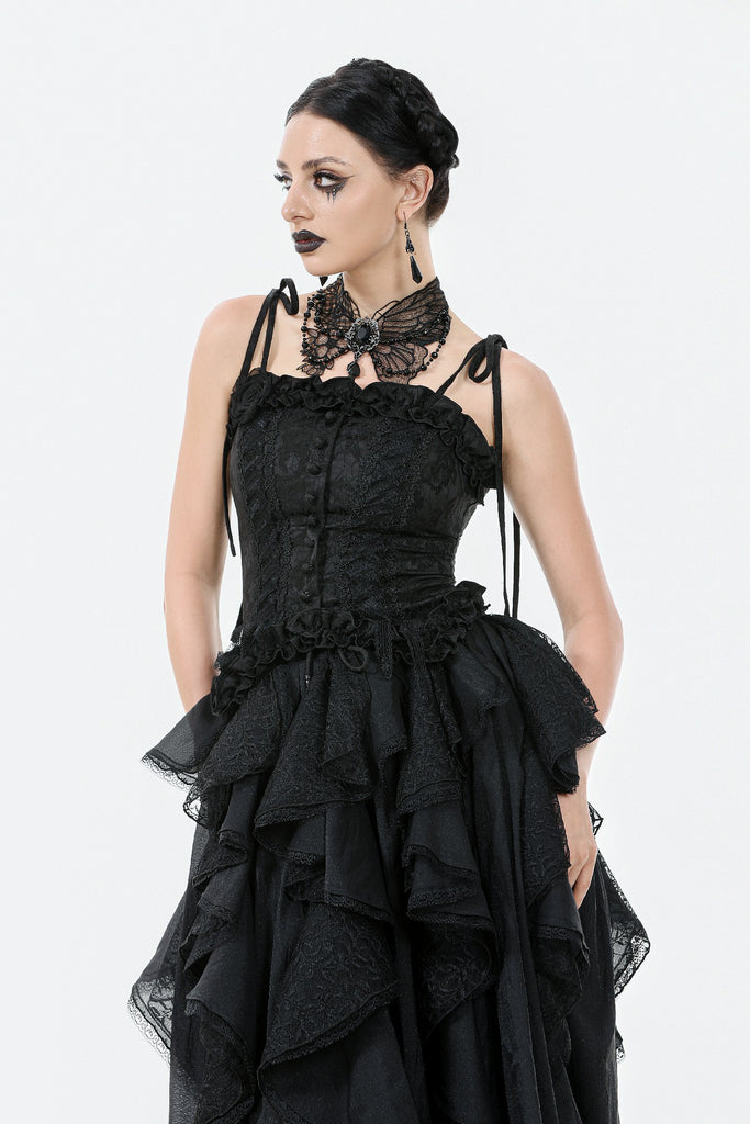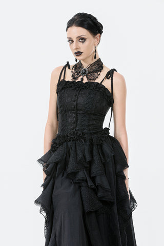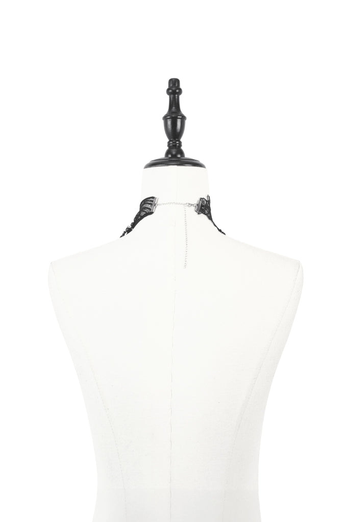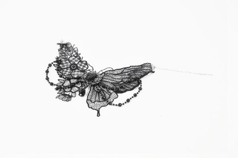 Inspired by a moth’s wings veiled in shadows, this gothic lace collar fuses plaid mesh, floral motifs, and netting into a richly layered structure. Draped black beads arc from the sides like tethered wings, offering movement and ornate silhouette. At the center sits a bold black gemstone framed with vintage silver filigree, radiating baroque opulence. A statement piece for those who revel in beauty edged with decay — where the elegance of lace meets the mystique of darkness.