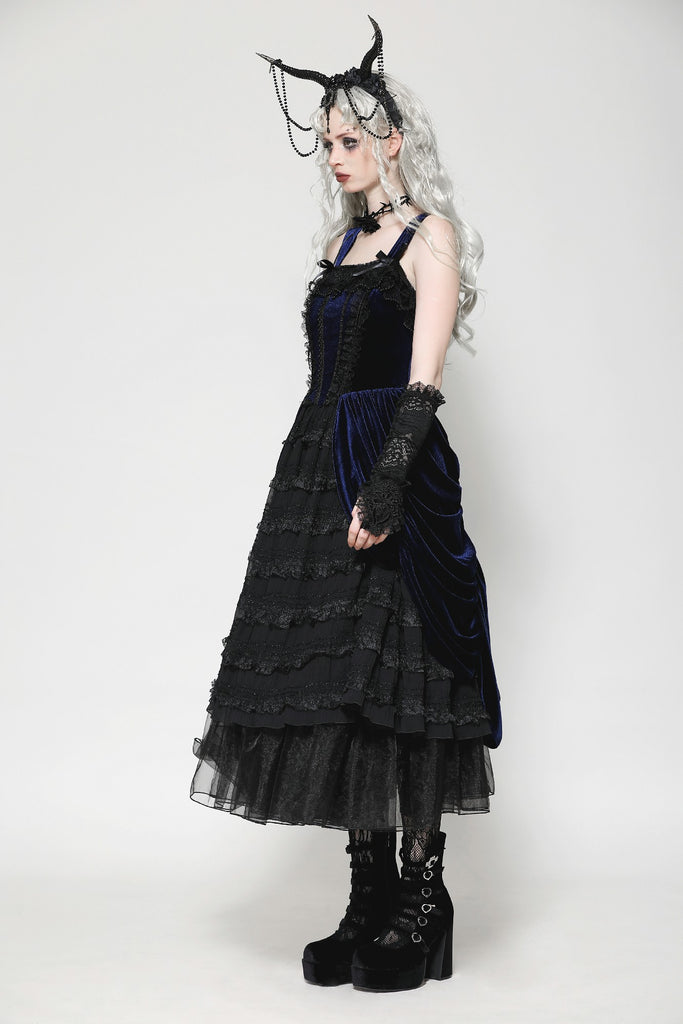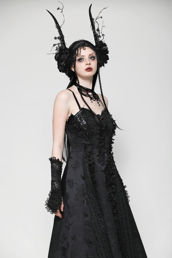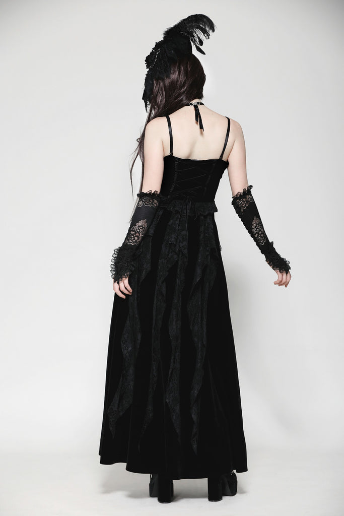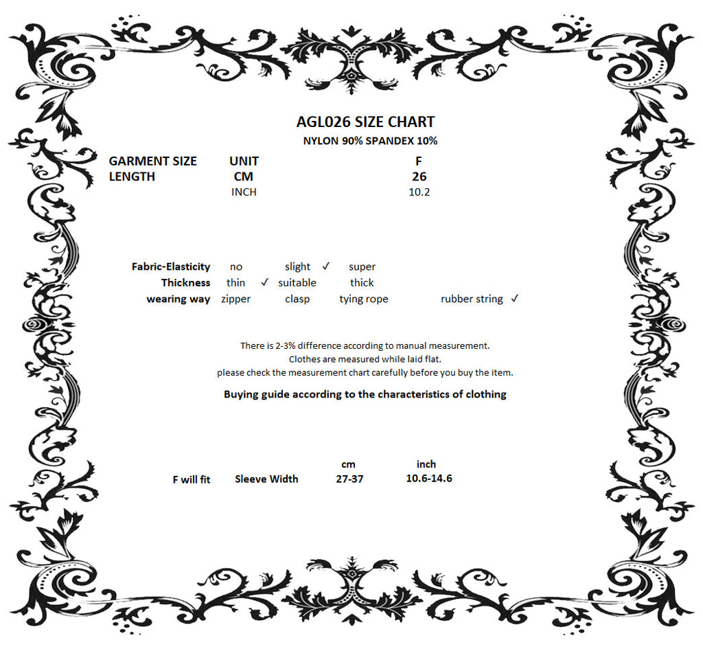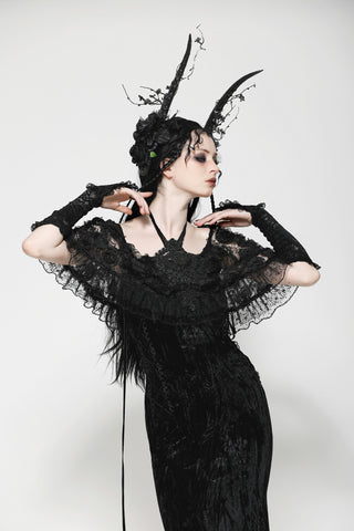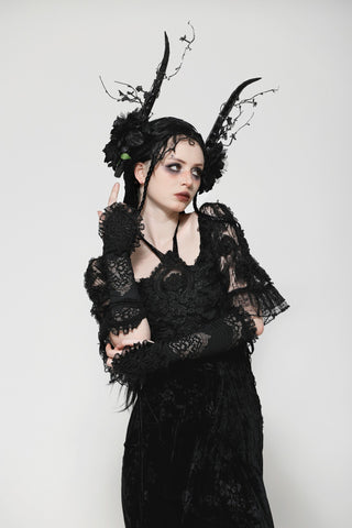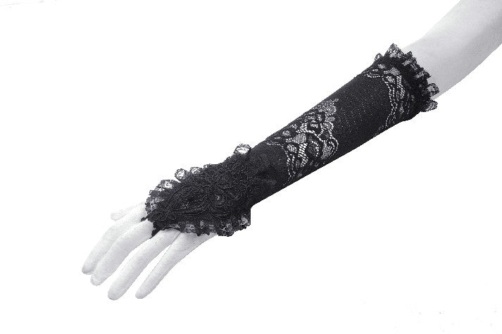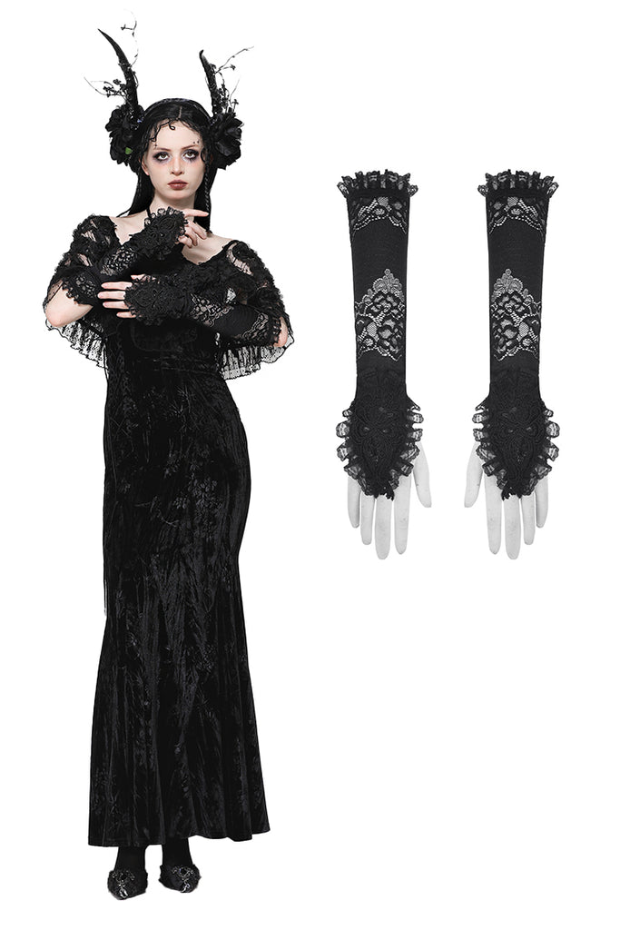 These romantic Gothic lace gloves feature intricate embroidery on the back of the hand, surrounded by layers of delicate ruffles, creating a sophisticated and dimensional look. The shirred design above the wrist enhances the silhouette, elongating the arms elegantly. Made from stretchy lace, the gloves are comfortable to wear and perfect for pairing with a variety of dresses, capturing the essence of Gothic romance and mystique.