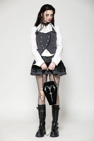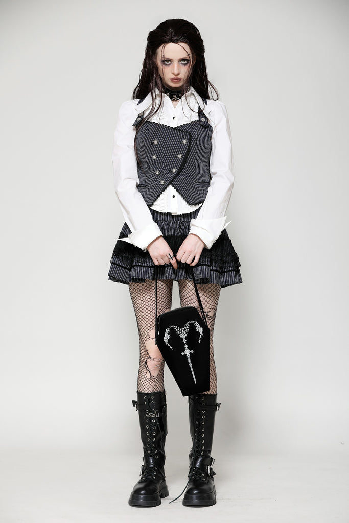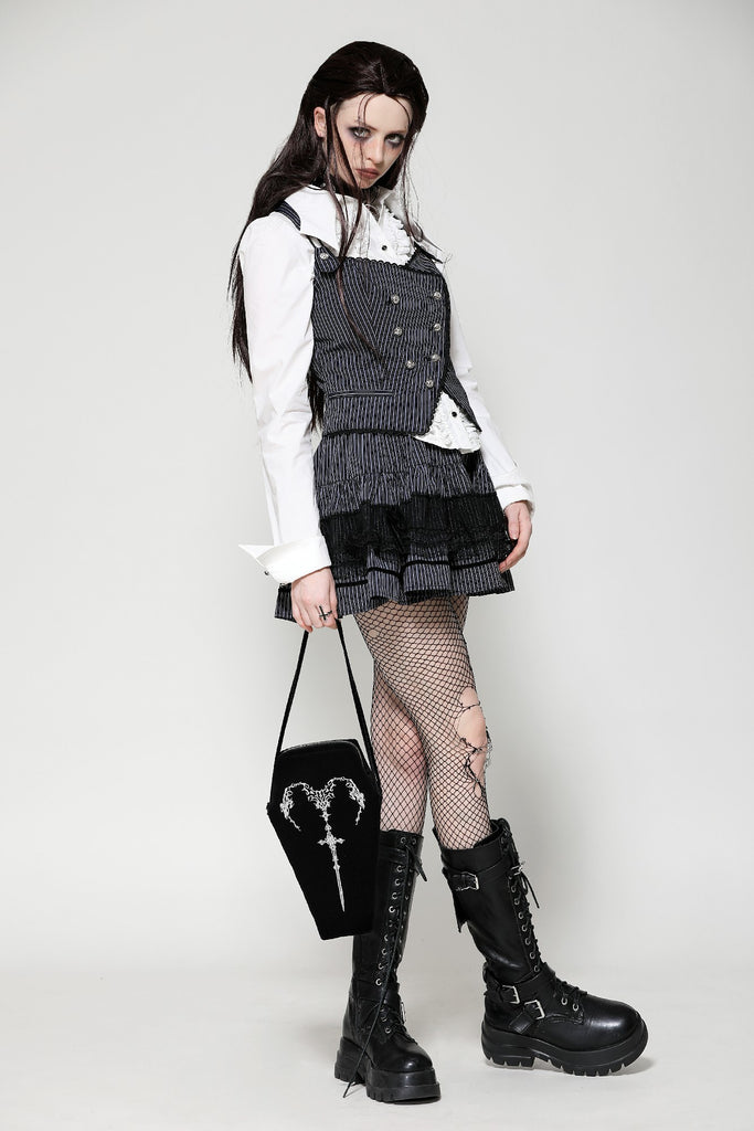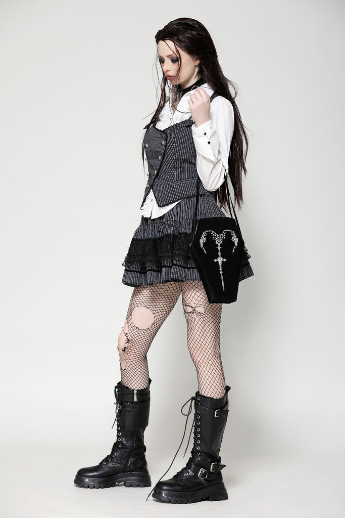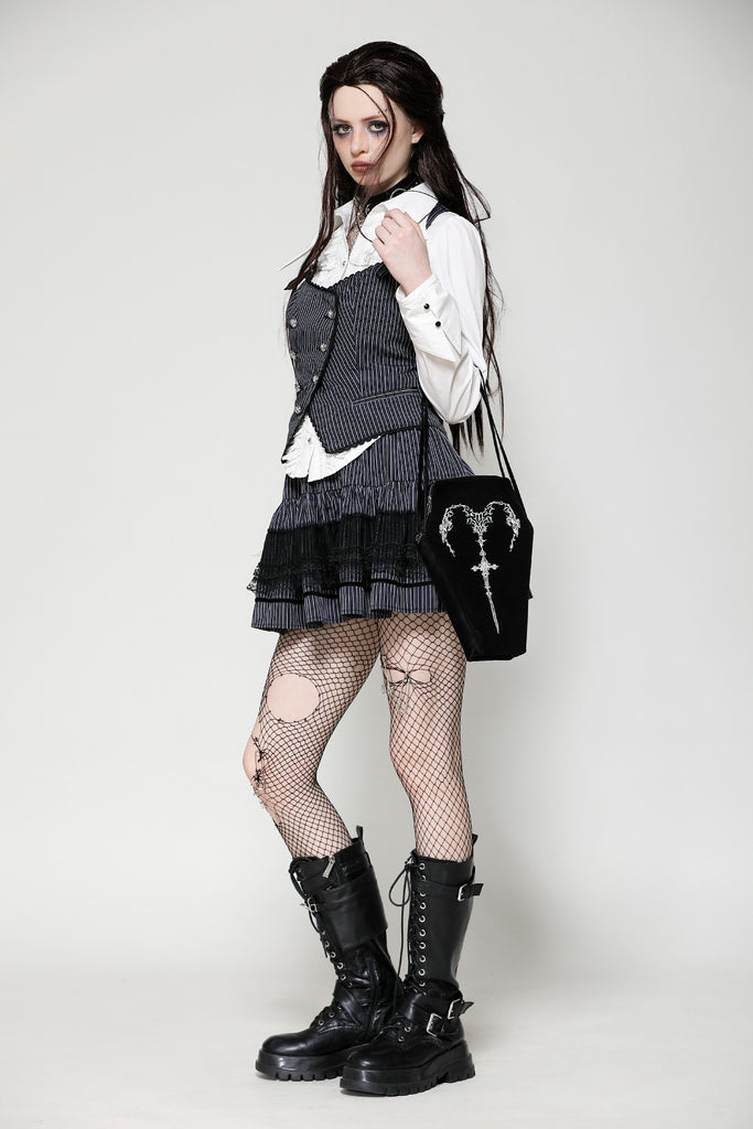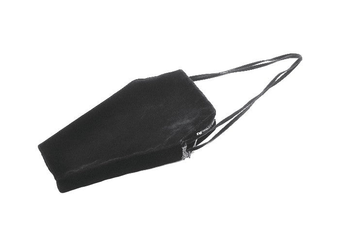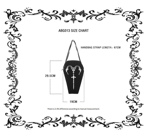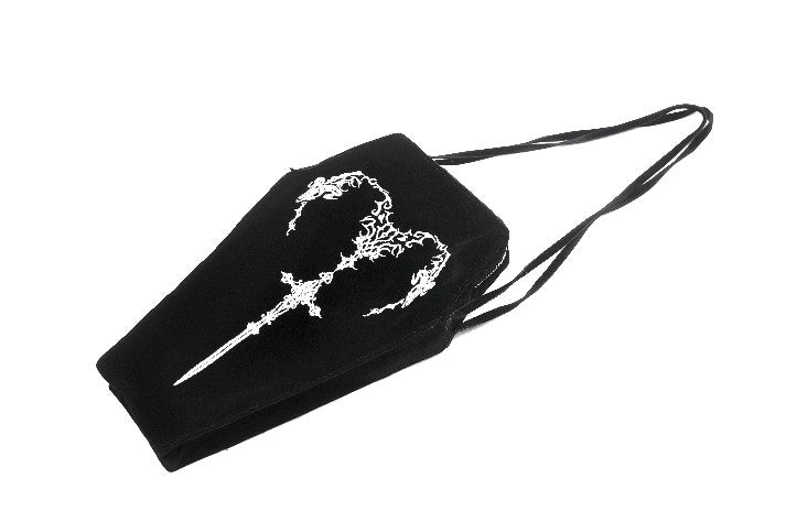 This bag features a unique coffin silhouette, embodying a strong gothic aesthetic. The intricate silver-threaded horn embroidery pairs beautifully with the velvet texture, exuding both mystery and elegance. Designed for both shoulder and hand carry, the silver metal zipper complements the embroidered details, adding a touch of sophistication.