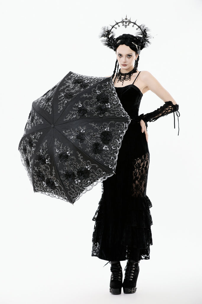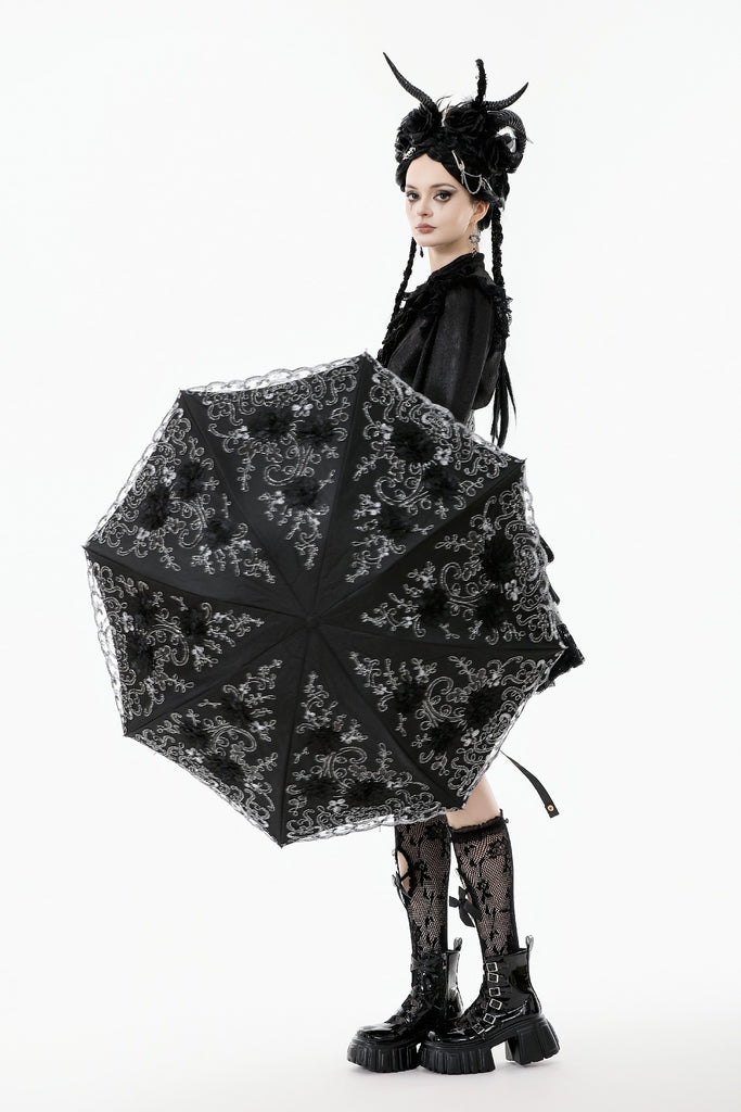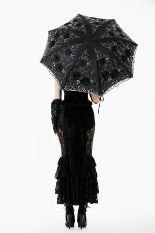 This Lolita-style luxurious parasol features a double-layer design: the outer layer is delicate embroidered mesh for a dreamy, elegant touch, while the inner layer is a practical sunshade fabric with UV protection. The umbrella folds into three sections, making it easy to carry while combining practicality with a decorative appeal. Perfect for daily outings, photoshoots, or special gatherings, it highlights a sweet and romantic Lolita aesthetic.