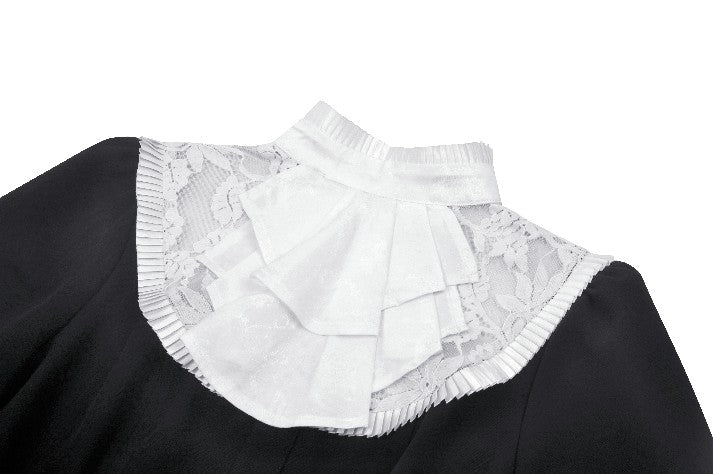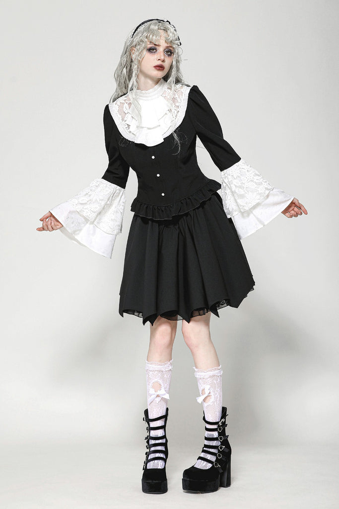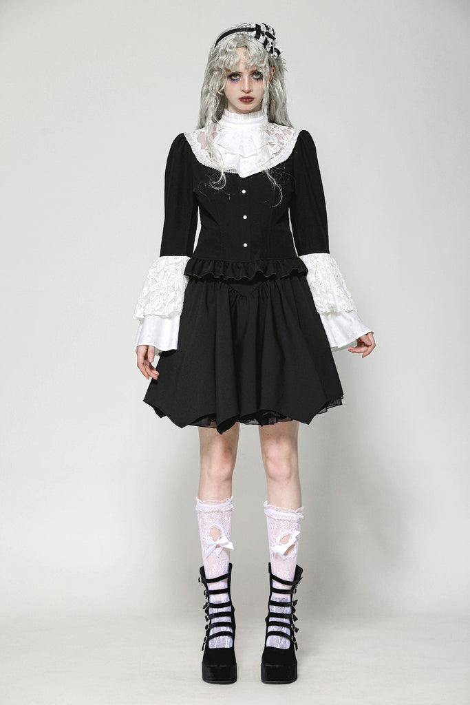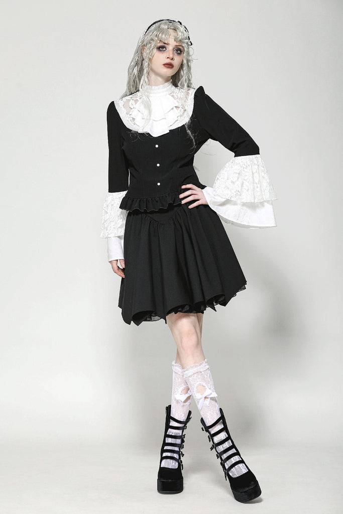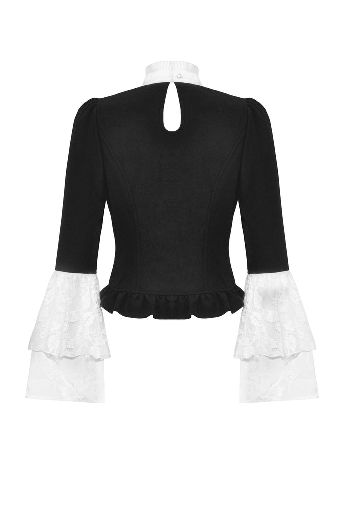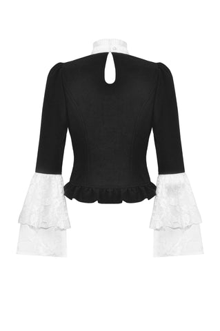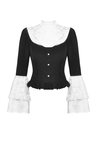 This blouse combines classic black and white for a refined Gothic style. The upper chest and sleeve overlays are adorned with lace, while the collar and cuffs feature white jacquard, adding soft, intricate layers to the design. A hidden side zipper ensures a fitted silhouette, and the front buttons enhance its vintage appeal.