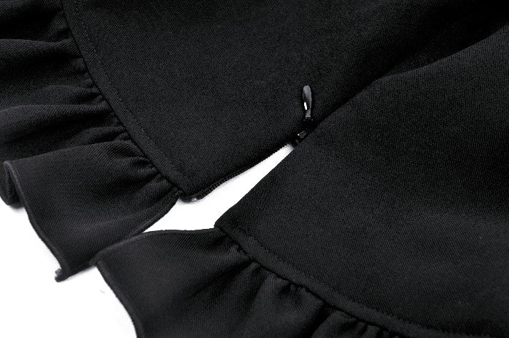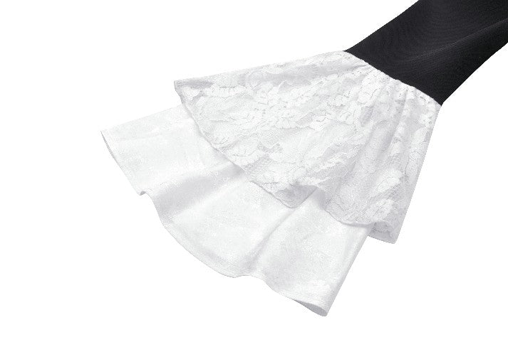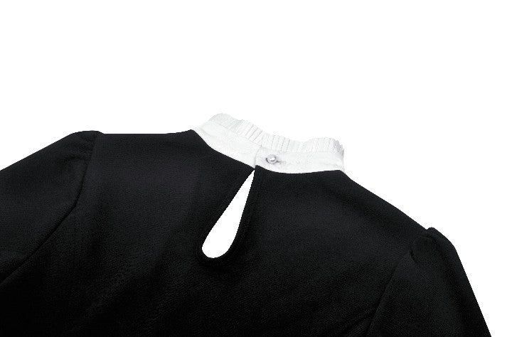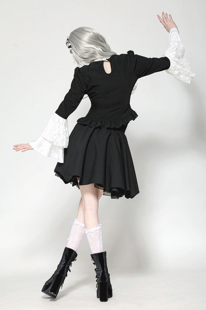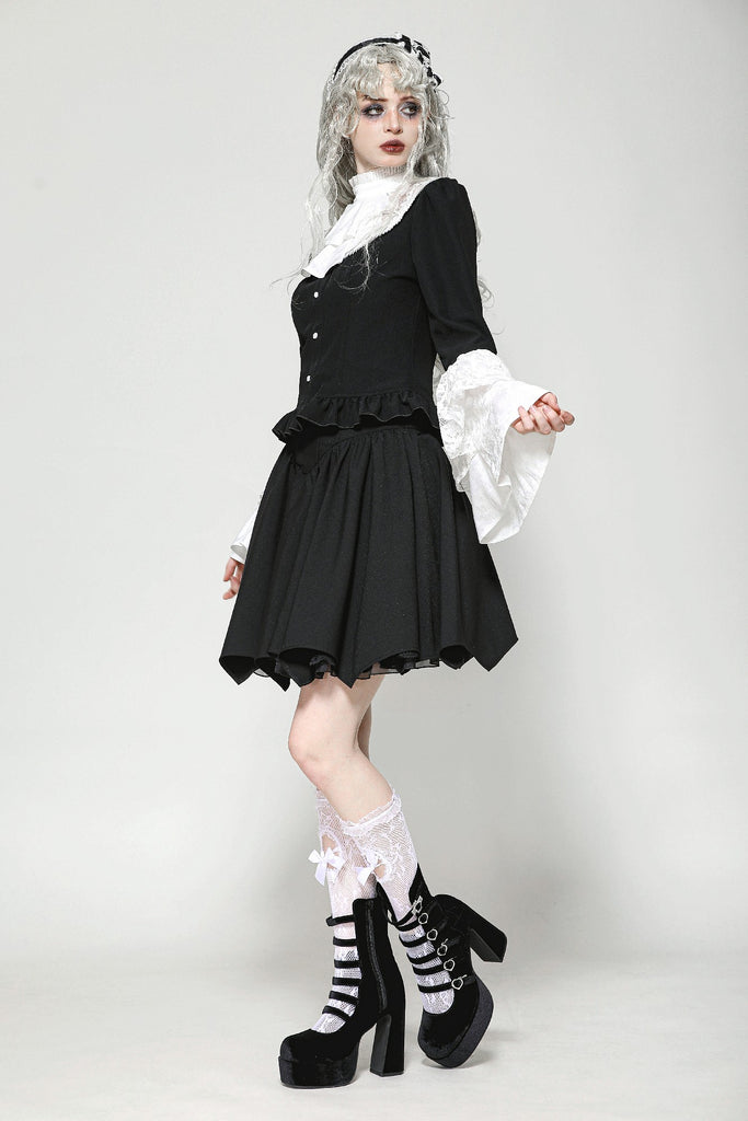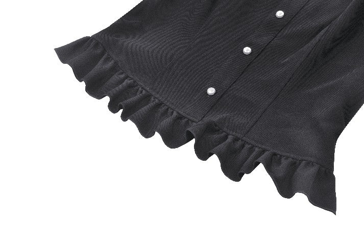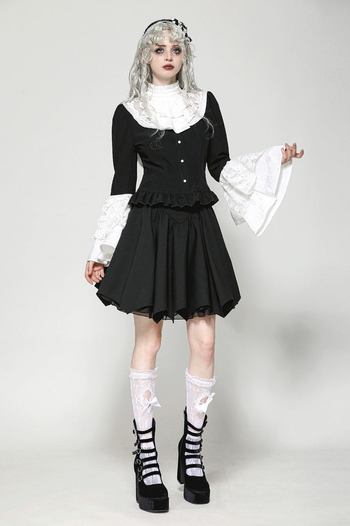 This blouse combines classic black and white for a refined Gothic style. The upper chest and sleeve overlays are adorned with lace, while the collar and cuffs feature white jacquard, adding soft, intricate layers to the design. A hidden side zipper ensures a fitted silhouette, and the front buttons enhance its vintage appeal.