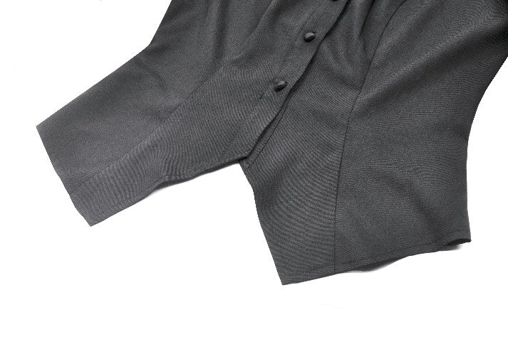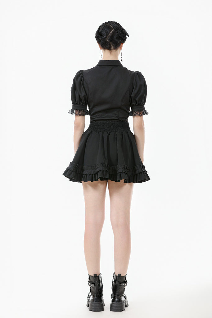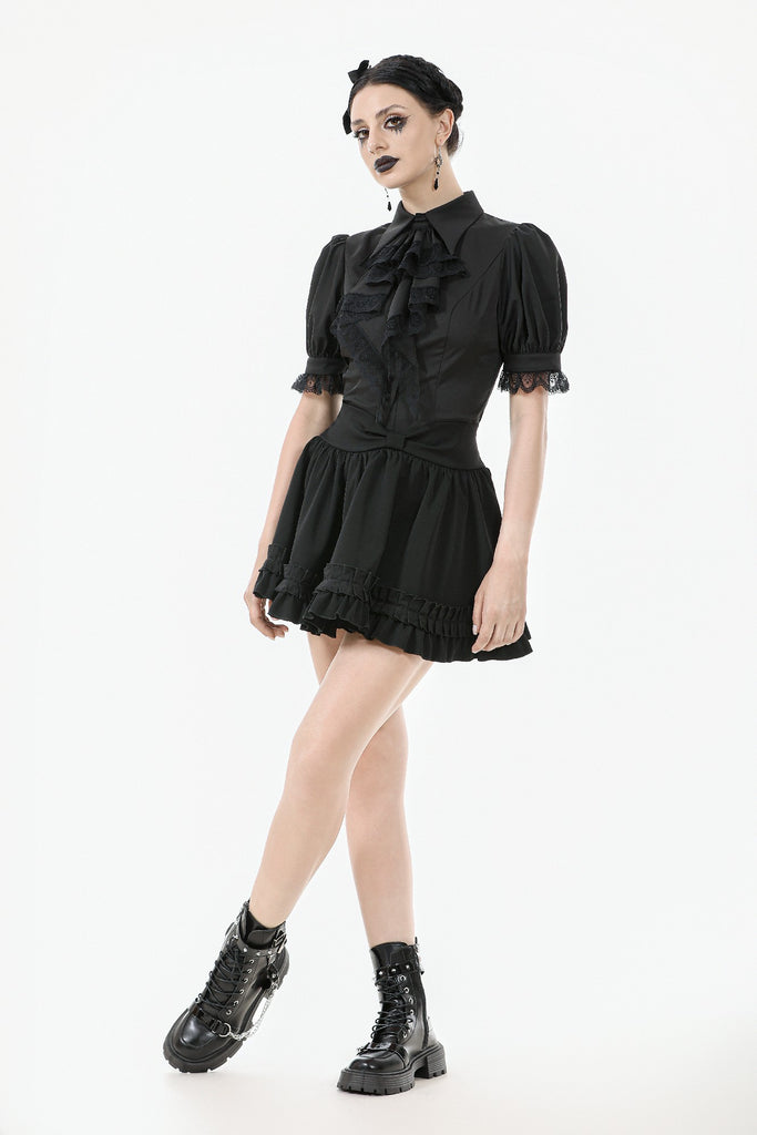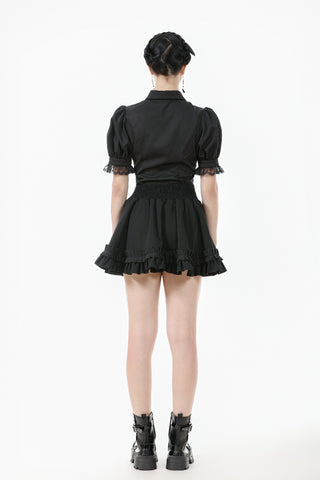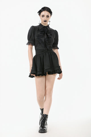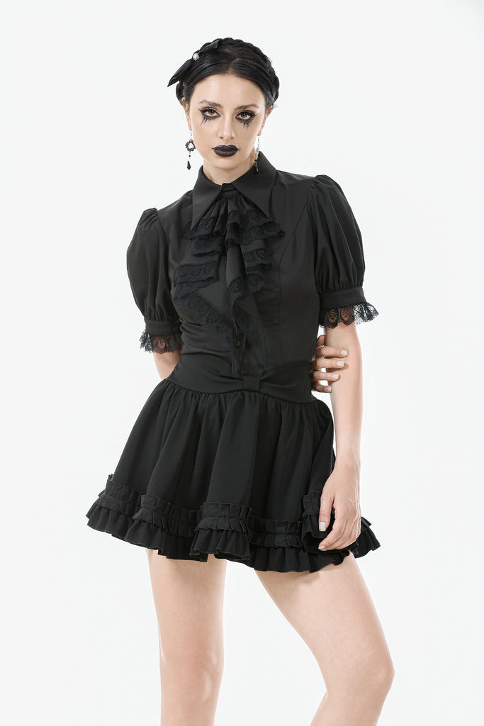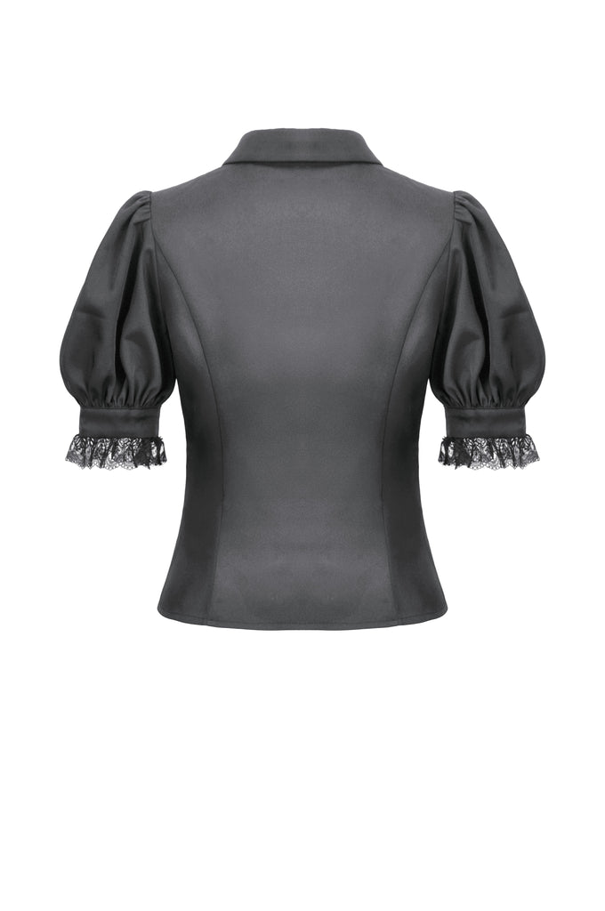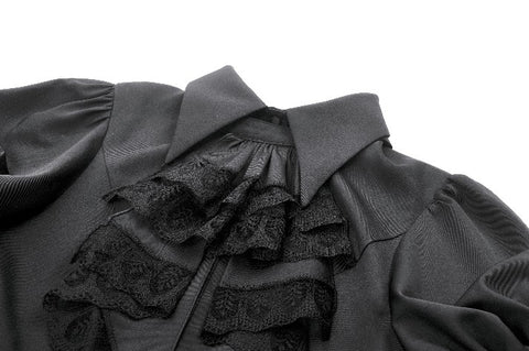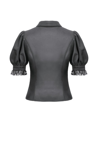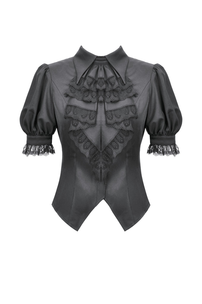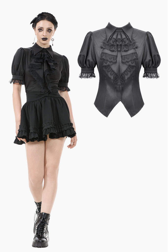 Structured with a sharp, body-hugging silhouette, this blouse merges gothic drama with courtly romance. The exaggerated pointed collar adds bold definition, while a detachable rosette cravat brings modular elegance. Beneath the cravat lies an openable inner layer, creating dimensional intrigue. Intricate princess seams meet a V-shaped lace panel reminiscent of regal embroidery. The sleeves and cravat are finished with delicate lace trim, softening the overall silhouette with dark femininity. Perfect for styling with high-waisted skirts or layered under corset dresses, this piece evokes the elegance of a gothic vampire maiden poised for midnight rendezvous.