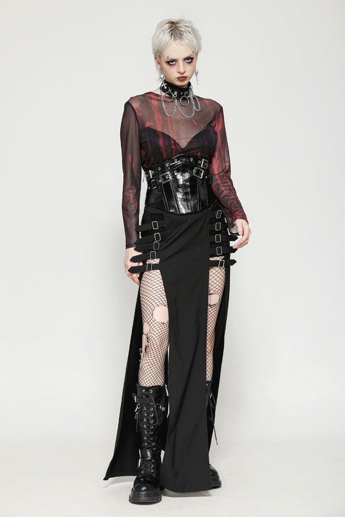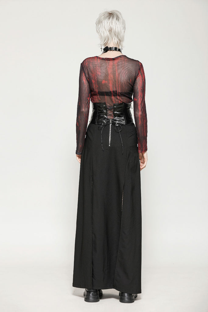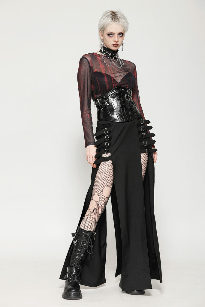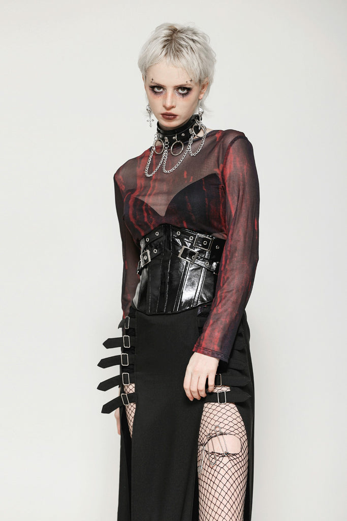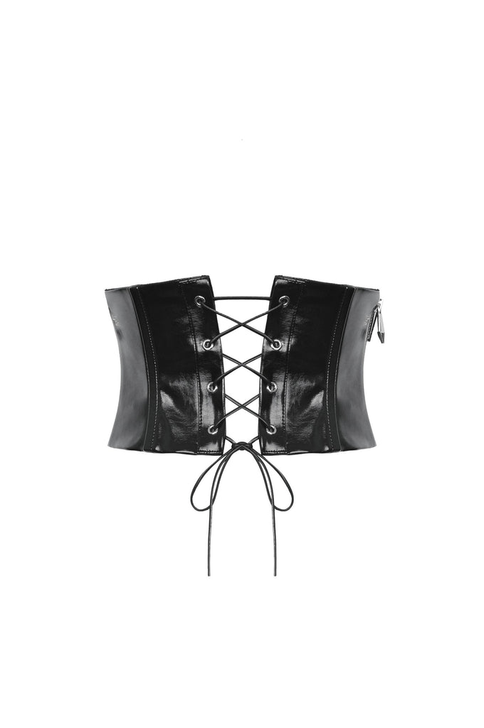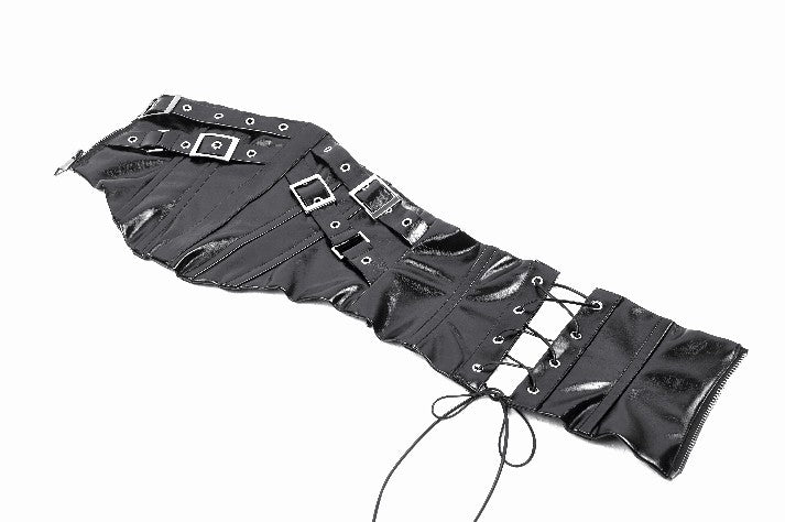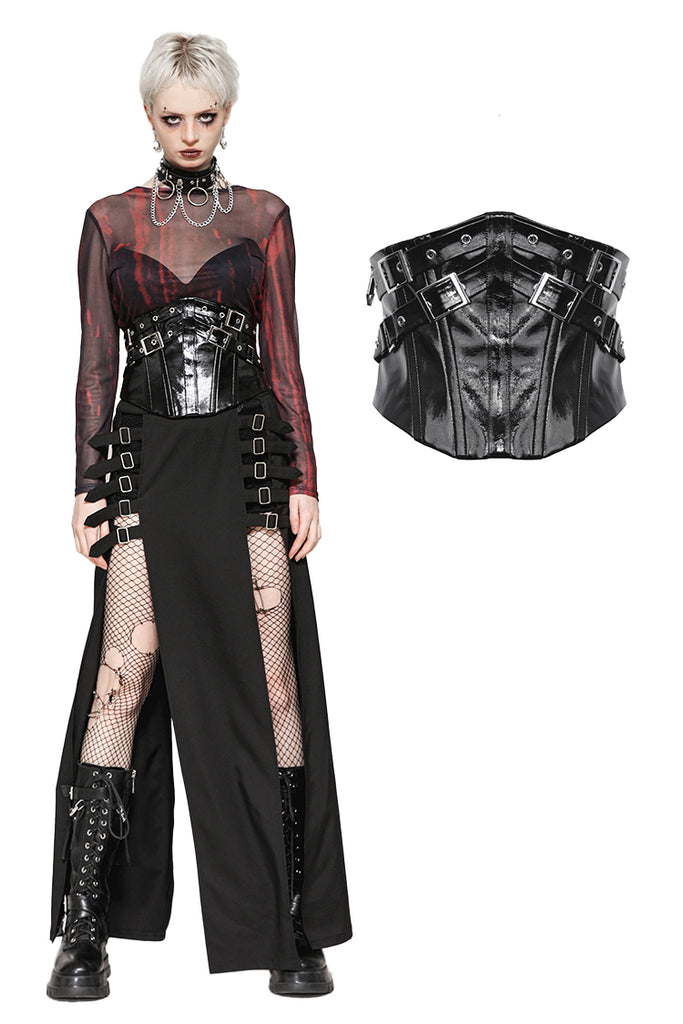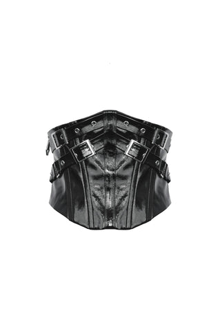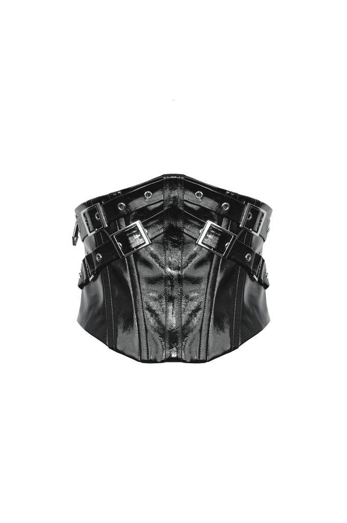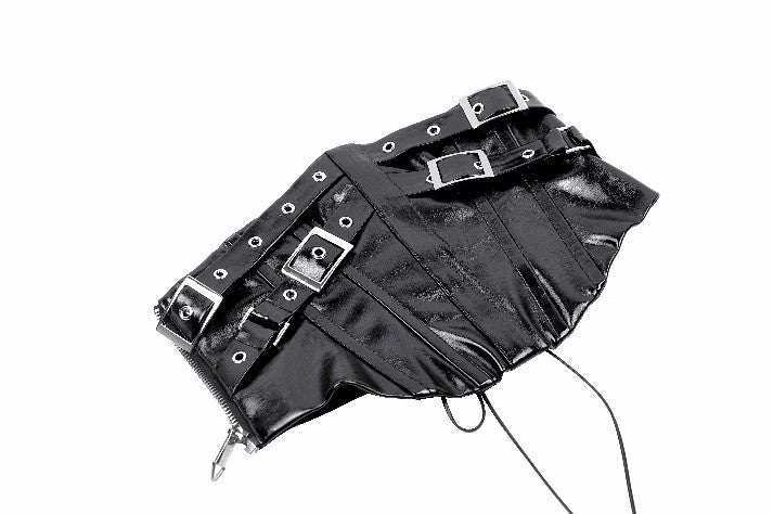 This punk waist corset, crafted from patent leather, features metal eyelets and buckle details, adding an intense and rebellious vibe. The back is equipped with adjustable metal lacing, enhancing the cold, mechanical aesthetic. Ideal for punk-inspired outfits or unique styling, this piece delivers a bold statement of style and attitude.