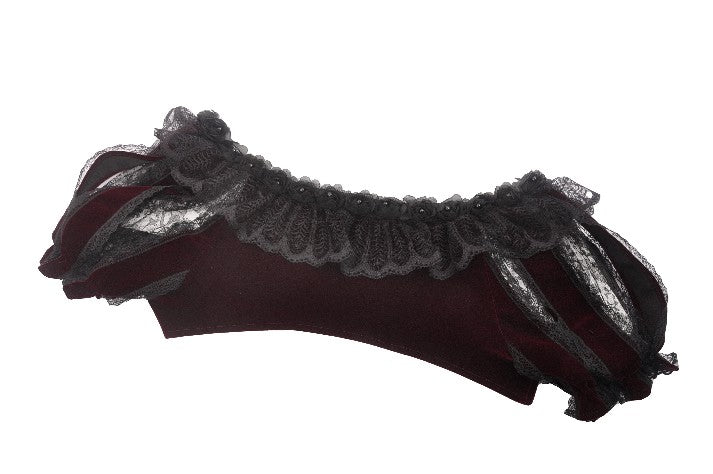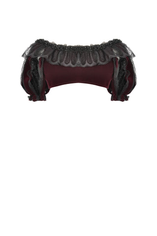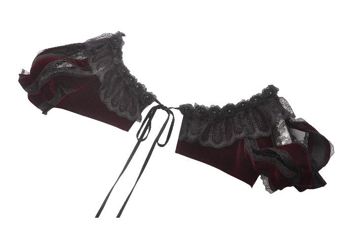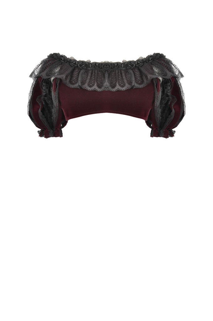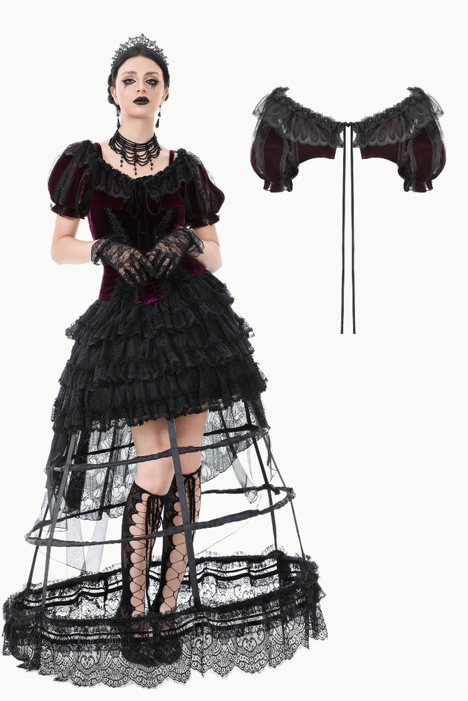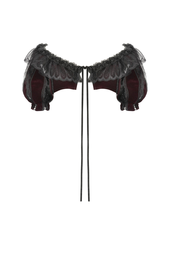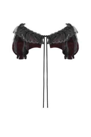 A fusion of black lace and deep red velvet, this capelet embodies the elegance of a rose blooming in the midnight mist. The delicately beaded roses adorning the shoulders whisper tales of nobility and mystery, while layered lace trimmings frame the silhouette with a romantic touch. Sheer black lace cuffs add an ethereal allure, contrasting beautifully against the structured red velvet strips, each meticulously edged with lace to enhance its regal aesthetic. The central ribbon tie allows for adjustable styling, offering both a refined fit and a dynamic sense of movement.