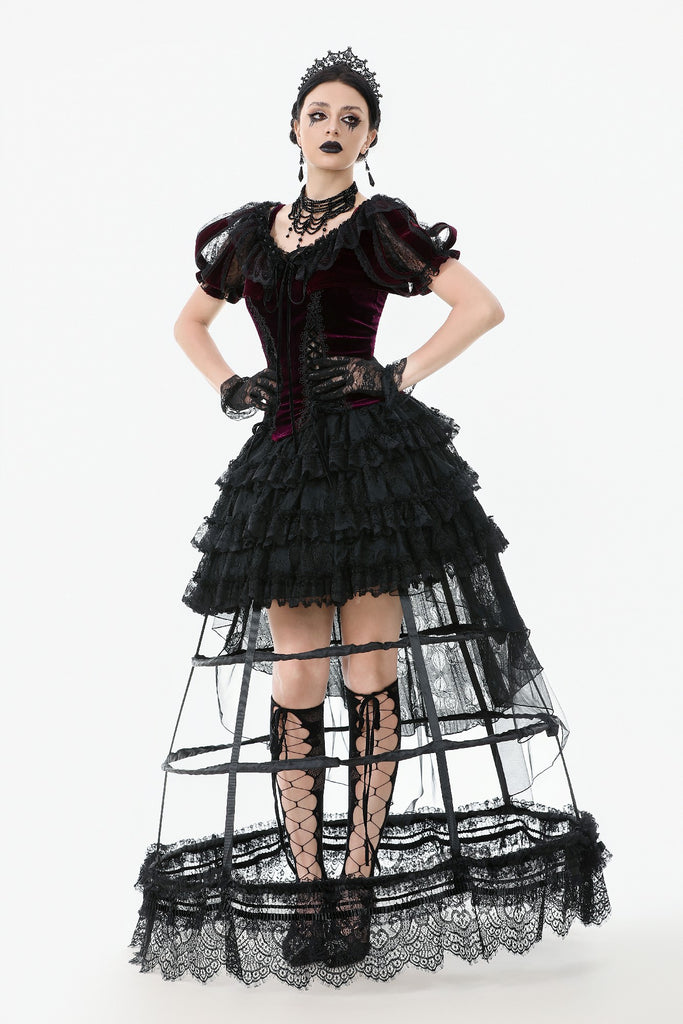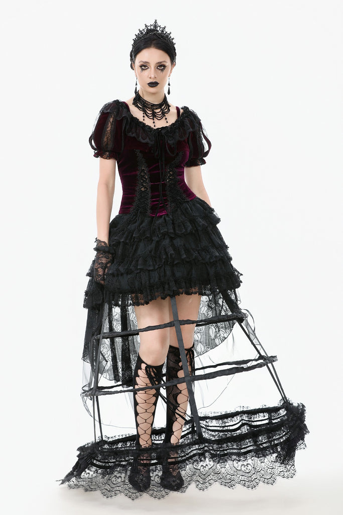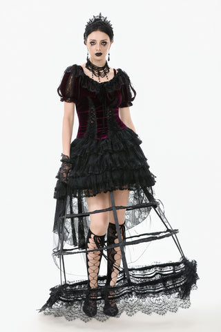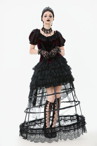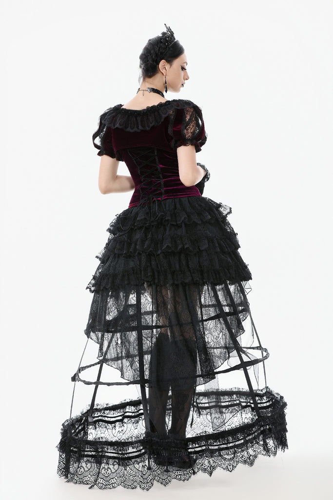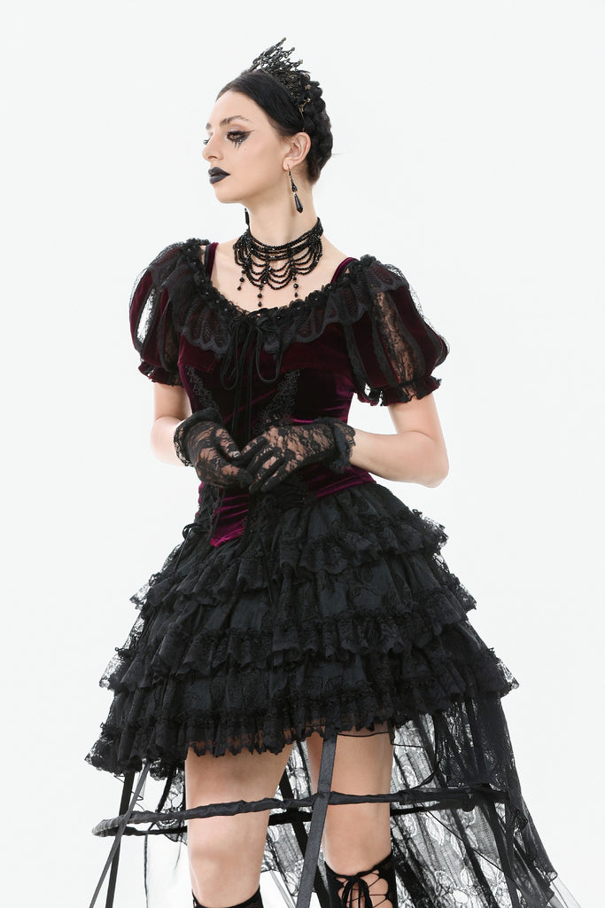 A fusion of black lace and deep red velvet, this capelet embodies the elegance of a rose blooming in the midnight mist. The delicately beaded roses adorning the shoulders whisper tales of nobility and mystery, while layered lace trimmings frame the silhouette with a romantic touch. Sheer black lace cuffs add an ethereal allure, contrasting beautifully against the structured red velvet strips, each meticulously edged with lace to enhance its regal aesthetic. The central ribbon tie allows for adjustable styling, offering both a refined fit and a dynamic sense of movement.