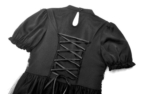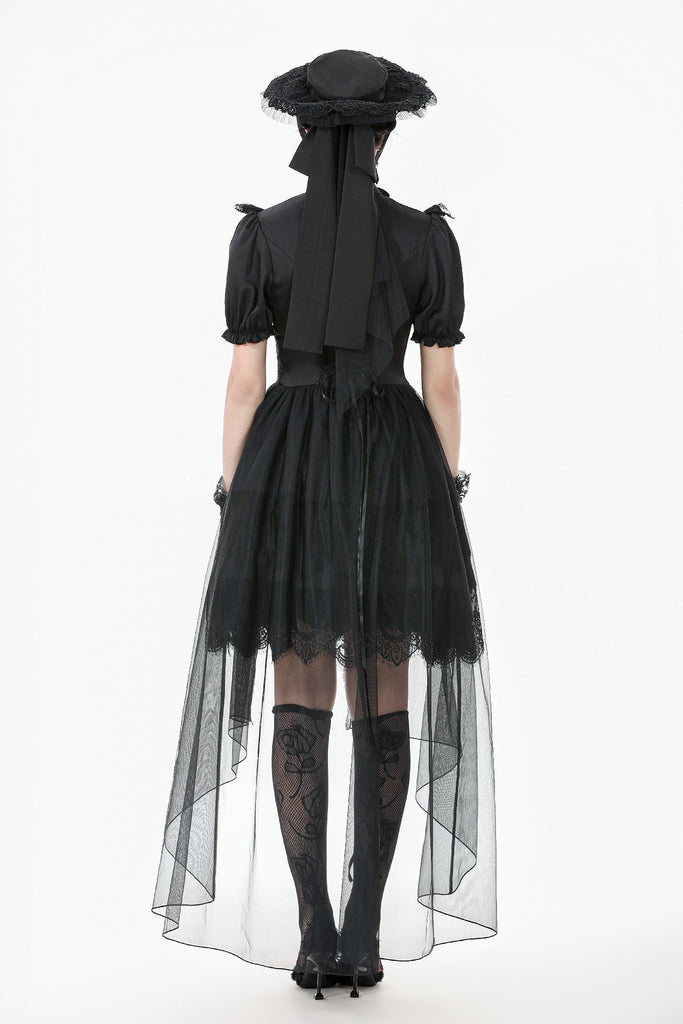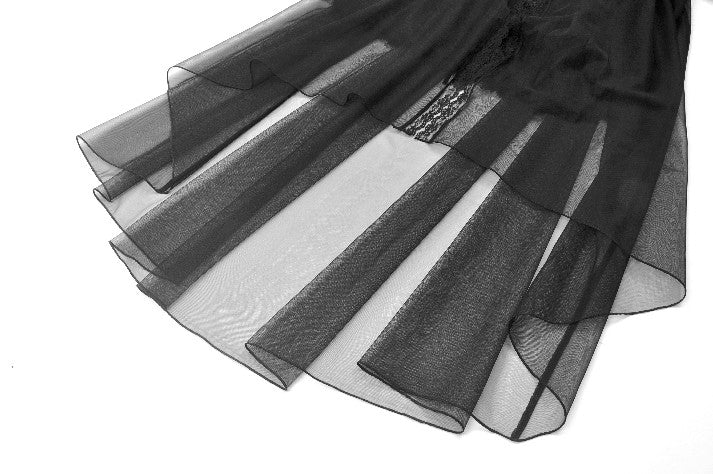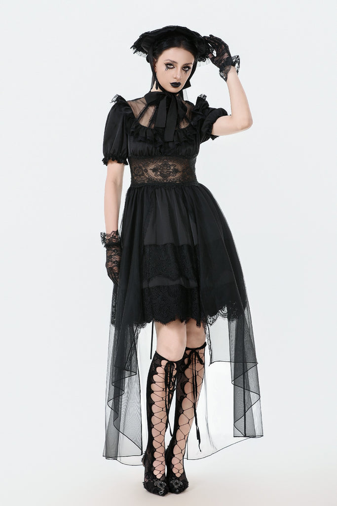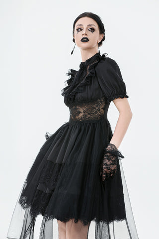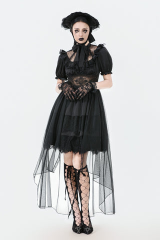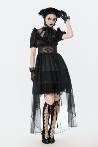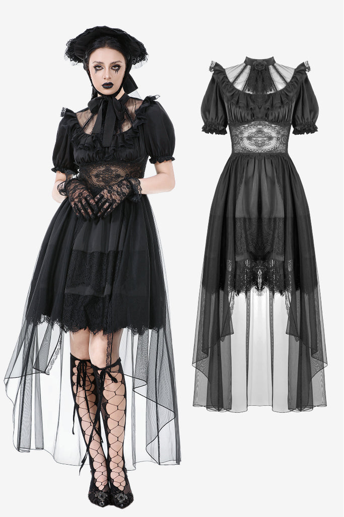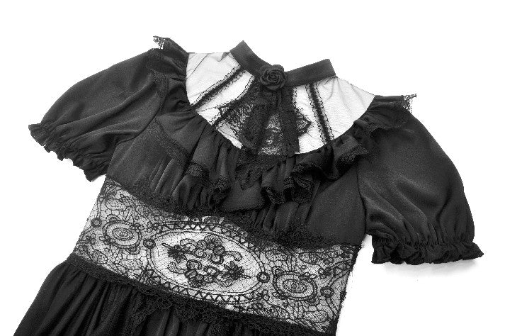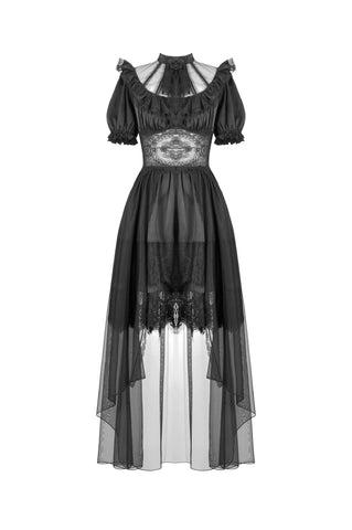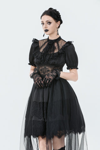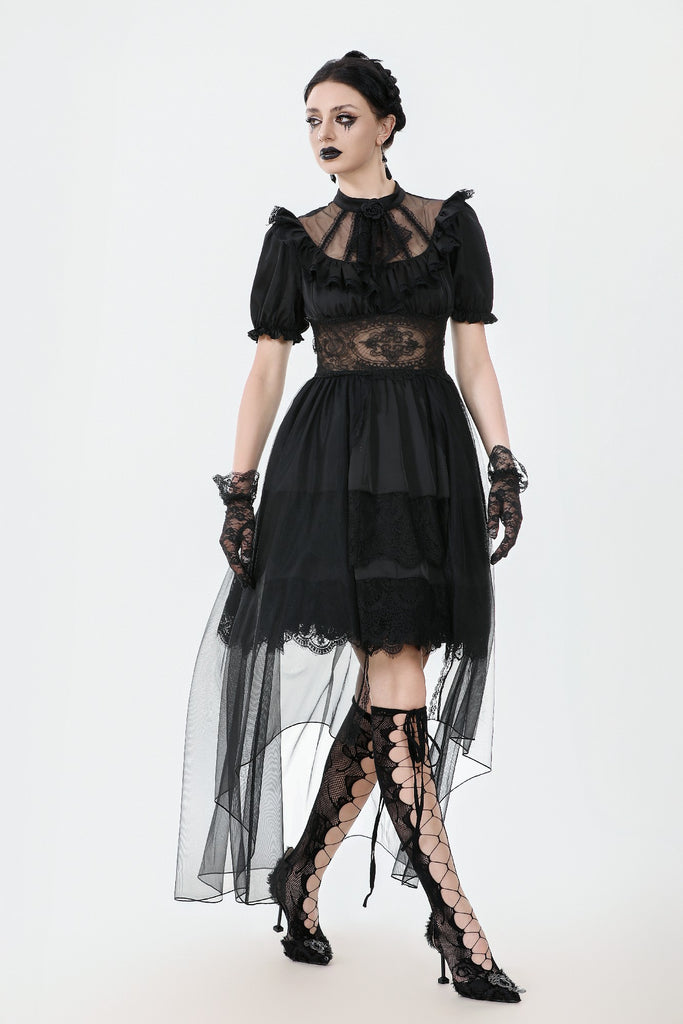 A noble fusion of a high collar and delicate ruffled neckline creates a vintage aristocratic aura. The sheer mesh panel at the chest adds an air of mystique, adorned at the center with a sculpted rose for a touch of romantic elegance. The waist features a lace cutout, subtly accentuating the curves with a sensual charm. The double-layered skirt design showcases intricate eyelash lace on the inner layer, adding gothic sophistication, while the outer layer cascades in flowing mesh, extending to a floor-length silhouette that drifts with every movement—an ethereal vision of gothic grace.