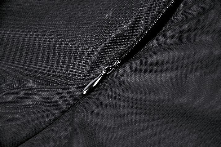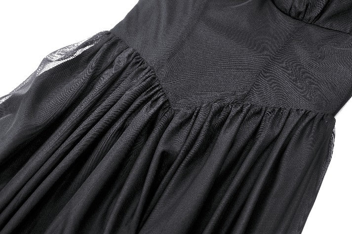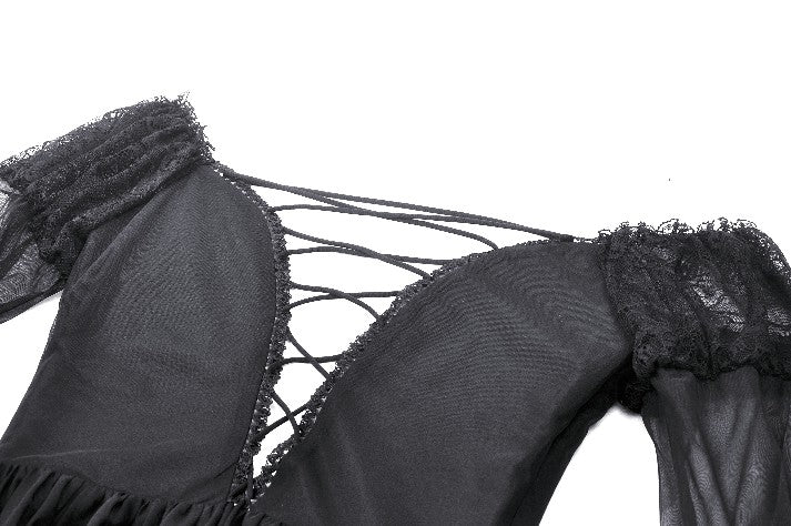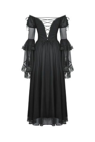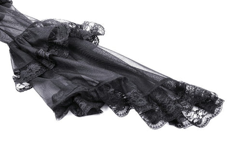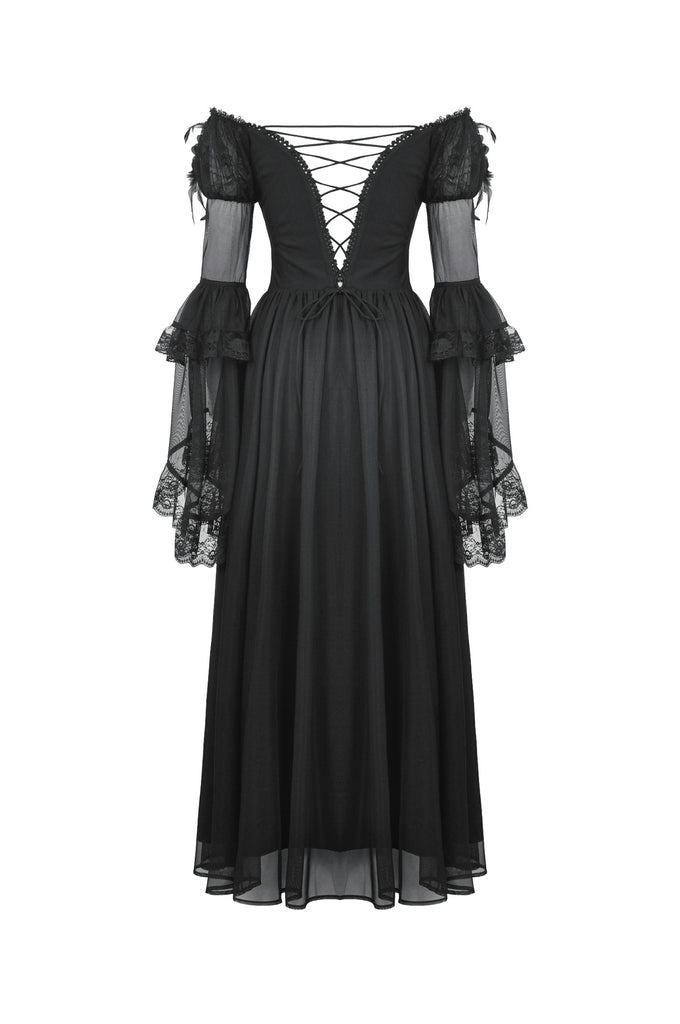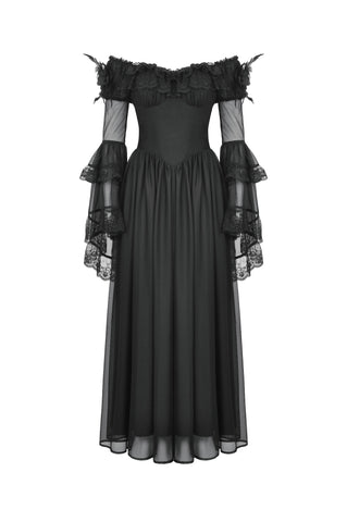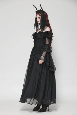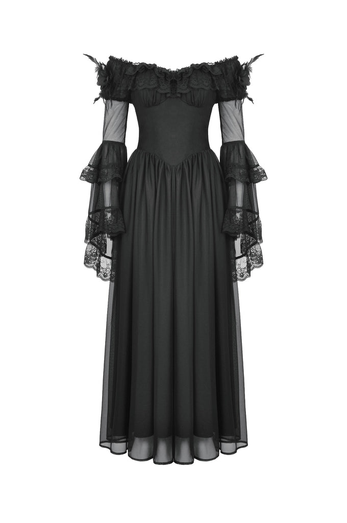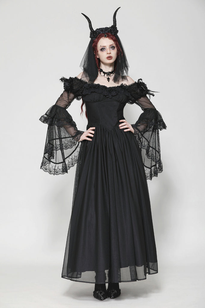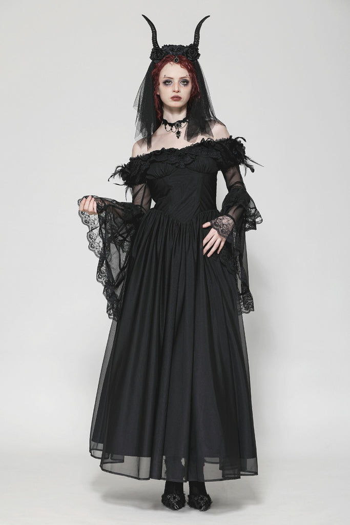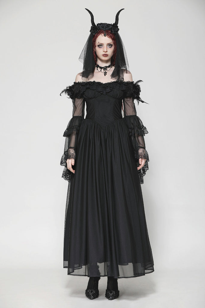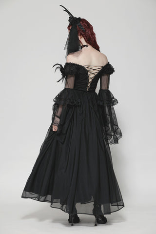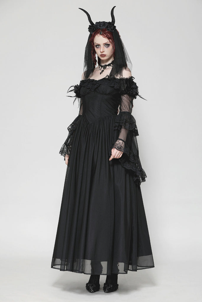 This Gothic gown features a dreamy black tulle fabric that creates a mysterious and ethereal ambiance. The off-shoulder design is adorned with feathered floral accents, enhancing the elegance of the shoulders. The wide cuffs are gathered and trimmed with delicate lace, offering a perfect blend of elegance and romance. This gown embodies the fantasy and allure of Gothic fashion.