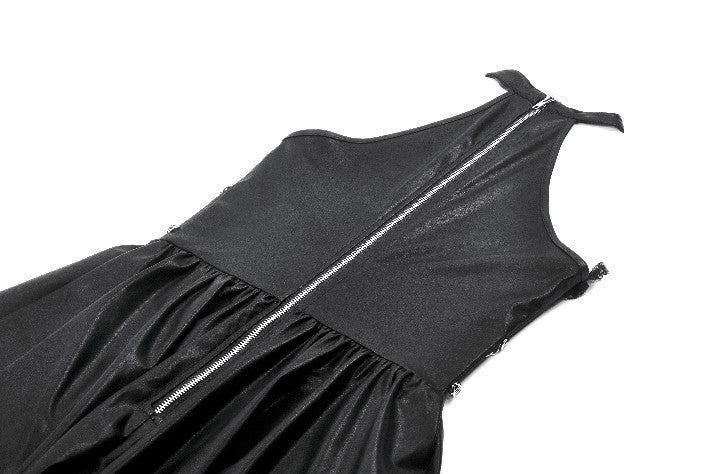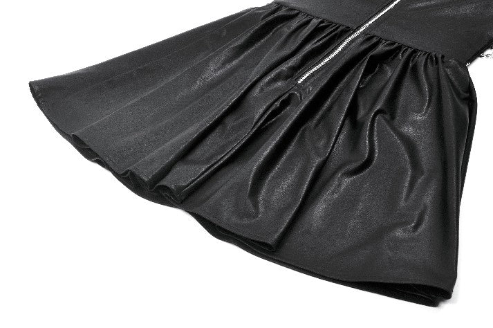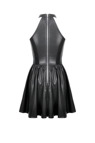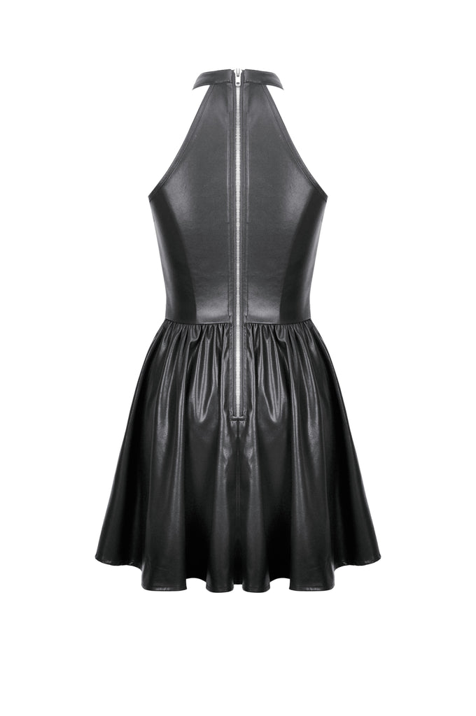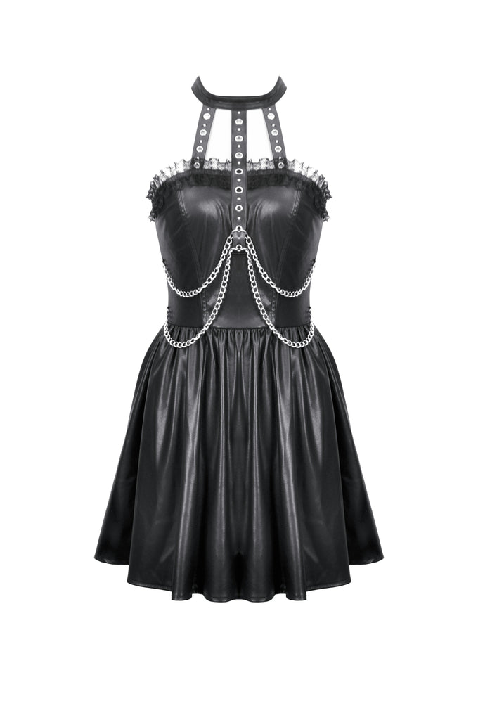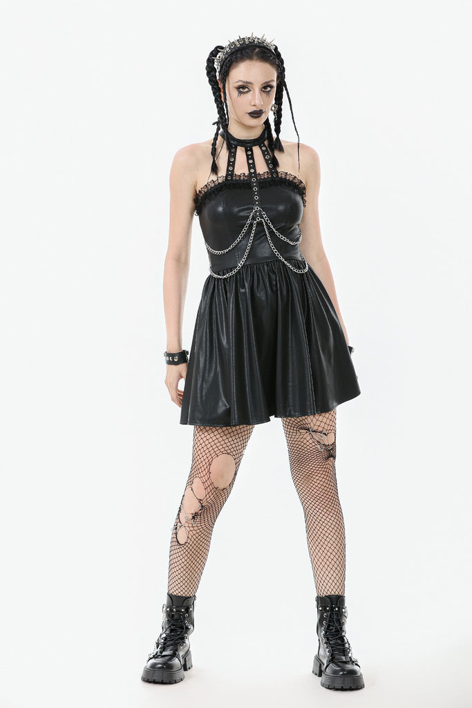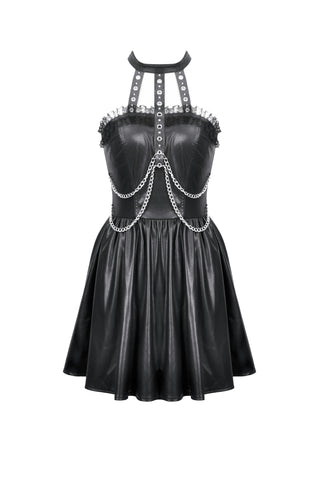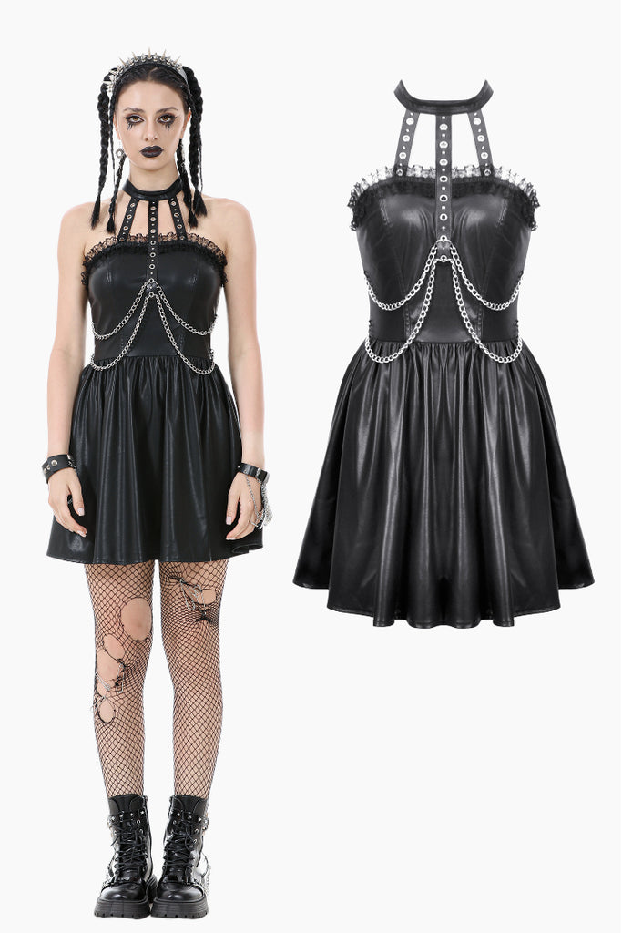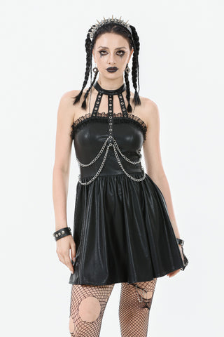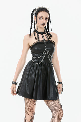 A vision of dominance and allure. This halter leather dress features three bold eyelet straps rising to the neck, anchored by four gleaming silver chains — a cold embrace of control and seduction.