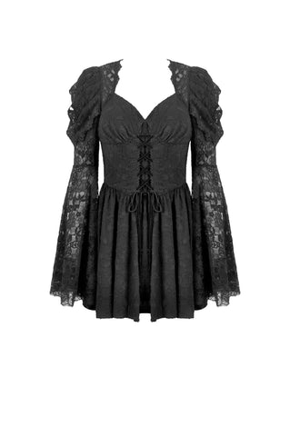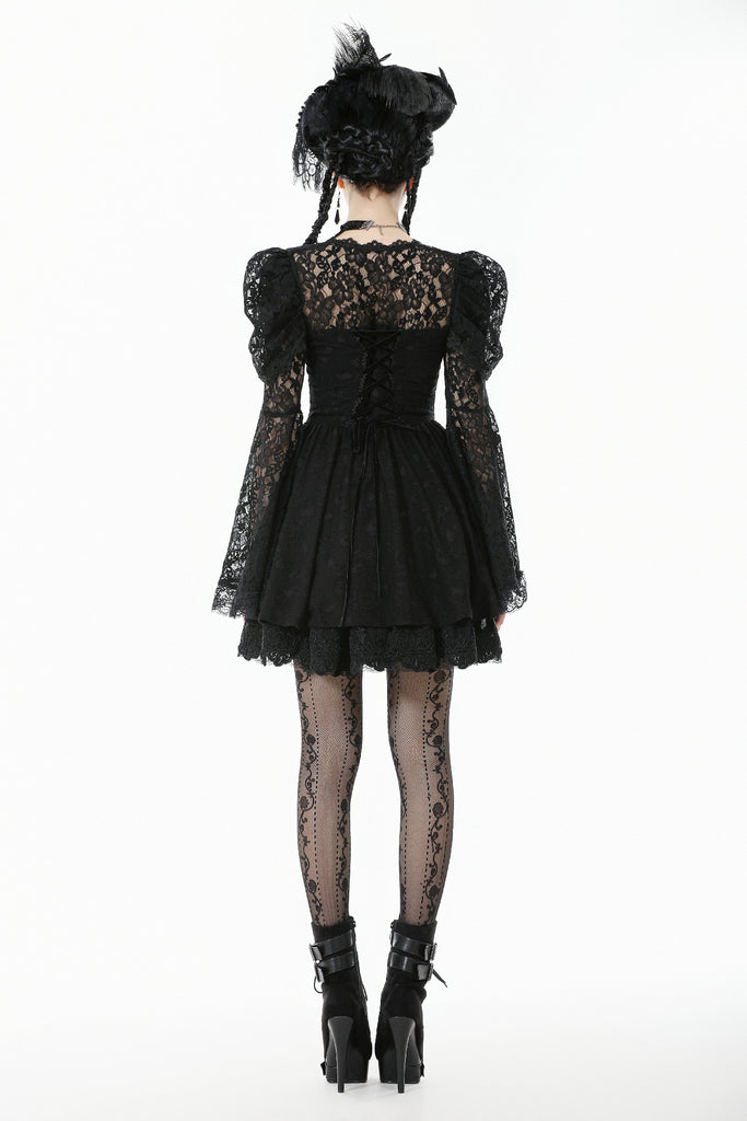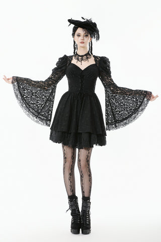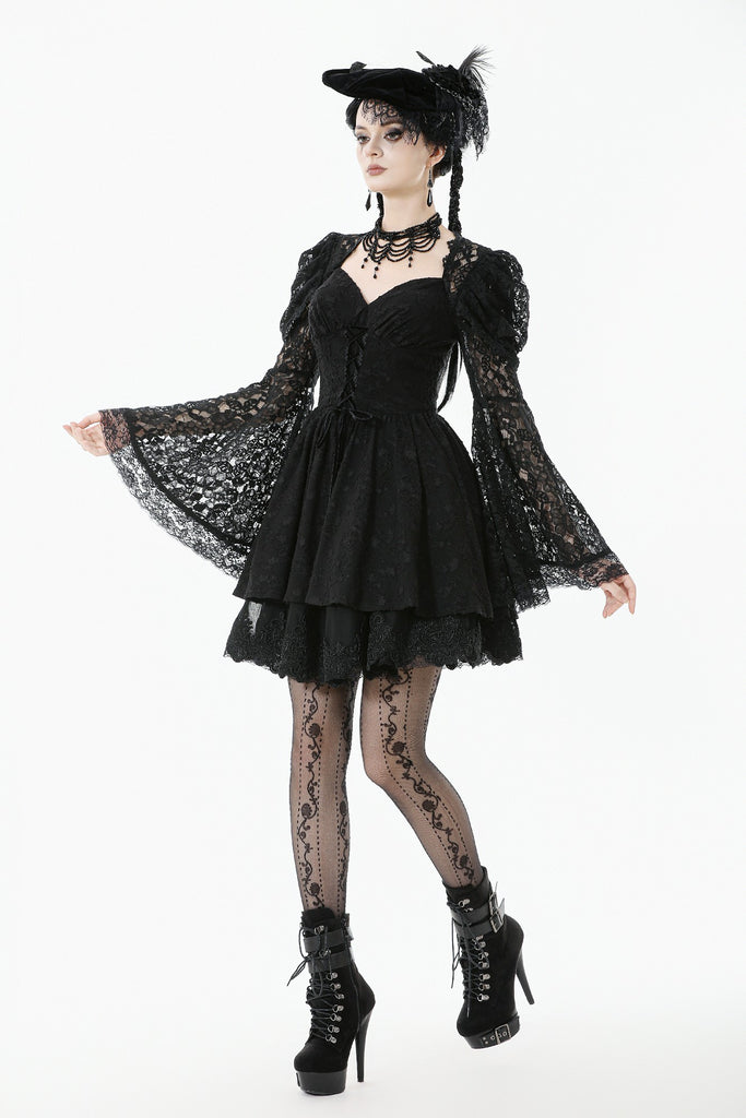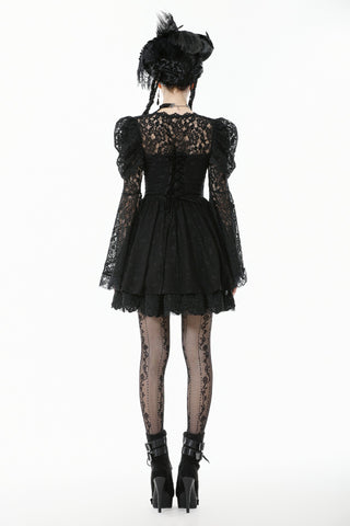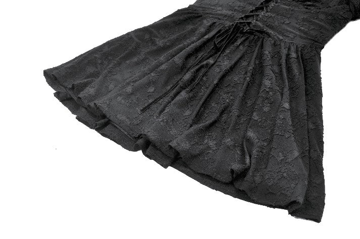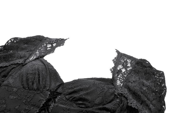 This Gothic lace dress is crafted from luxurious jacquard fabric, offering a refined vintage look. The strapless design highlights the silhouette, while delicate lace trims adorn the neckline, puff sleeves, and cuffs for a touch of romantic elegance. The lace-up back allows adjustable fitting, ensuring both comfort and a flattering shape. A perfect blend of Gothic charm and graceful femininity.