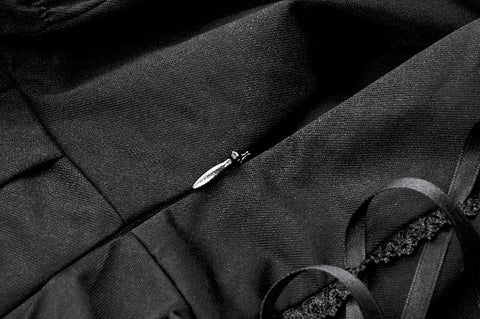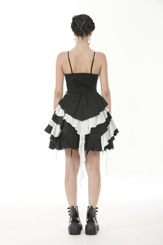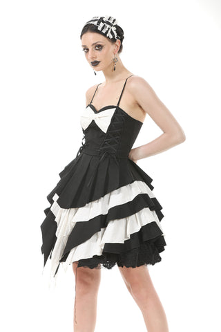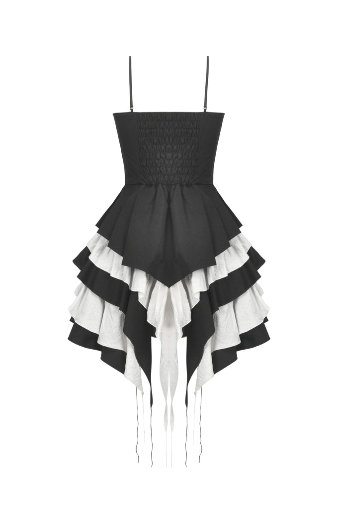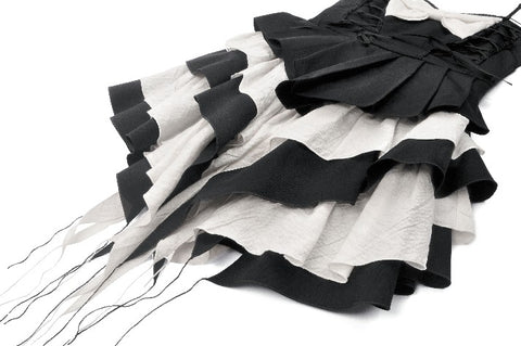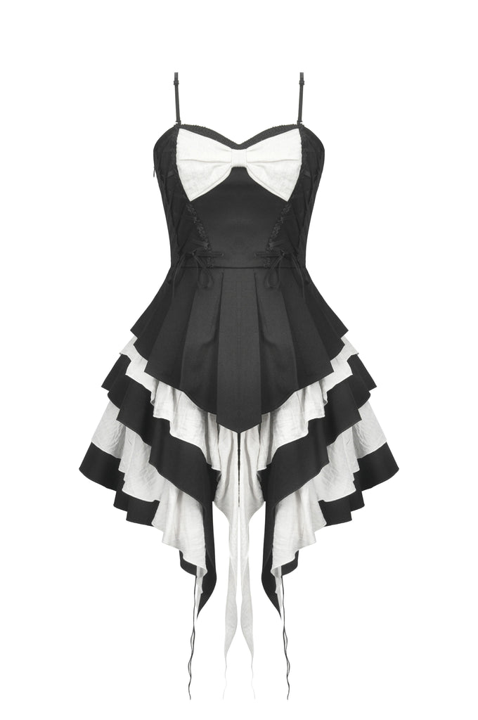 A mesmerizing interplay of black and white, the Nocturne Banquet dress captures the essence of gothic romance. The strapless corset-style bodice highlights the collarbone, with adjustable side laces adding a structured yet delicate touch. A white bow adorns the chest, like moonlight piercing through the night. The layered pleated skirt forms a dramatic silhouette, while the asymmetrical black-and-white lower hem flows like the wings of a nocturnal raven. Elegant yet bold, this dress is perfect for a darkly enchanting soirée.