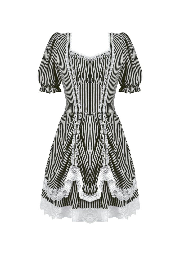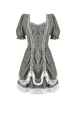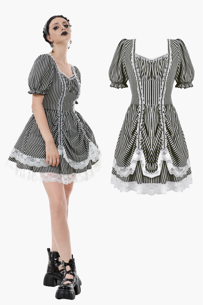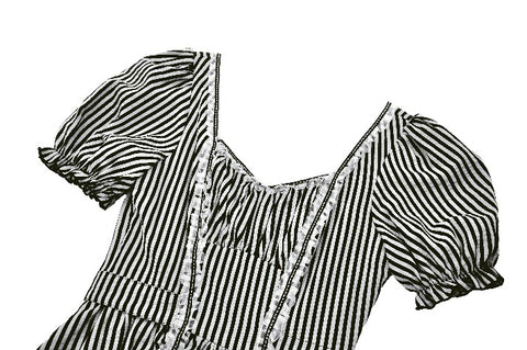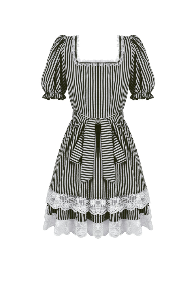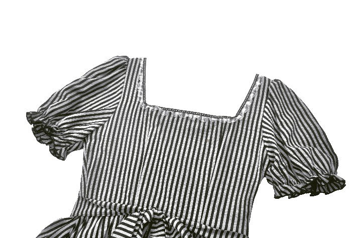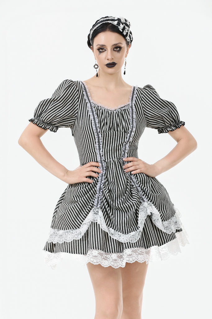 Like the opening act of a midnight circus, bold black-and-white stripes create an enchanting contrast of mystery and vintage charm. The ruched bodice adds texture, while delicate lace trims gracefully cascade along the hem, evoking a spectral elegance. Puff sleeves lend a touch of playfulness, while a striped fabric corset tie at the back cinches the waist for a structured yet ethereal silhouette. This is more than just a dress—it’s a darkly whimsical fairytale waiting to unfold.