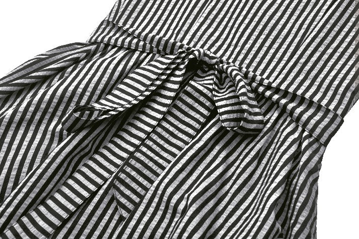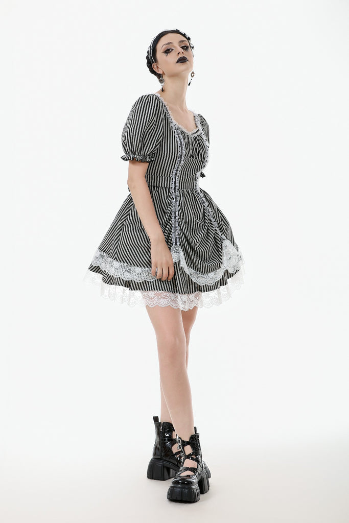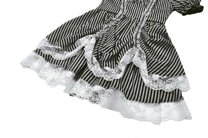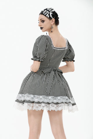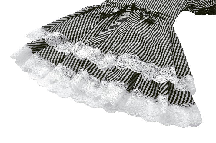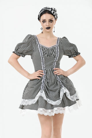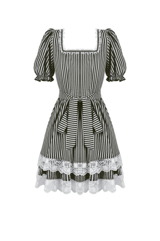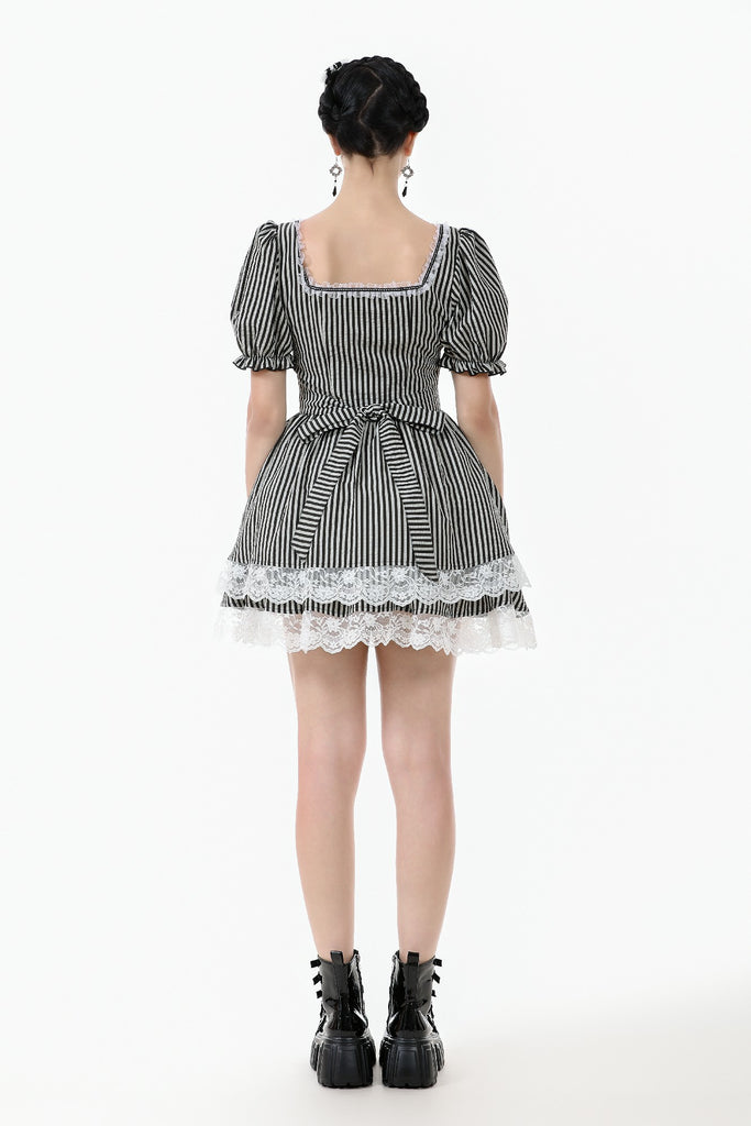 Like the opening act of a midnight circus, bold black-and-white stripes create an enchanting contrast of mystery and vintage charm. The ruched bodice adds texture, while delicate lace trims gracefully cascade along the hem, evoking a spectral elegance. Puff sleeves lend a touch of playfulness, while a striped fabric corset tie at the back cinches the waist for a structured yet ethereal silhouette. This is more than just a dress—it’s a darkly whimsical fairytale waiting to unfold.