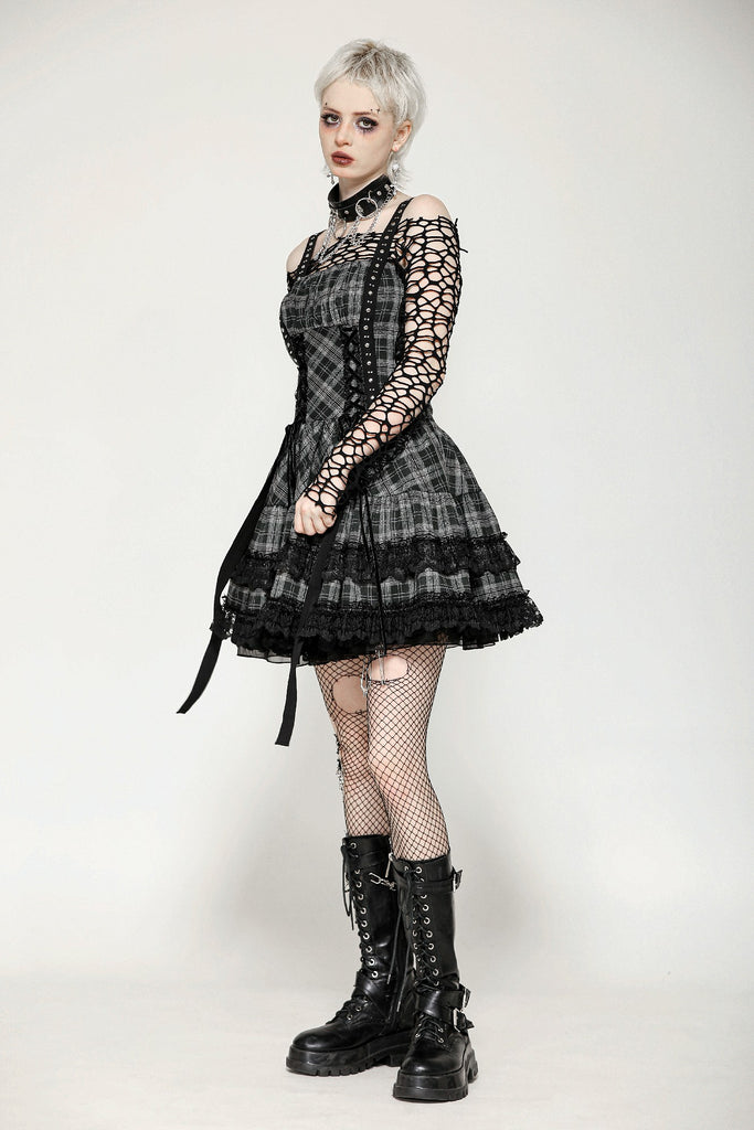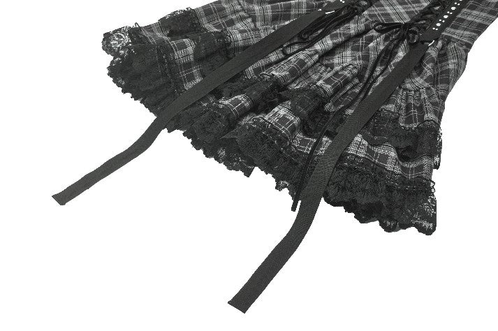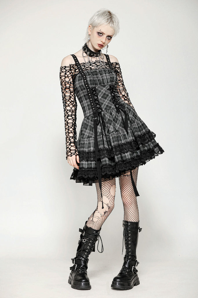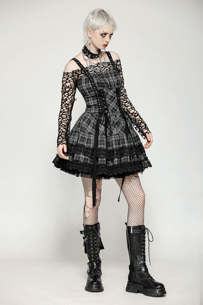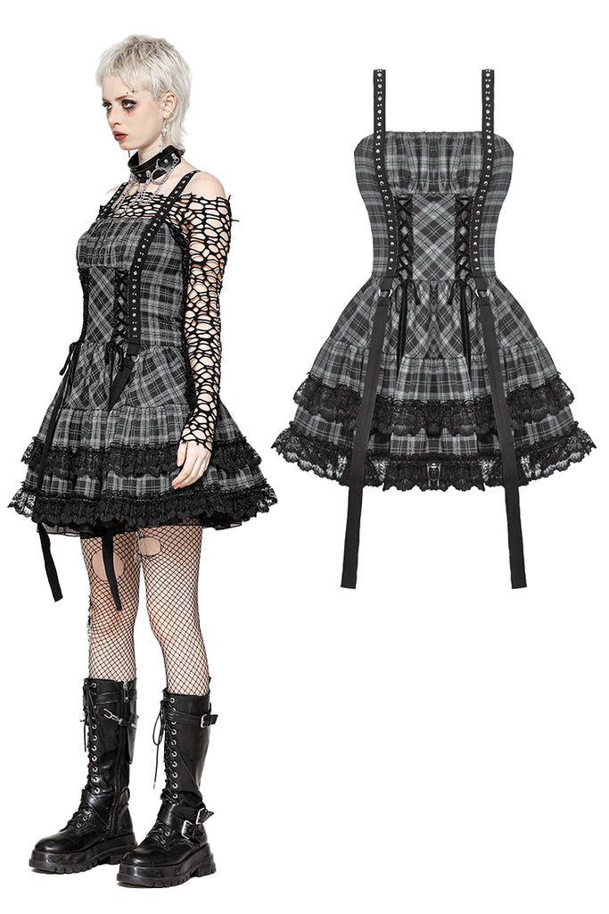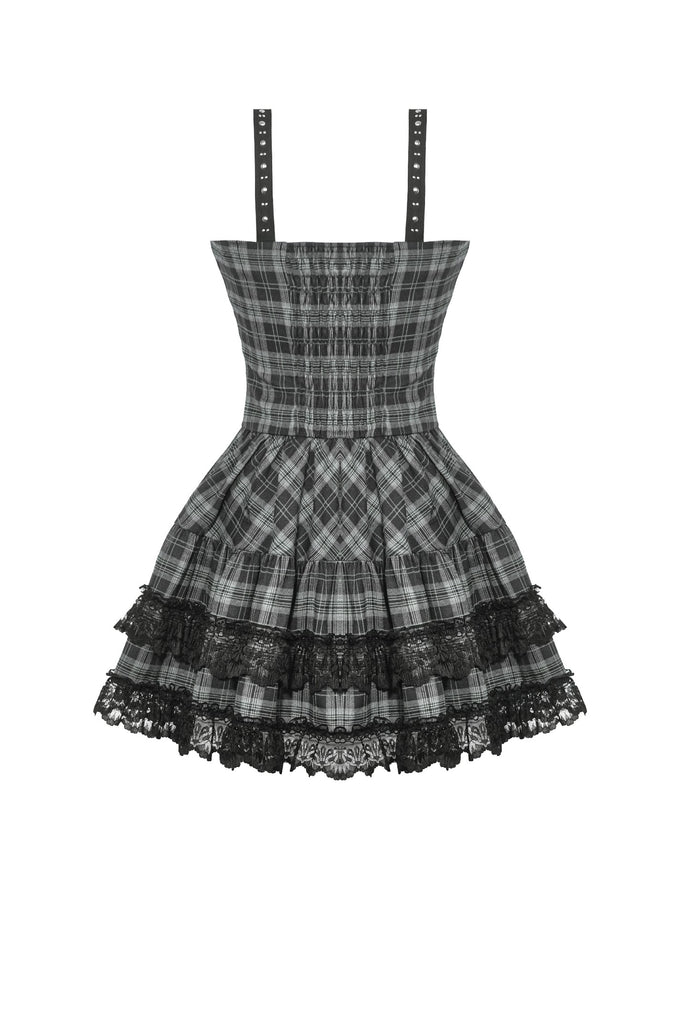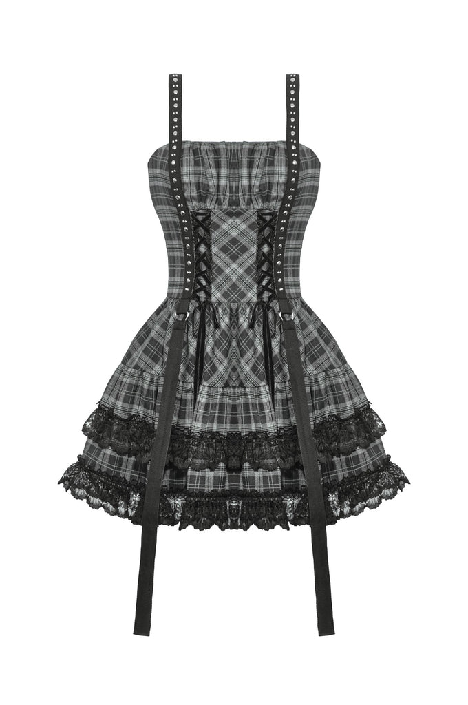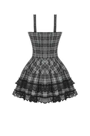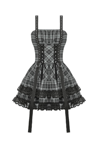 This dress combines punk and sweet elements, crafted from gray plaid fabric. The straps, adorned with metal studs, extend from the shoulders to the waist, adding a rock-inspired touch. The waist features lace-up detailing, enhancing the intricate design. The layered lace trim at the hem softens the look with a delicate edge. A hidden zipper at the back provides both ease and a flattering fit.