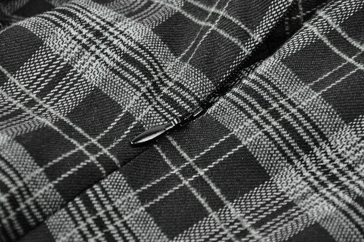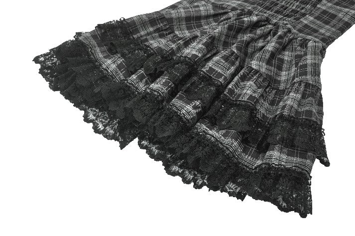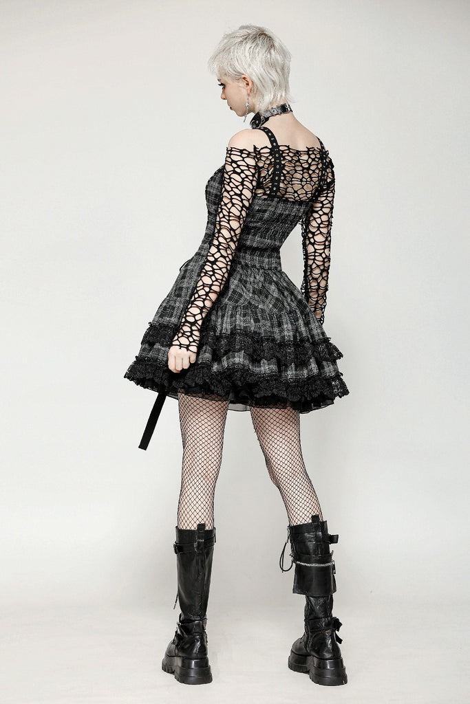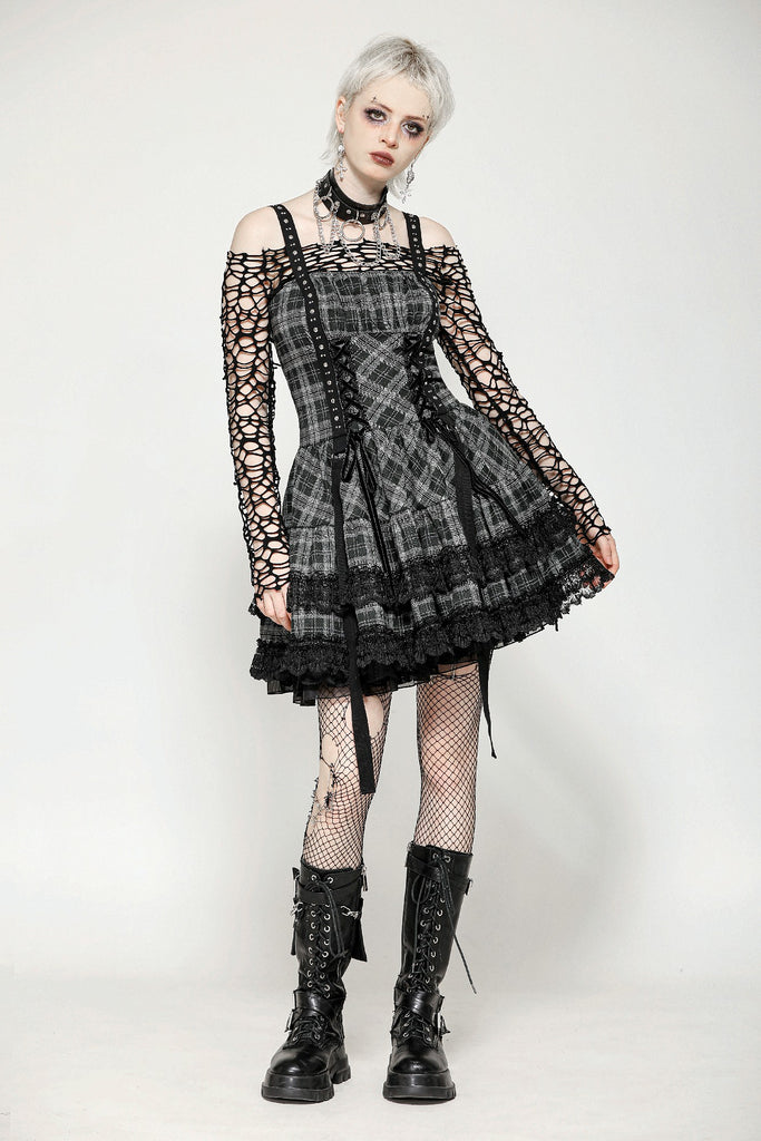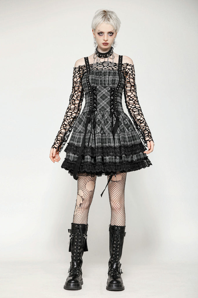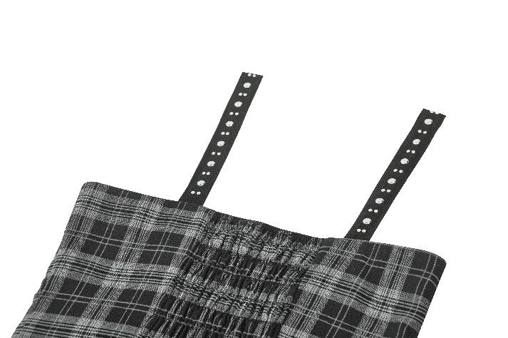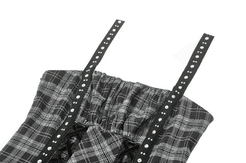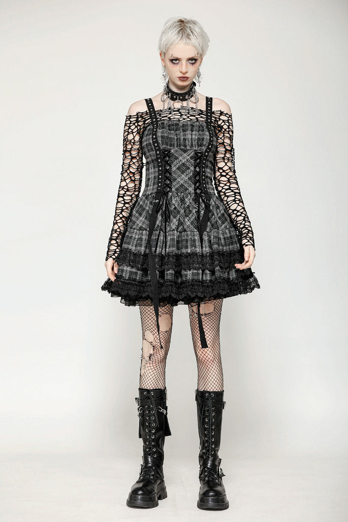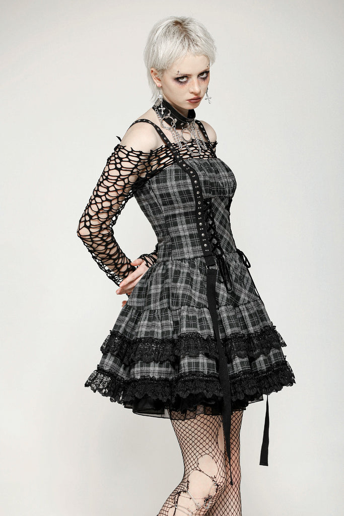 This dress combines punk and sweet elements, crafted from gray plaid fabric. The straps, adorned with metal studs, extend from the shoulders to the waist, adding a rock-inspired touch. The waist features lace-up detailing, enhancing the intricate design. The layered lace trim at the hem softens the look with a delicate edge. A hidden zipper at the back provides both ease and a flattering fit.