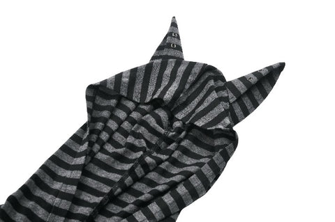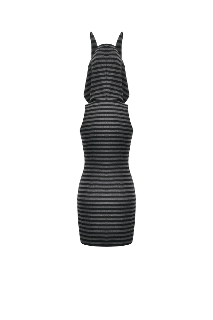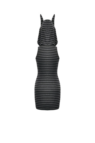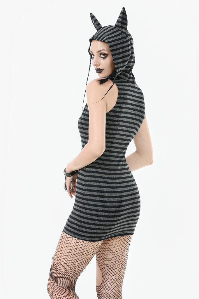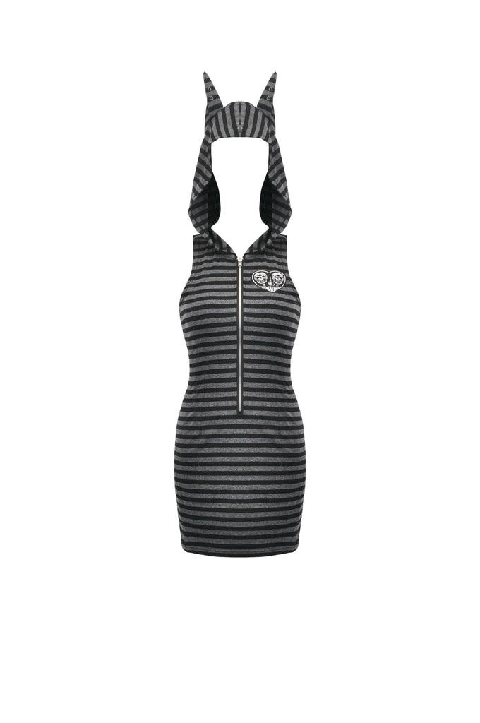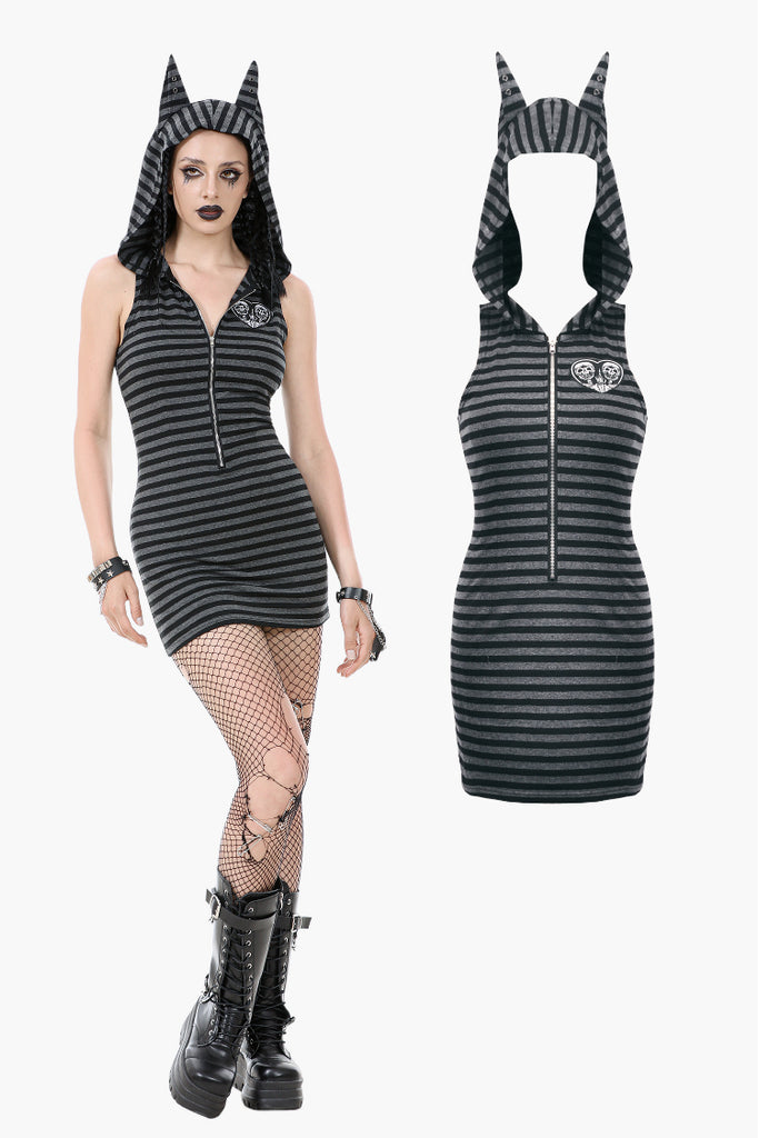 This body-hugging striped dress features a bold front zipper, letting you control just how much attitude you want to show. The pointed wolf ears stand tall, studded with metal rivets, ready to make a statement.