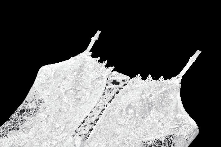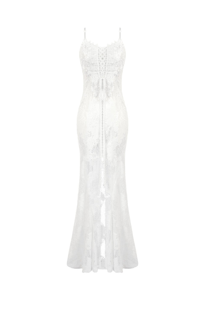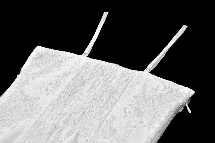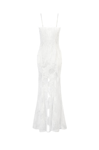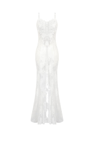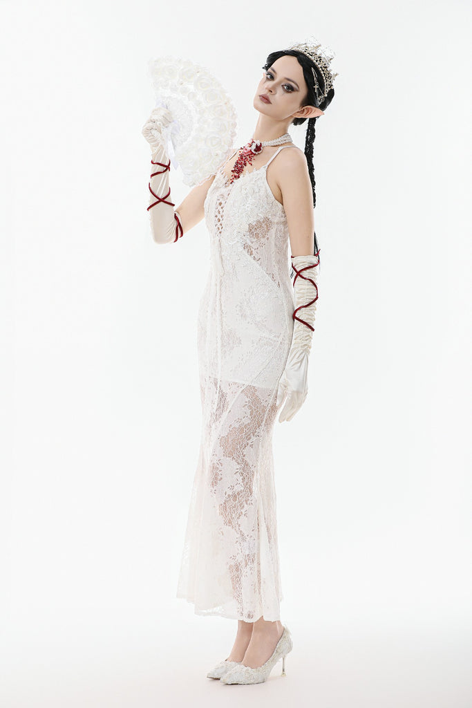 This white romantic Gothic mermaid dress features a lace-up strapless bodice, highlighting the elegance of the neckline and shoulders. The sides are adorned with exquisite beaded floral embroidery, adding a luxurious and refined touch. The mermaid silhouette beautifully accentuates body curves, while the shirred back ensures both comfort and a flattering fit. Perfect for balls, parties, or Gothic-inspired formal occasions, this dress exudes both romance and grandeur.