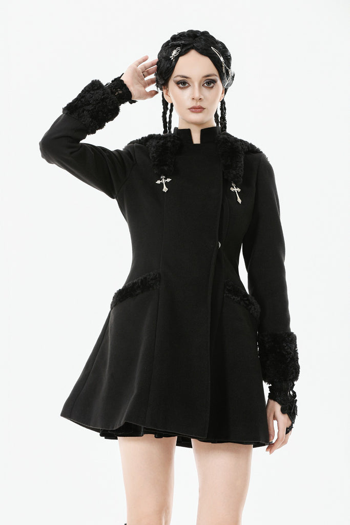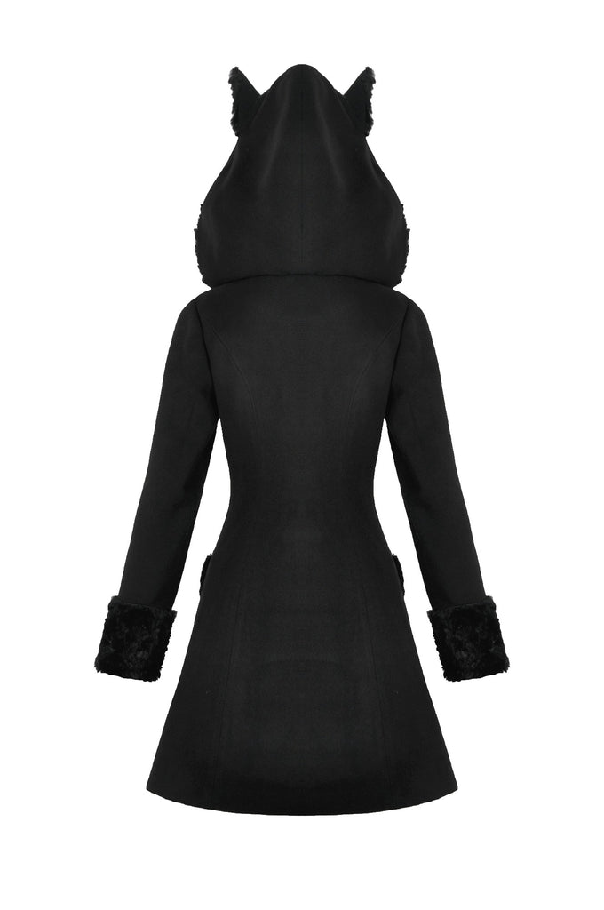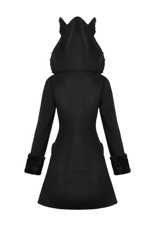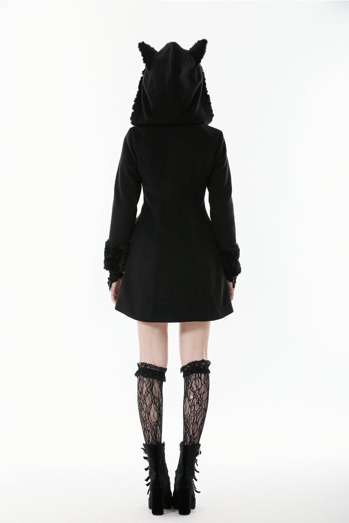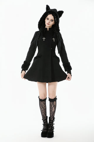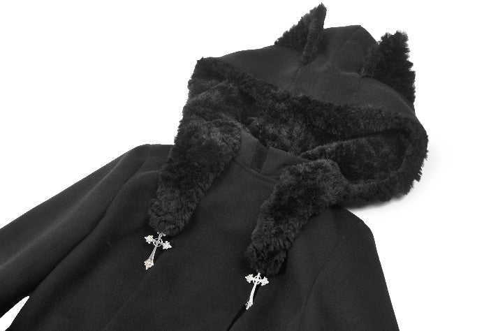 This adorable cat ear hoodie features playful 3D ears on the hood, lined with soft faux fur for extra warmth and charm. A small cross detail adorns the front hood edge, adding a unique touch. The waist pockets are both practical and stylish, with hidden snap buttons for easy closure. Fur trims embellish the cuffs and pockets, creating a cozy yet cute look. Perfect for casual outings or photo shoots.