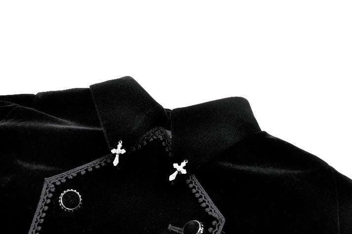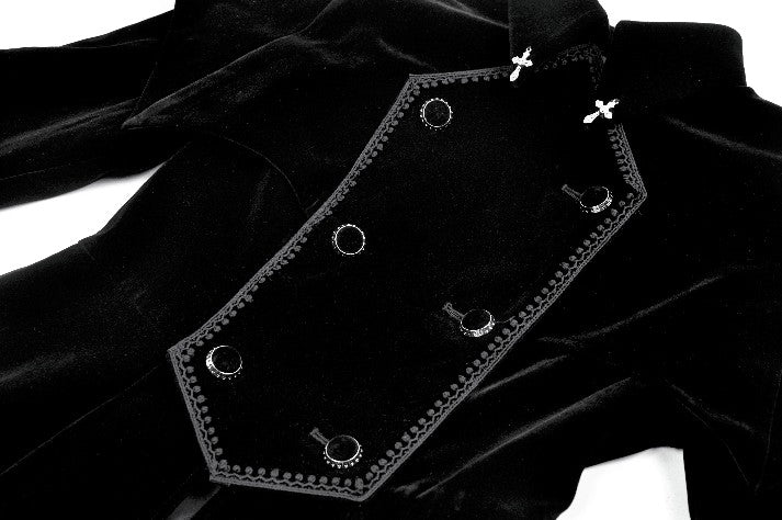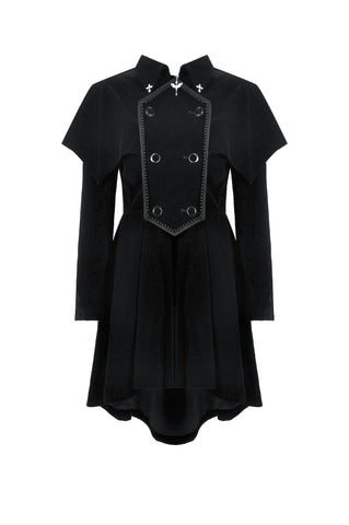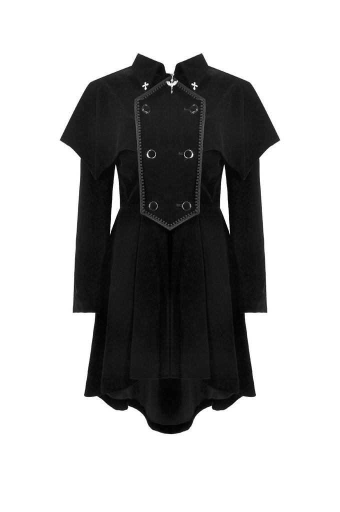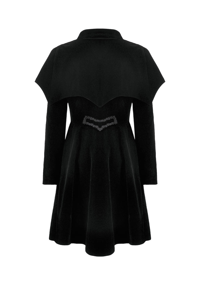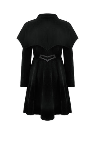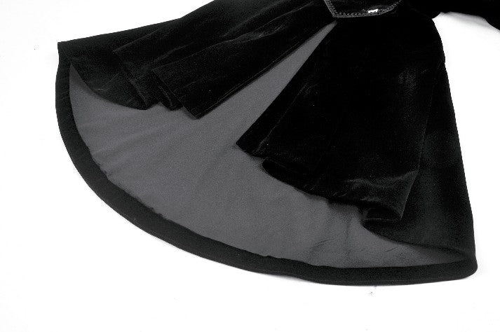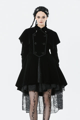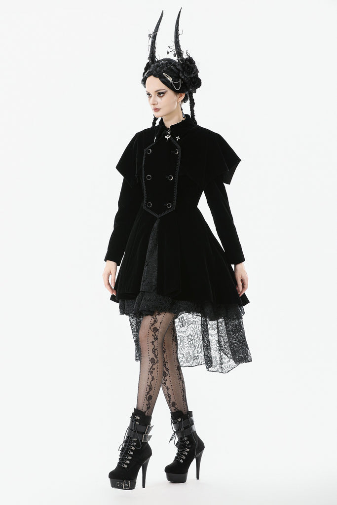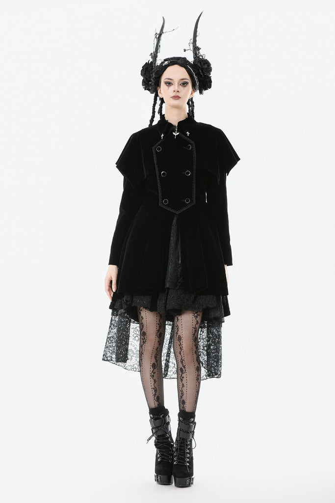 Inspired by witchy Gothic aesthetics, this coat is crafted from luxurious velvet. The bat-wing-shaped cape creates a dramatic faux two-piece design, enhancing its dark elegance. A double-breasted front is adorned with lace-trimmed lapels, while additional lace details decorate the cuffs, buttons, and pleated hem for a richly layered look. Perfect for Gothic daily wear or special occasions, this coat embodies both mystery and sophistication.