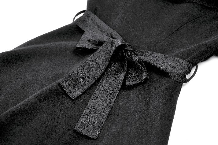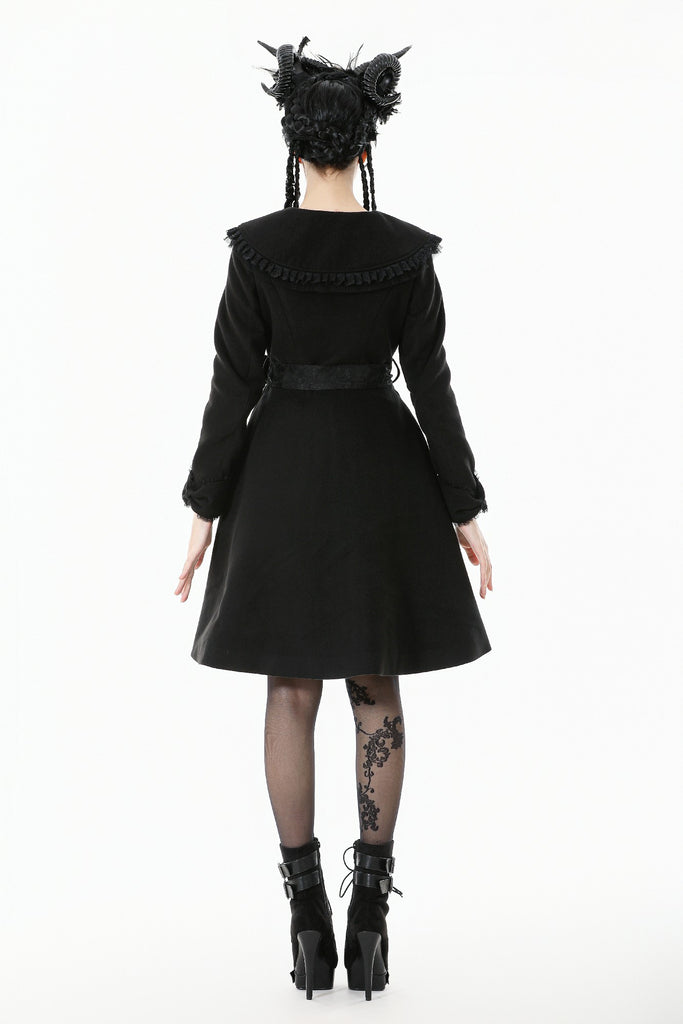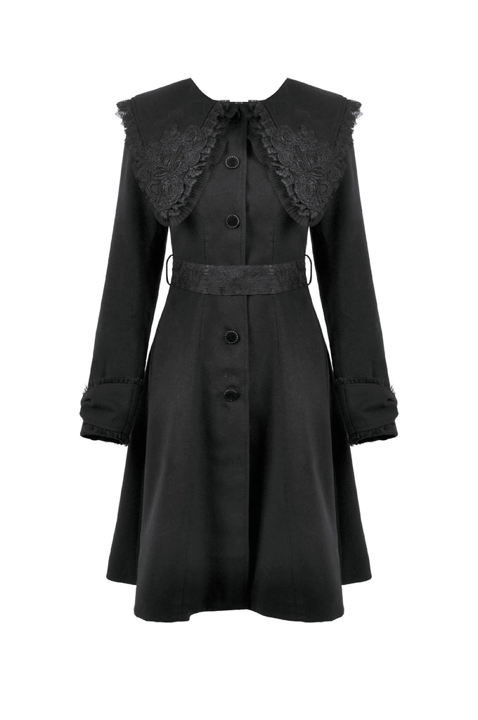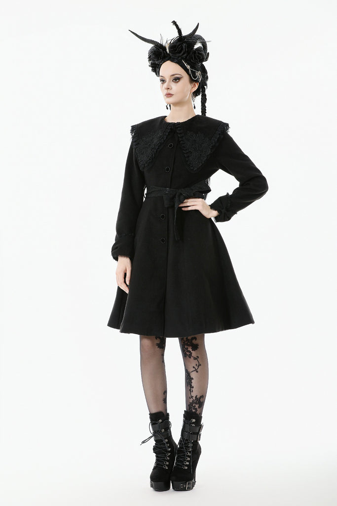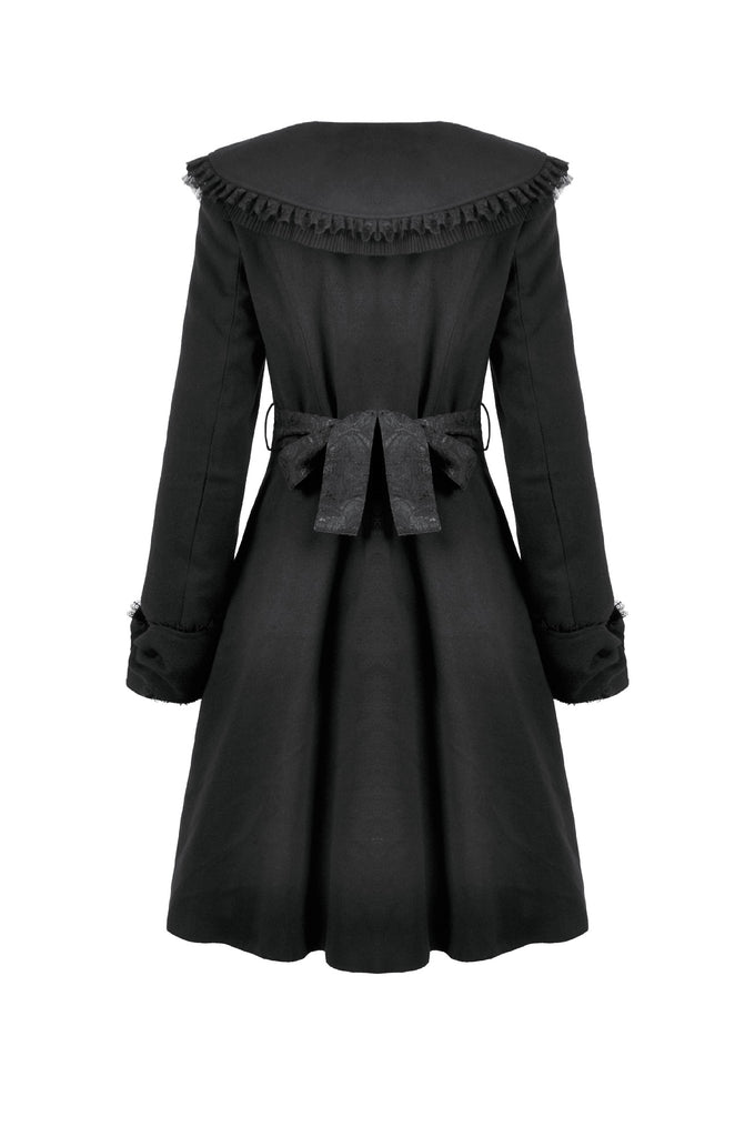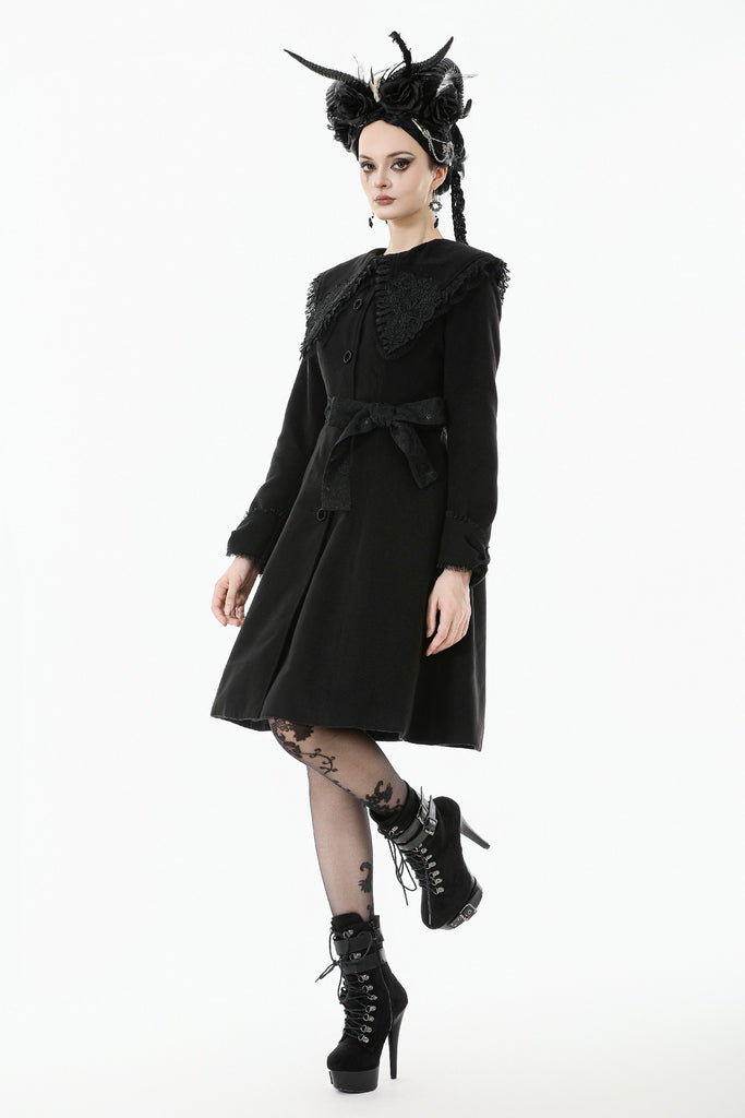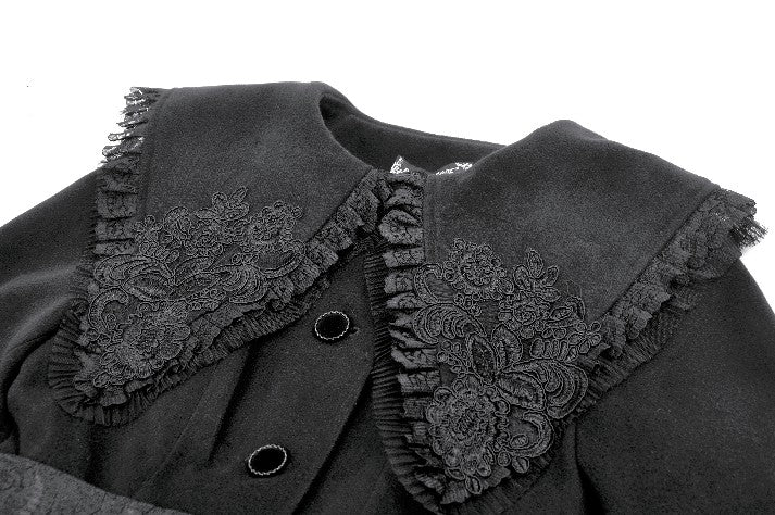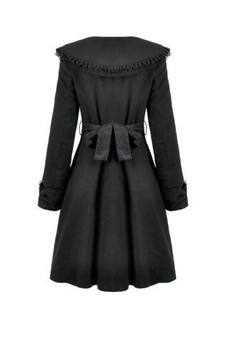 This Gothic-style coat features a wide lapel adorned with delicate embroidery and pleated lace trim for a luxurious touch. The cuffs are designed with bow-shaped cuts, adding elegance and uniqueness. Decorative bow buttons on the front serve both aesthetic and functional purposes. A lace belt cinches the waist, paired with matching bow cuffs, creating a harmonious and refined design. Warm yet stylish, this coat is perfect for both practical wear and making a statement.