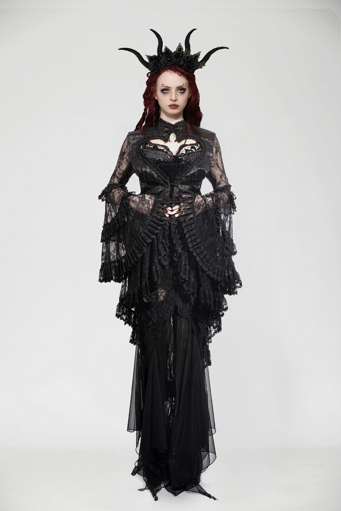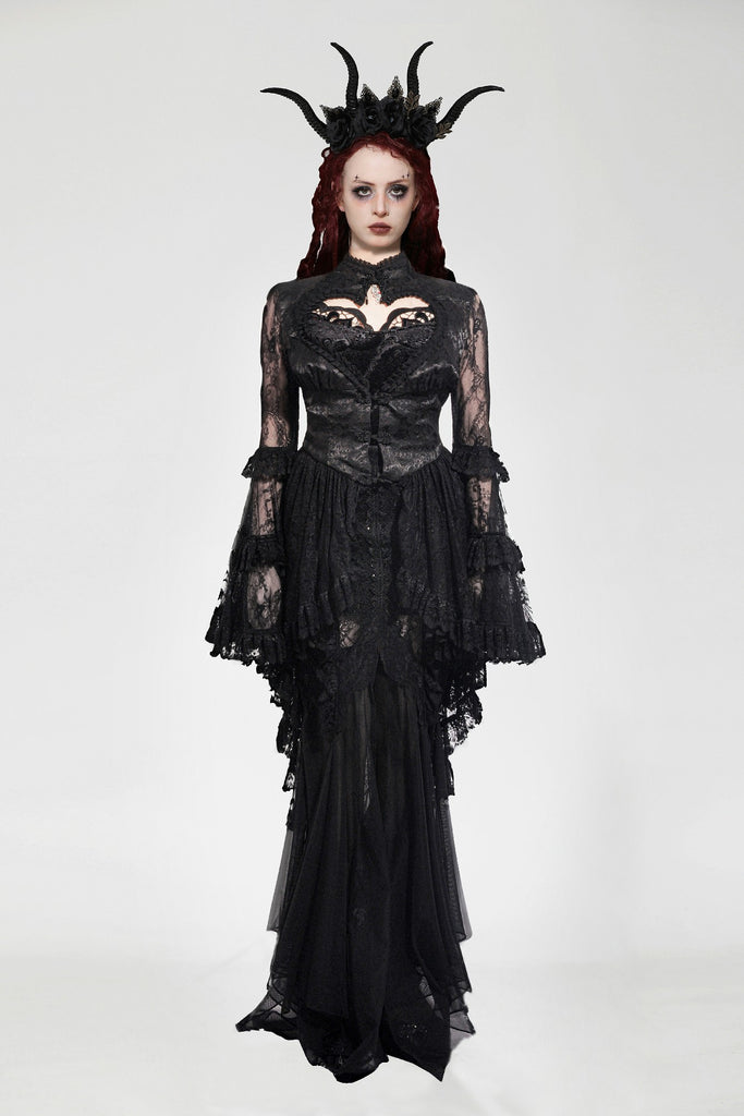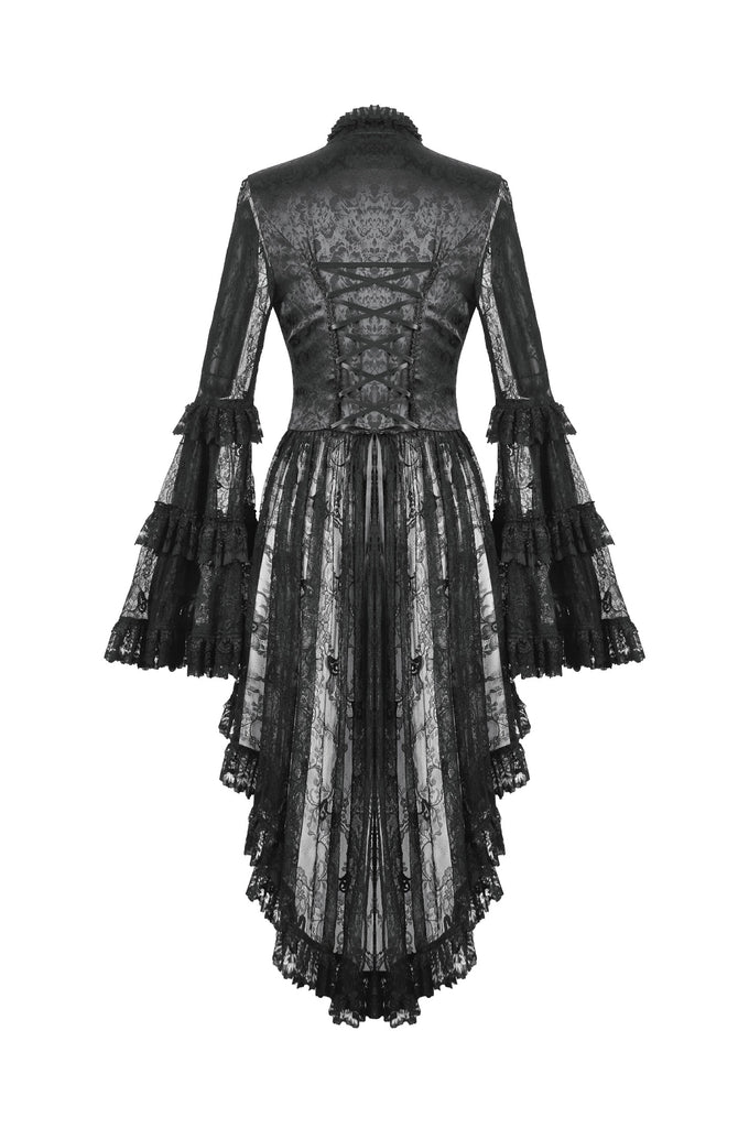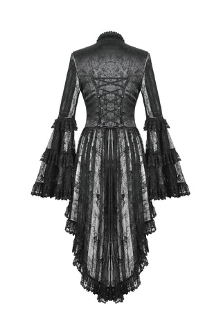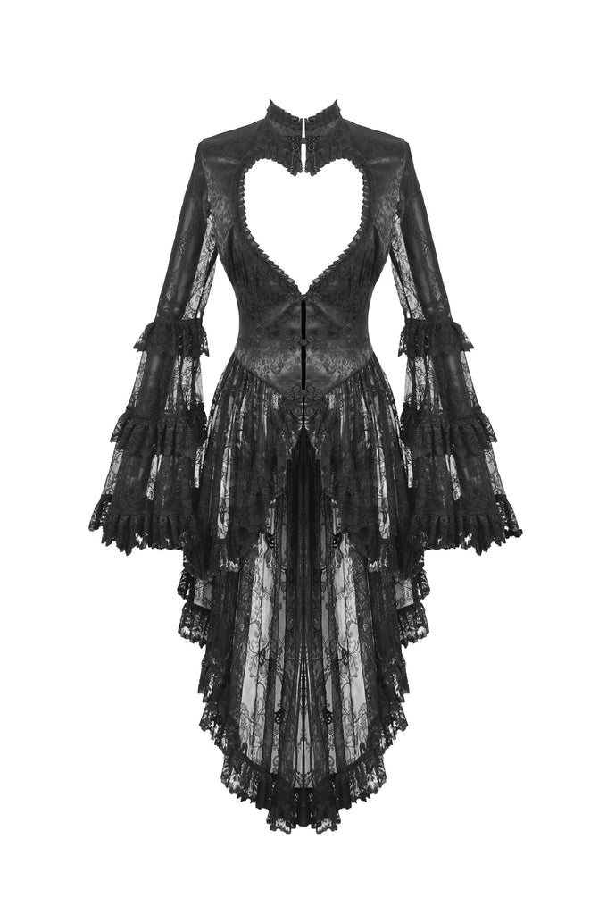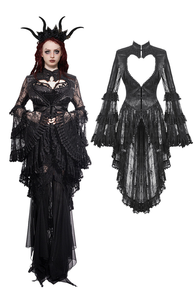 This coat embodies the romantic and elegant essence of Gothic fashion. The front features a daring hollow-out heart-shaped design, exuding boldness and sensuality. The neckline is adorned with trumpet flower tassel knotted buttons, adding a touch of vintage sophistication. The wide bell sleeves are embellished with triple-layered lace ruffles, showcasing a luxurious and layered appeal. The hemline incorporates abundant lace fabric, skillfully gathered and stitched for a voluminous, distinctive aesthetic. The classic swallowtail design at the back adds an elegant and flowing touch, making it a stunning choice for crafting a regal and captivating Gothic look.