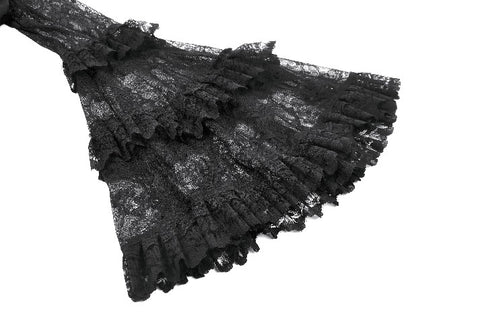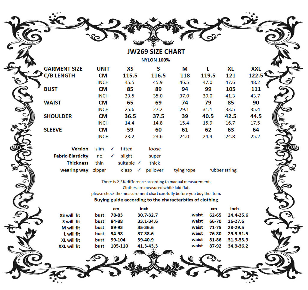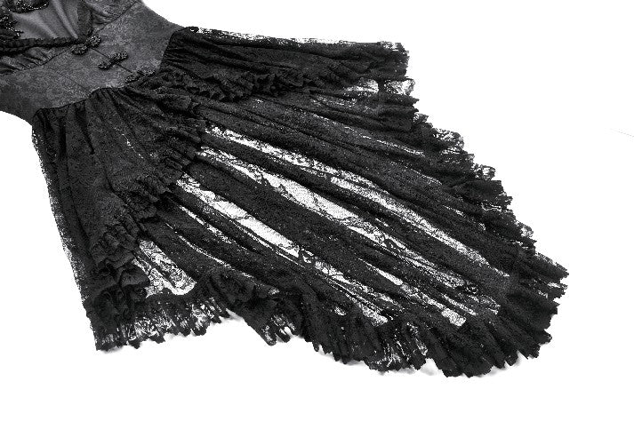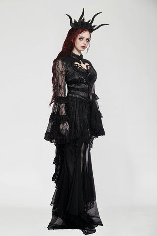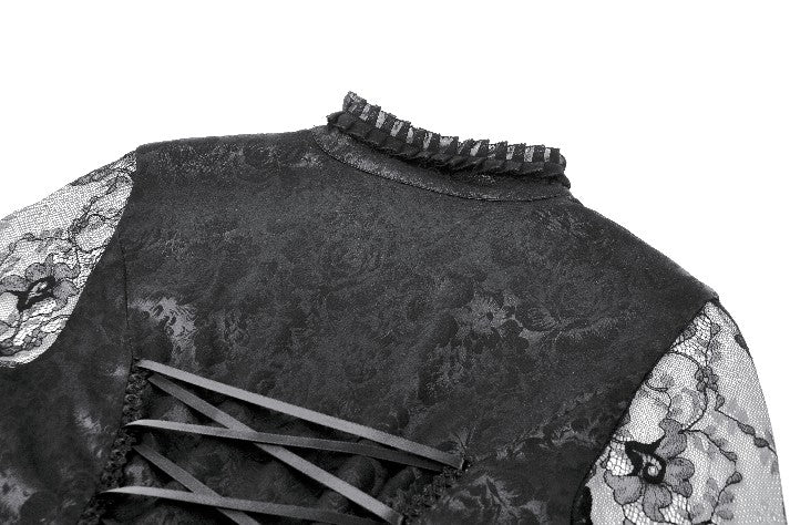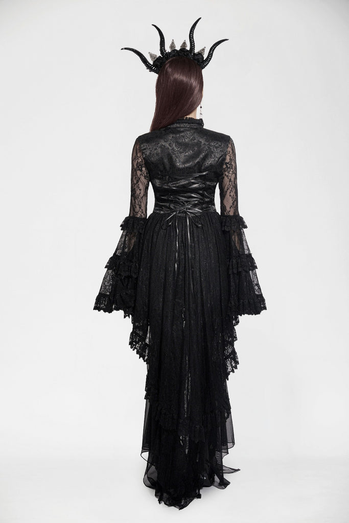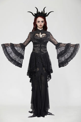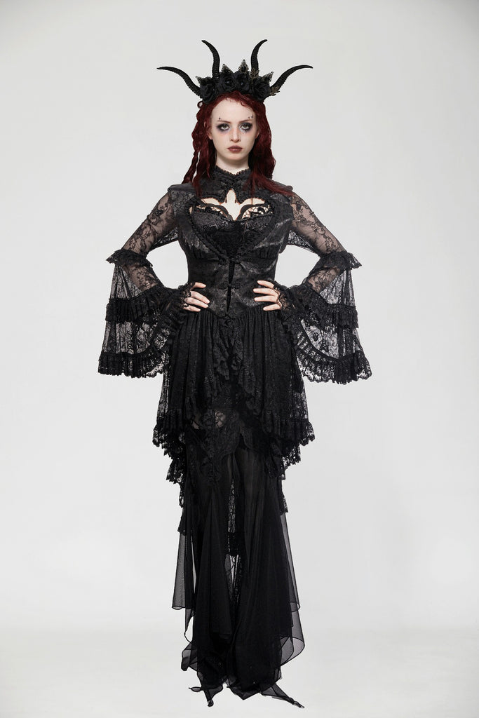 This coat embodies the romantic and elegant essence of Gothic fashion. The front features a daring hollow-out heart-shaped design, exuding boldness and sensuality. The neckline is adorned with trumpet flower tassel knotted buttons, adding a touch of vintage sophistication. The wide bell sleeves are embellished with triple-layered lace ruffles, showcasing a luxurious and layered appeal. The hemline incorporates abundant lace fabric, skillfully gathered and stitched for a voluminous, distinctive aesthetic. The classic swallowtail design at the back adds an elegant and flowing touch, making it a stunning choice for crafting a regal and captivating Gothic look.