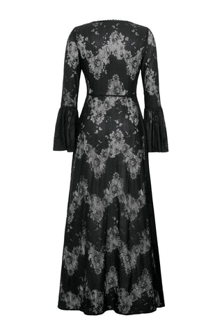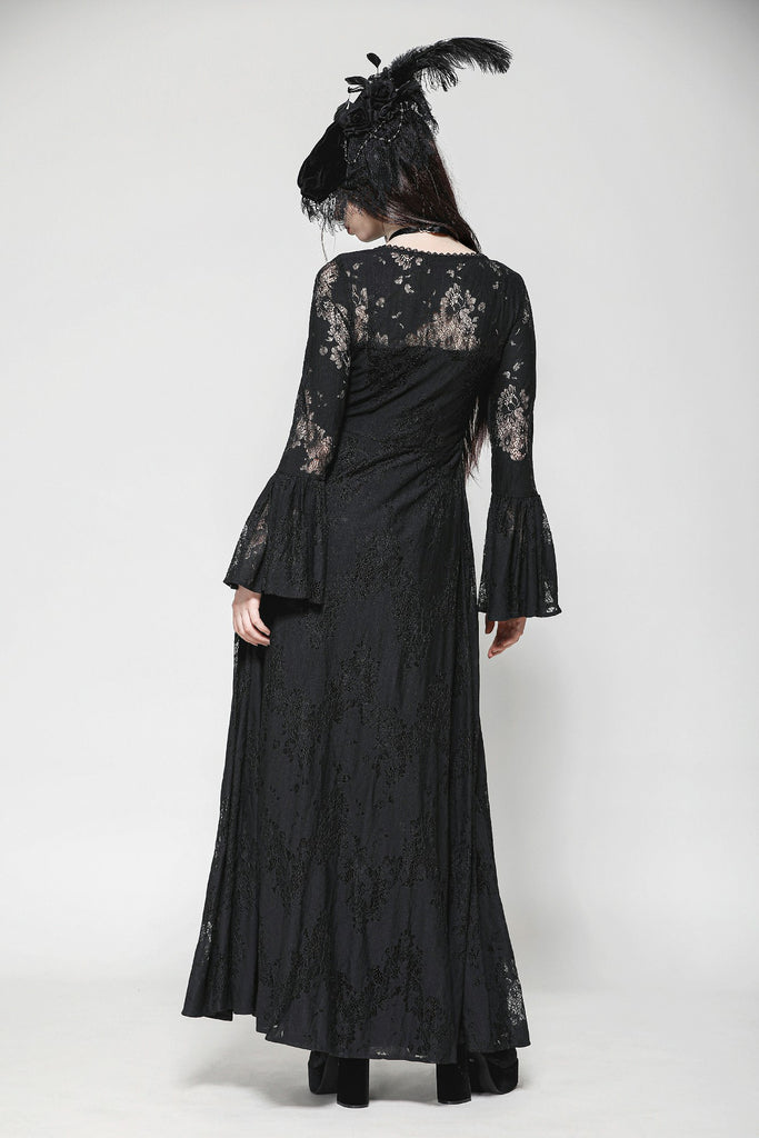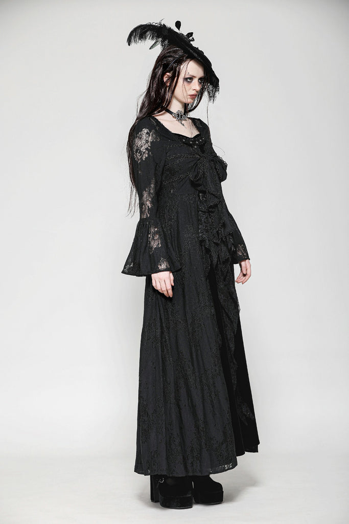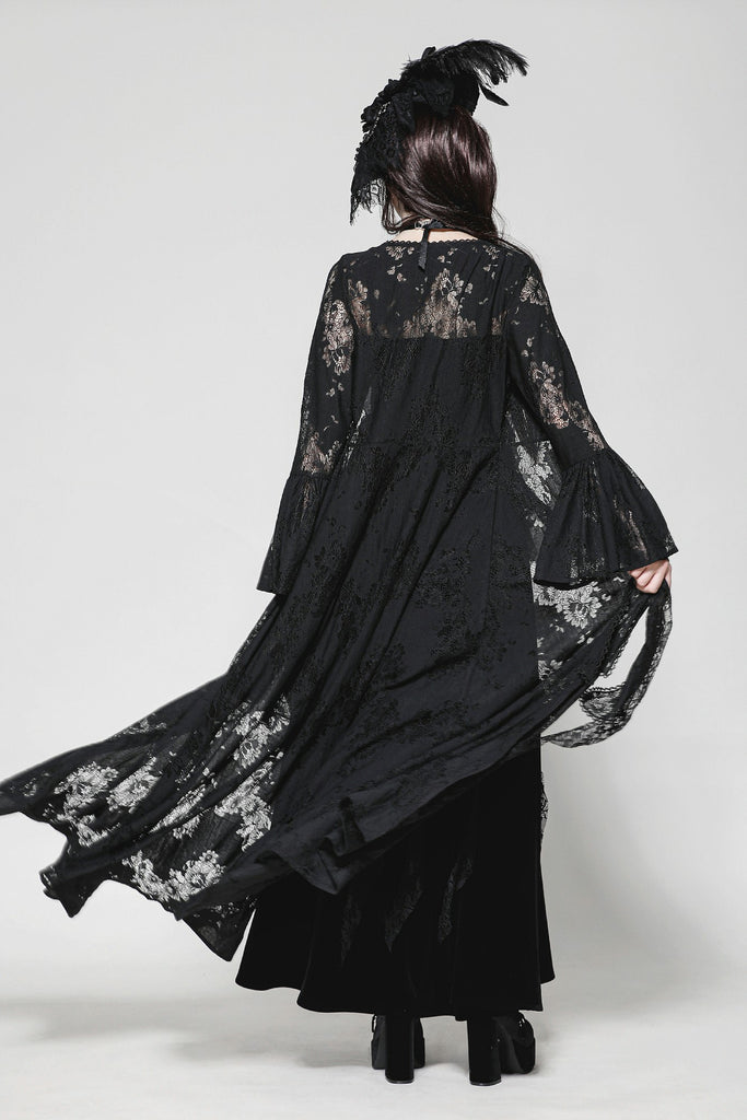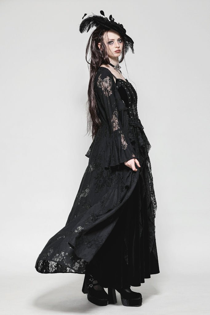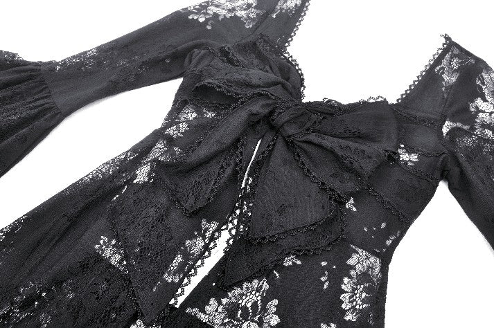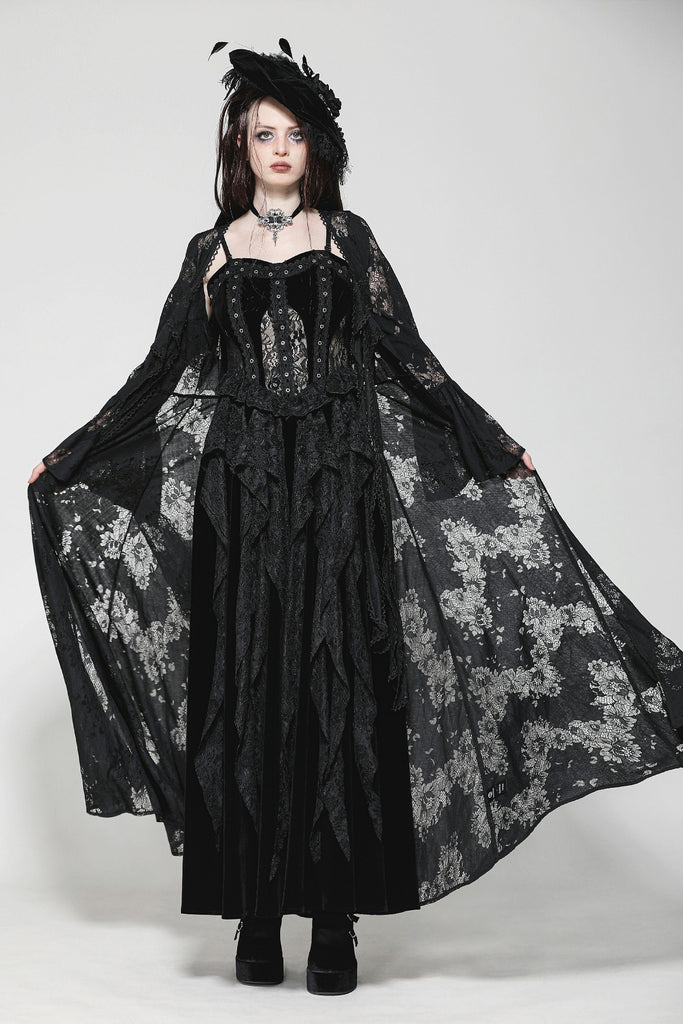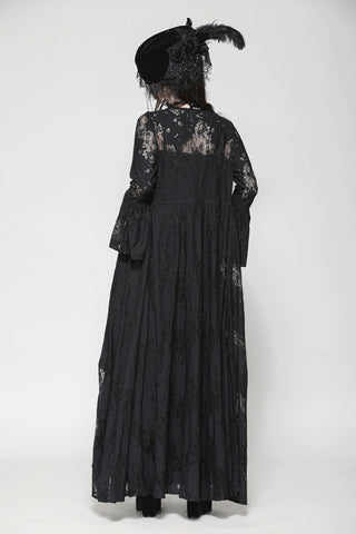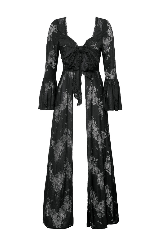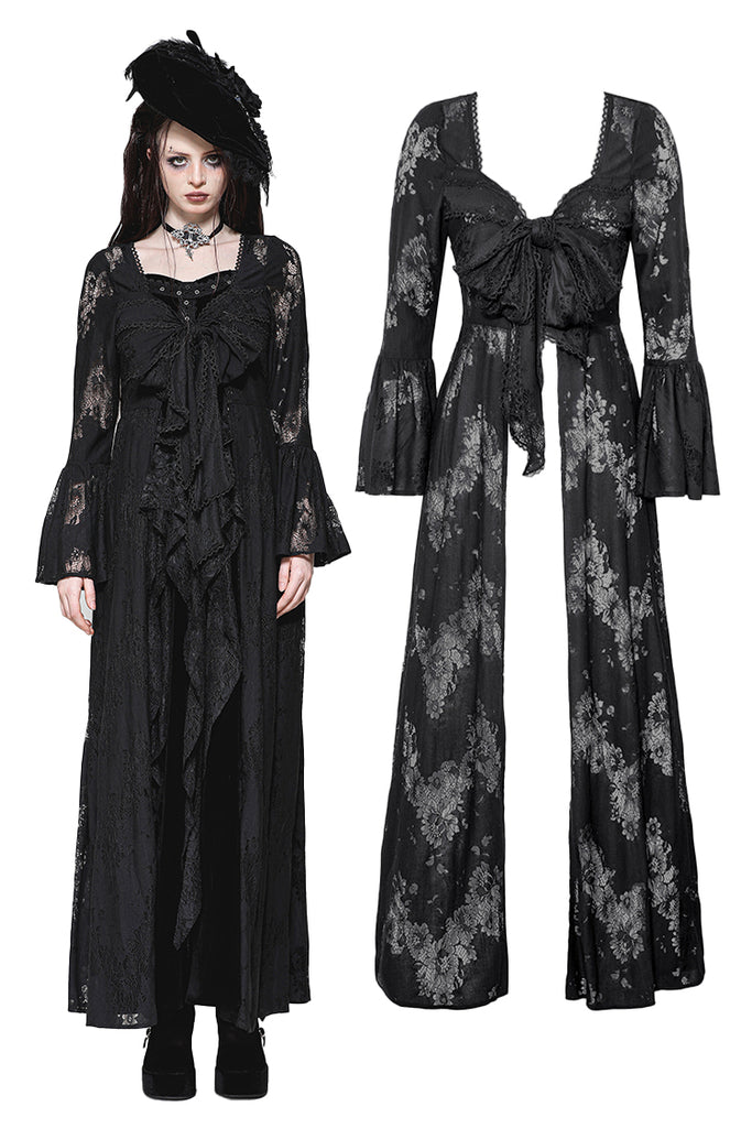 This elegant long Gothic robe crafted entirely from lace exudes an air of mysterious sophistication. The front features two layers of lace-trimmed ribbons that tie gracefully at the chest, creating a chic yet understated look. The black lace adds a touch of Gothic allure, making this piece perfect for a variety of occasions, from sleepwear parties to intimate, elegant gatherings. It’s a versatile staple that pairs effortlessly with a wide range of styles.