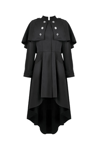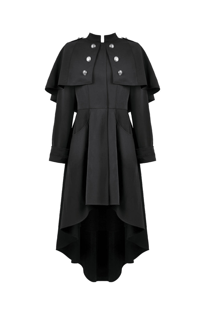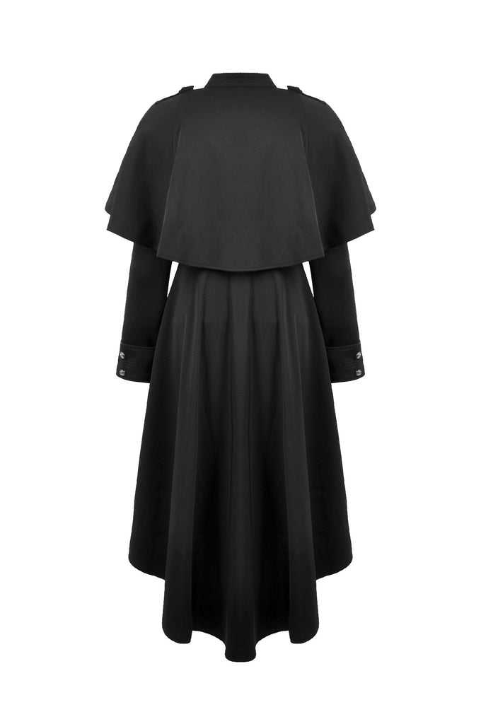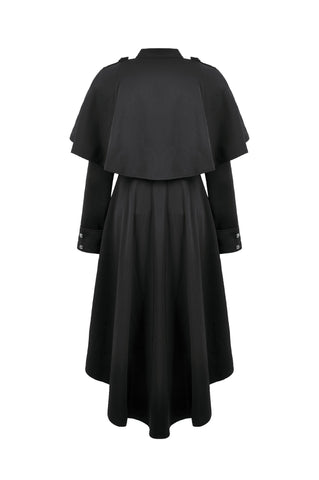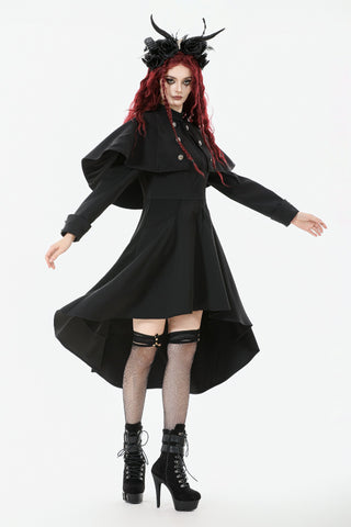 This Mystic Gothic robe features a faux two-piece shoulder cape design that creates a layered, dramatic silhouette. Both the cape and hem are cut shorter in the front and longer in the back, enhancing its mysterious and flowing elegance. The neckline and cuffs are trimmed with delicate synthetic threads, adding refined details, while the front of the cape is adorned with vintage-style buttons for a classic Gothic finish. Perfect for balls, festivals, or theatrical occasions, this robe embodies both mystery and grandeur.