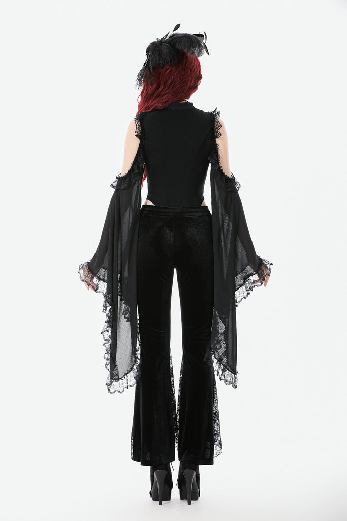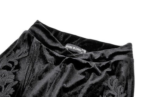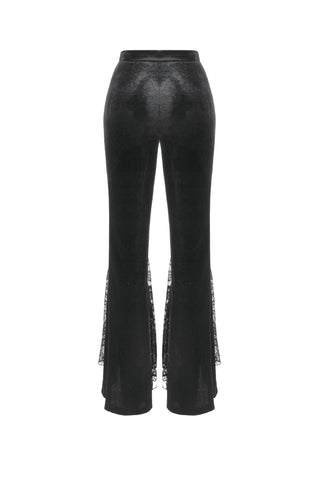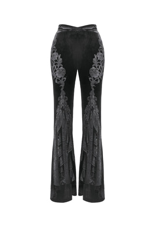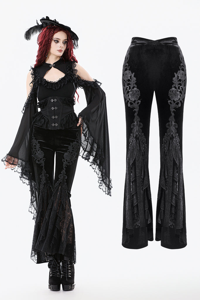 These Gothic-style flared pants are crafted from a luxurious blend of velvet and lace fabrics. The V-shaped waistband enhances a slender silhouette, while large appliqué designs extend from the thigh to the knee, standing out boldly against the deep velvet background. Below the knees, inverted V-shaped lace panels flow seamlessly, adorned with draping tassels that sway with movement for a dramatic effect. Perfect for both stylish everyday wear and special occasions, these pants embody an elegant yet mysterious Gothic allure.