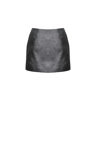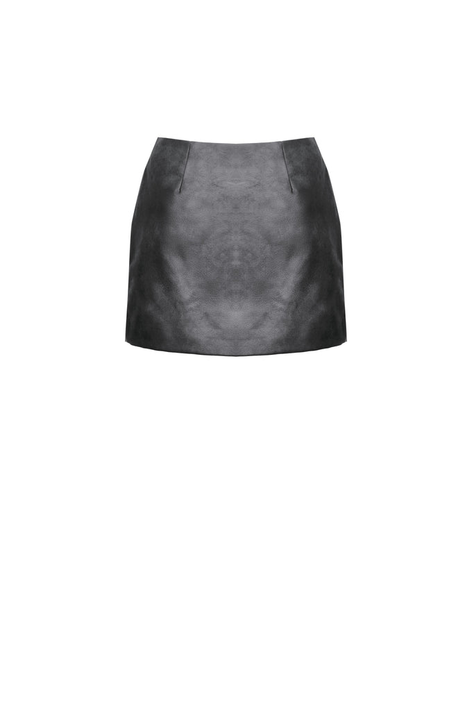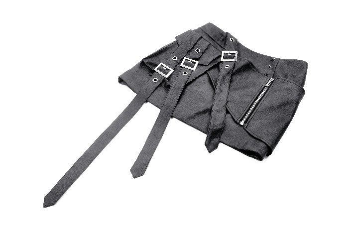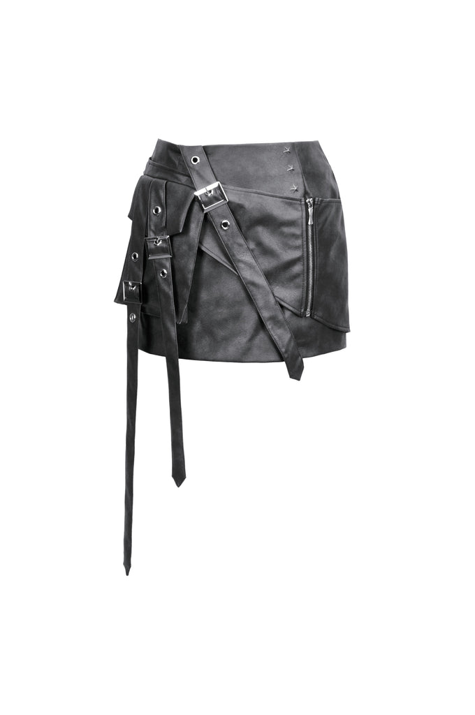 This leather mini skirt breaks the mold with bold asymmetric layering, crafting a striking structural silhouette. On one side, a large cargo pocket meets three “sword strap” belts, punched with eyelets and adorned with sleek metal rings — echoing a cyber-armor aesthetic.