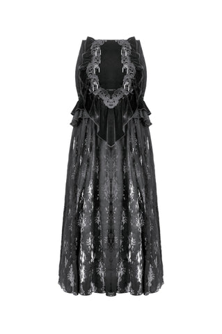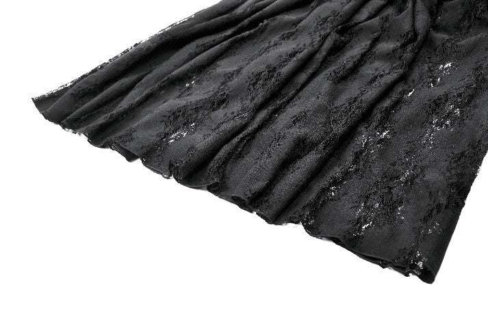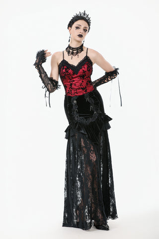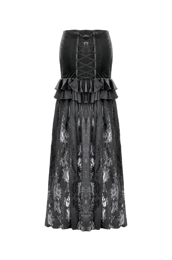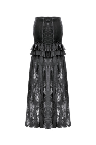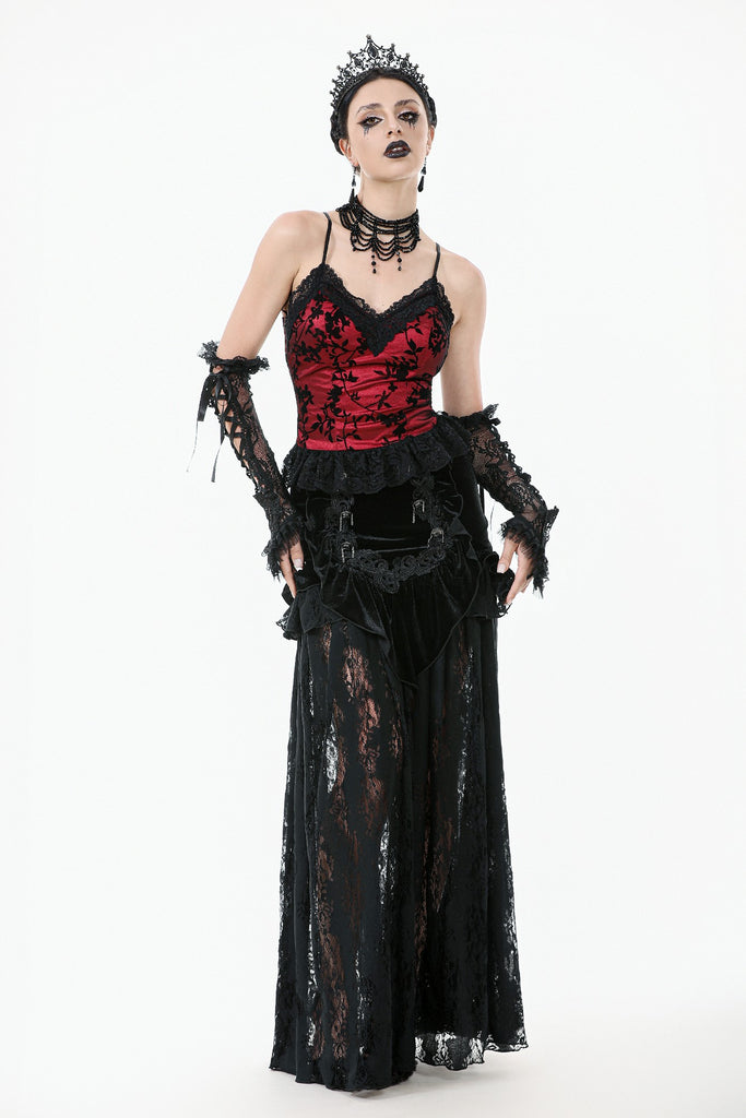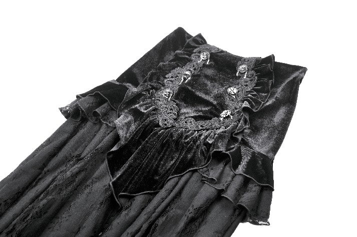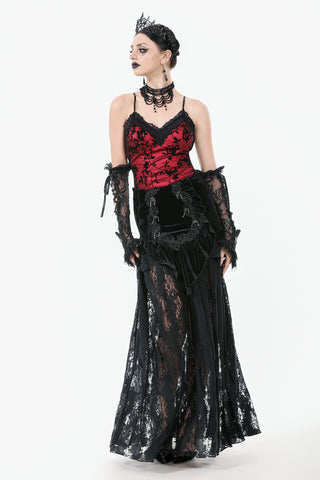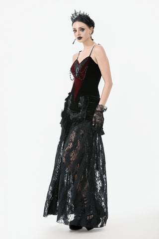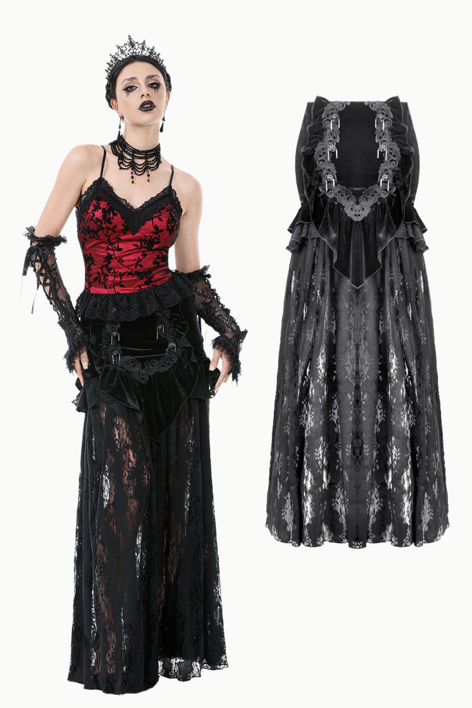 This exquisite half skirt draws from aristocratic Gothic imagery — the top portion sculpts the hips in deep black velvet, offering a sleek, dramatic silhouette. Below, the sheer lace falls like shadows, flowing with ghostly grace and flattering the legs with its peekaboo effect. Velvet trims cascade down the front in layered points, crowned with double rows of gunmetal chain roses, a nod to decadent armor and dark romance. The corset-style lace-up at the back offers adjustability and cinches the waist just right. Pair with a lace blouse or corset top for a hauntingly elegant look.
