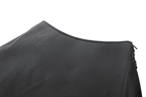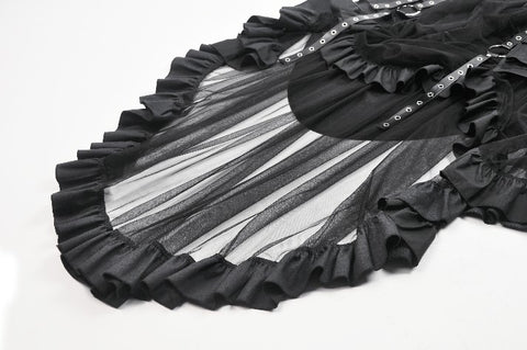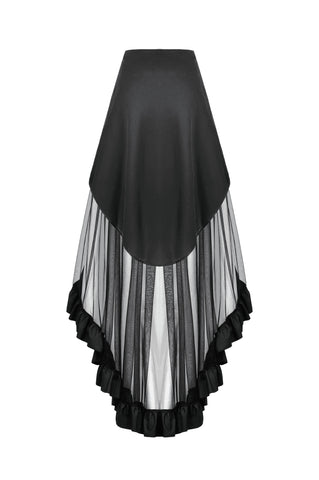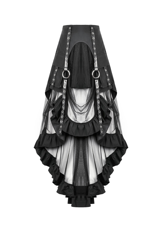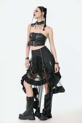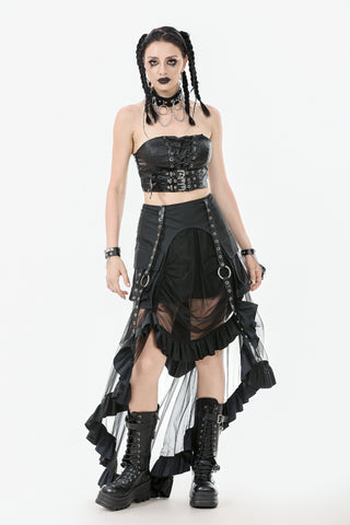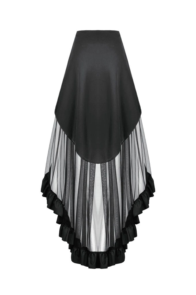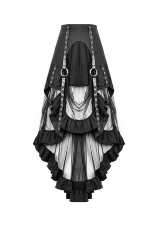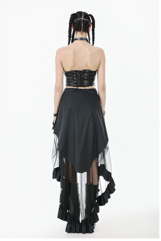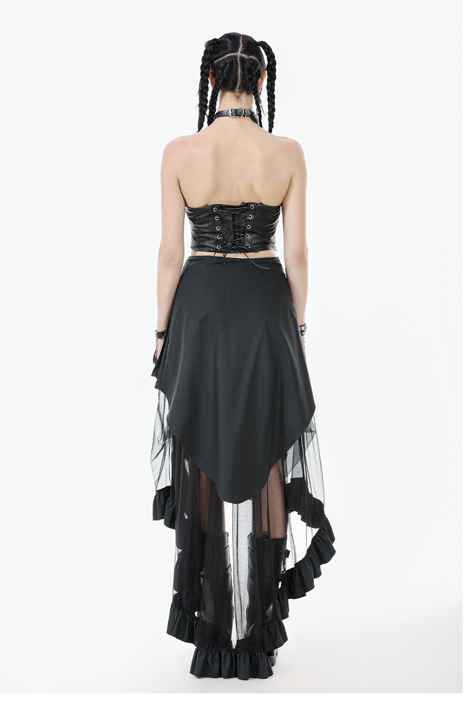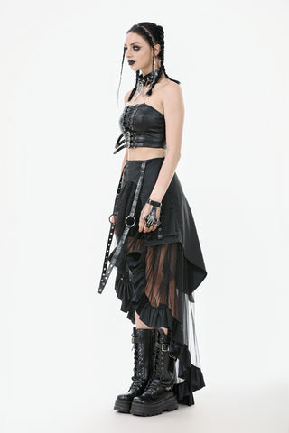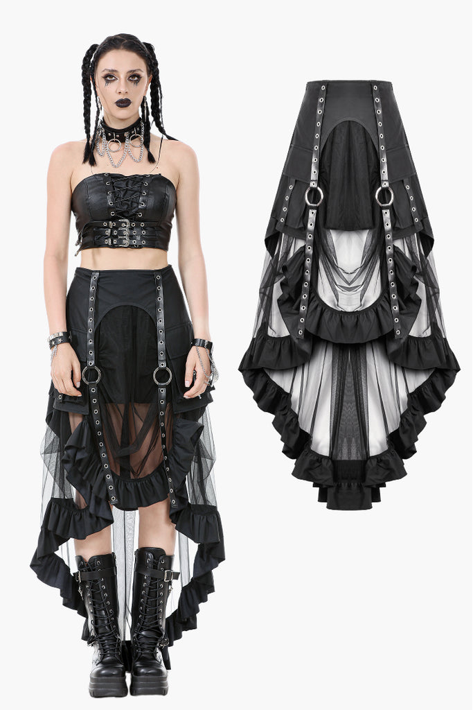 This punk-style tail skirt fuses bold leather structure with sheer mesh contrast, embodying both rebellion and allure. The high-low hem creates a dramatic silhouette, while the cutout leather front reveals ruched mesh beneath — a subtle play of toughness and texture.