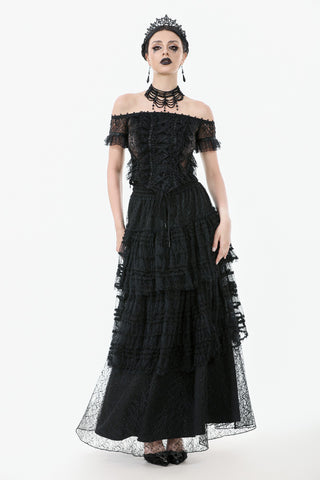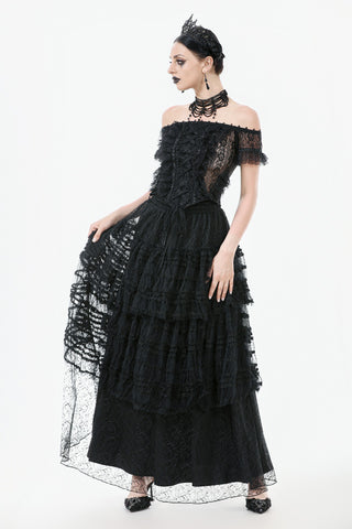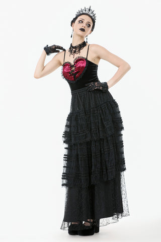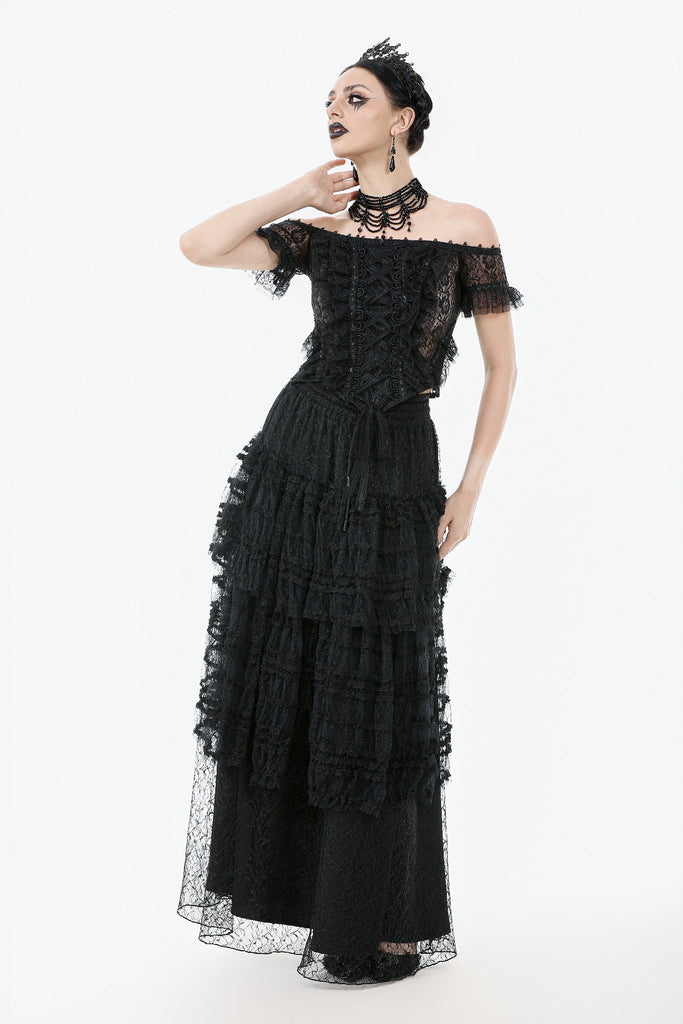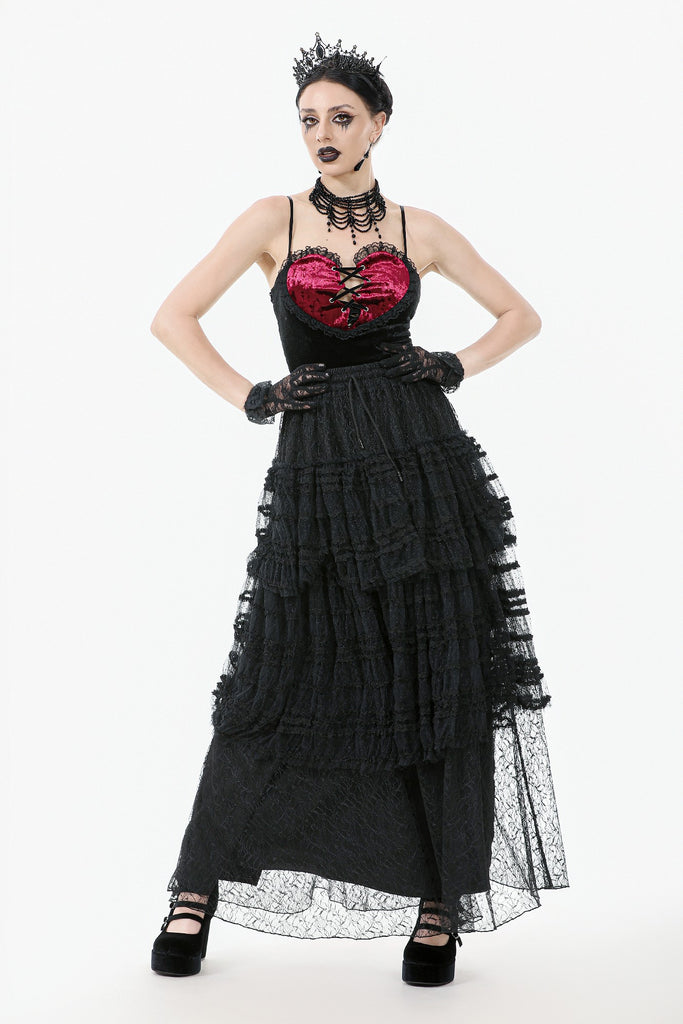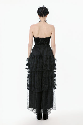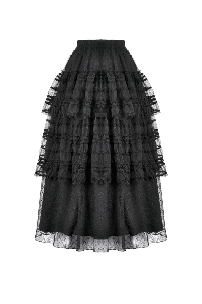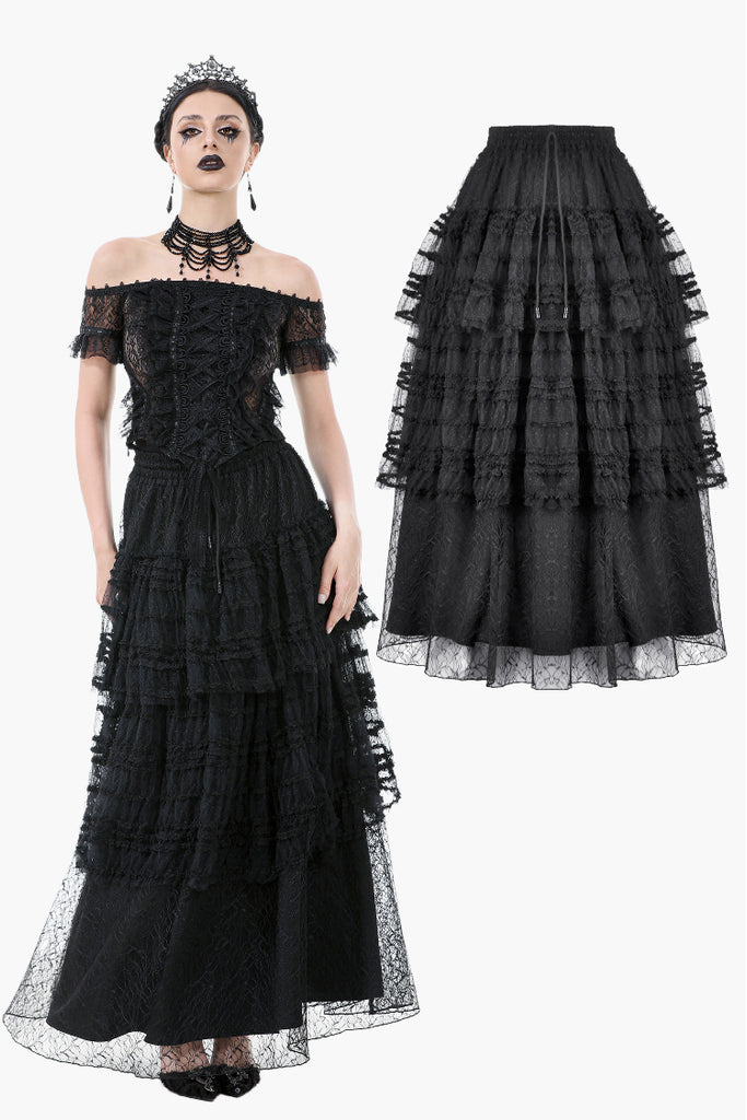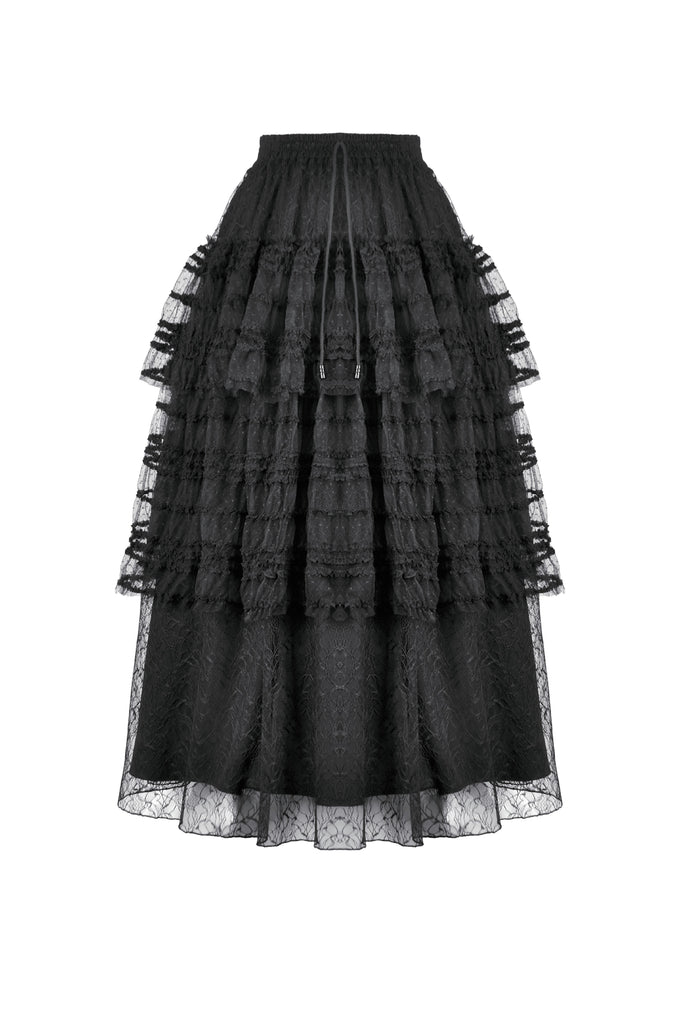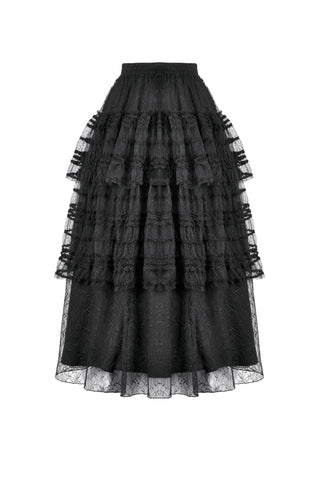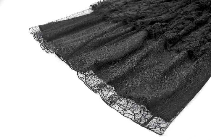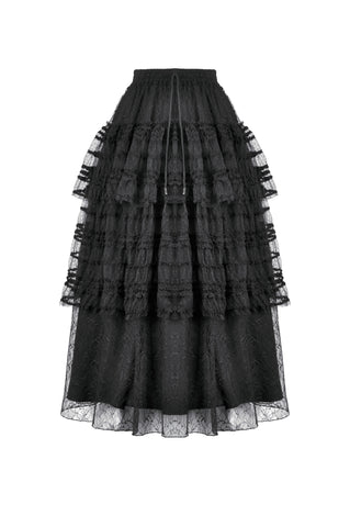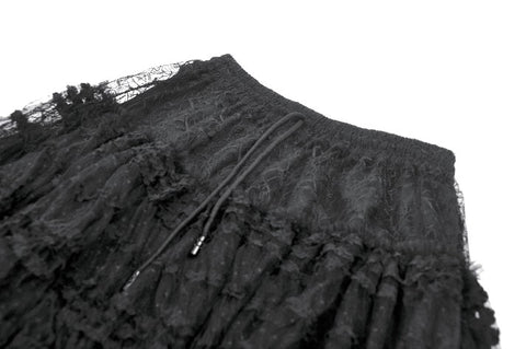 A dreamy fusion of sweetness and edge, this layered lace skirt features delicate polka dot mesh adorned with gathered ruched detailing. The elasticated waistband with drawstring allows for a flexible, flattering fit. Irregular lace trims cascade at the hem, adding texture and a rebellious romantic feel. The tiered construction creates volume without heaviness, making it ideal for pairing with cropped tops, structured corsets, or punk-inspired outerwear for a look that's both playful and daring.