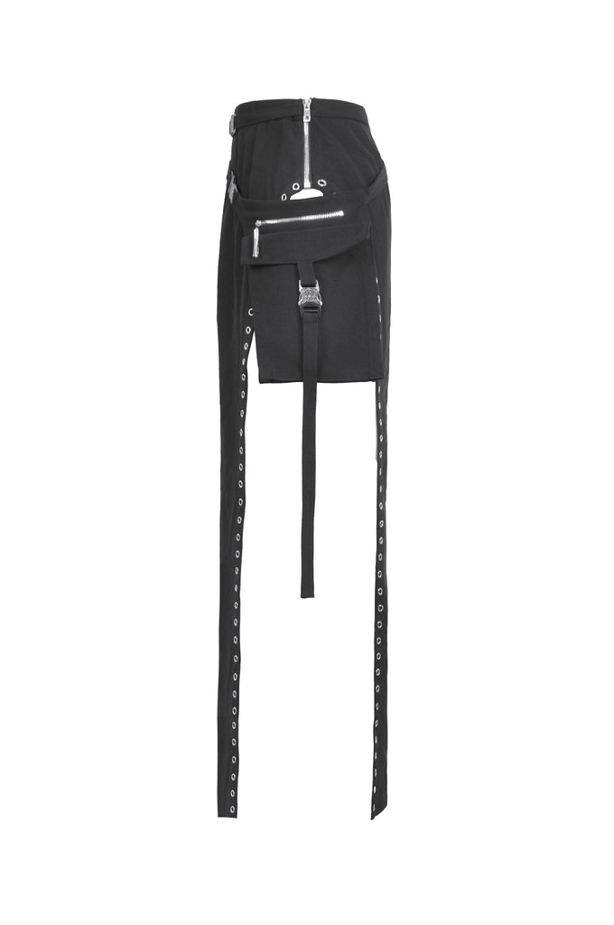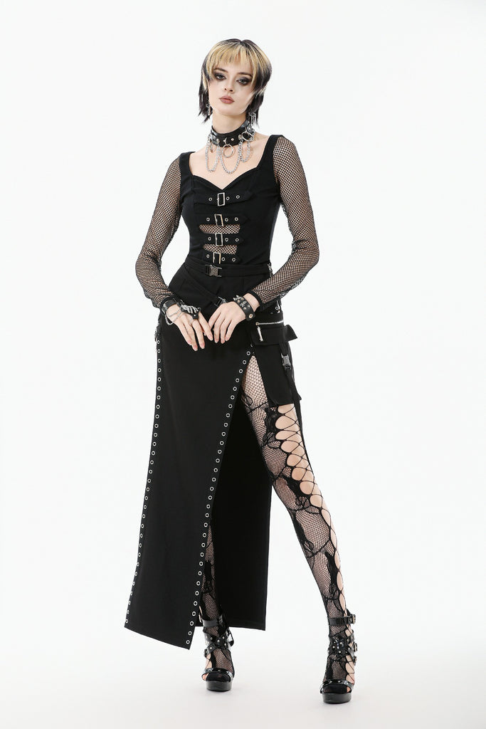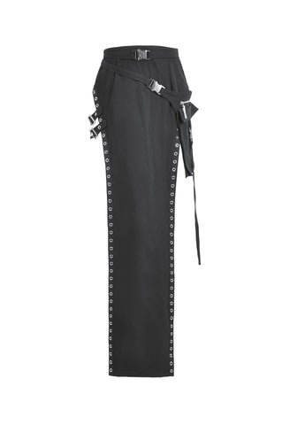 Step into the spotlight with this punk-inspired high-slit midi skirt. Eyelet trim lines the daring slit, creating a bold industrial edge, while strap-and-buckle details add visual intrigue. The waist features an ornate metal clasp for a statement finish, and a side flap pocket offers both style and function.