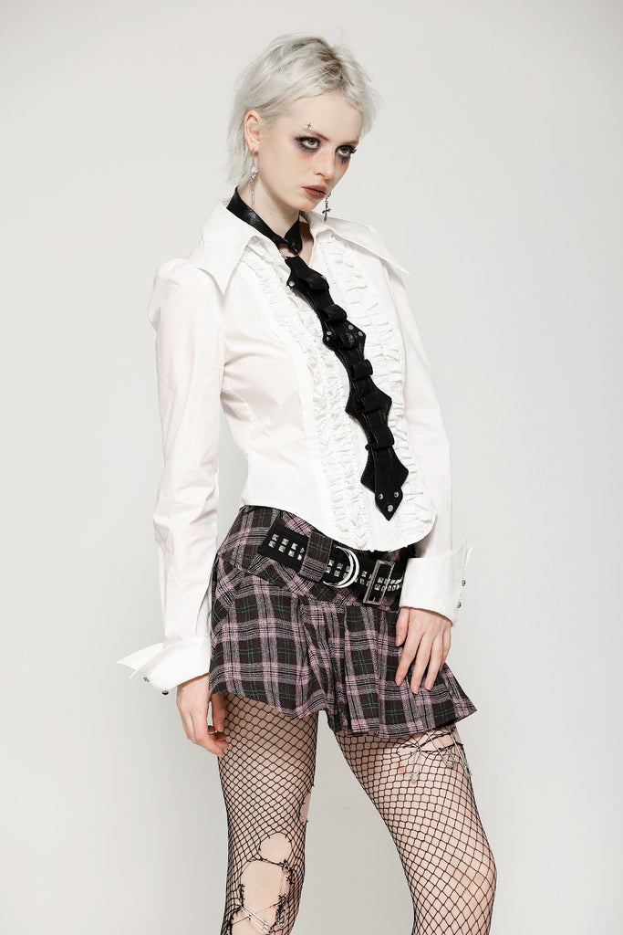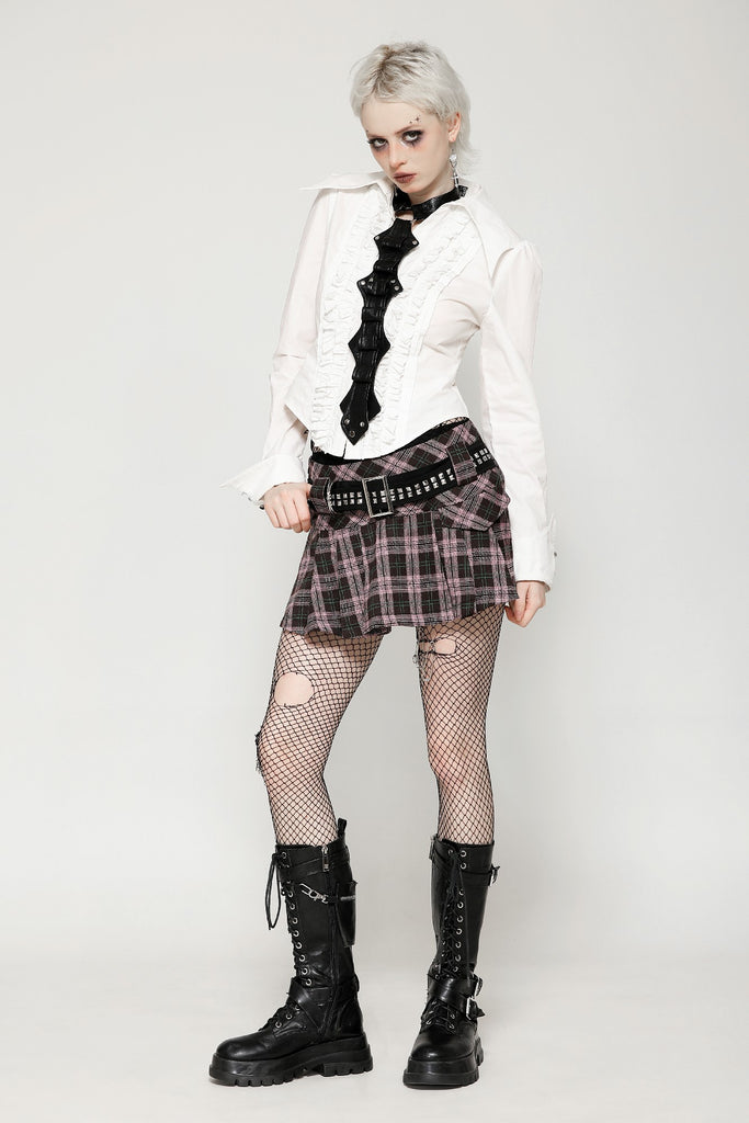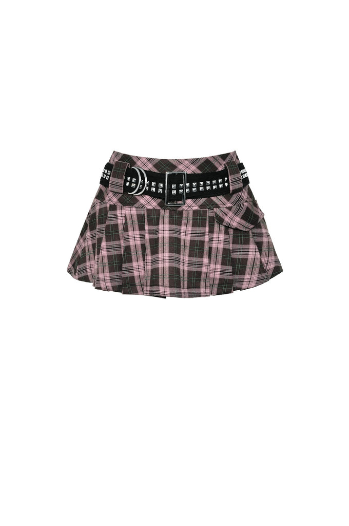 This pink plaid mini skirt combines a school-inspired pleated design with punk-style metal studs, creating a unique blend of sweetness and edginess. Perfect for casual outings, adding a standout look to your street style.
