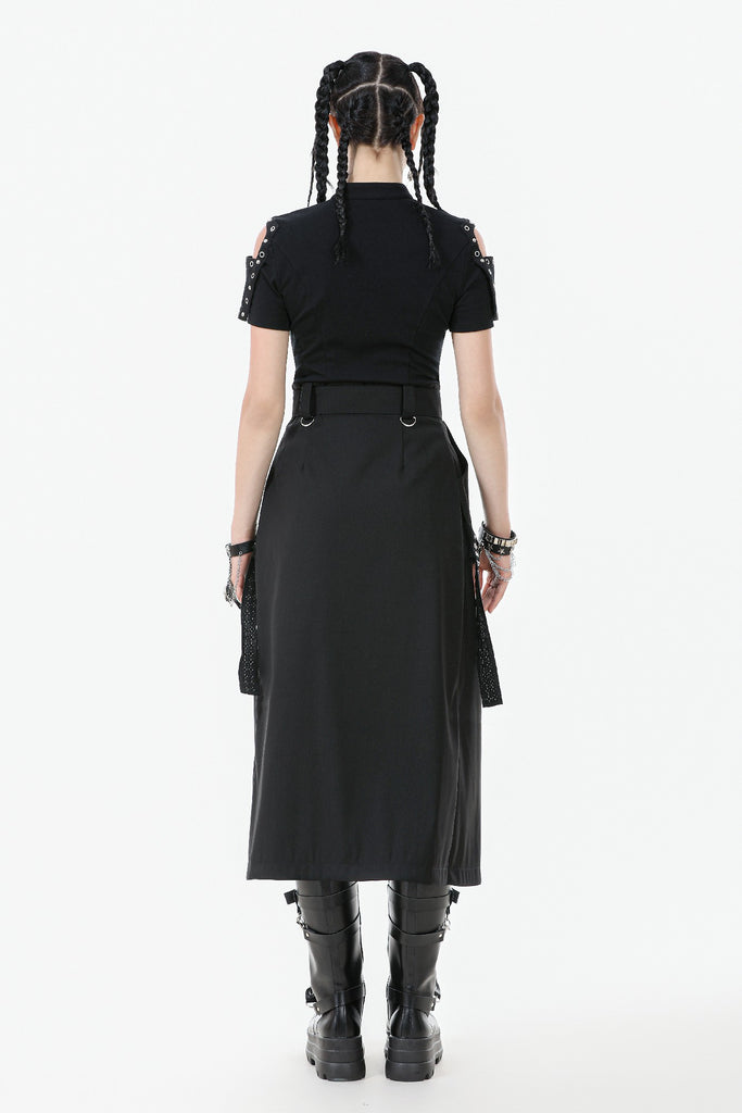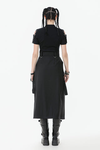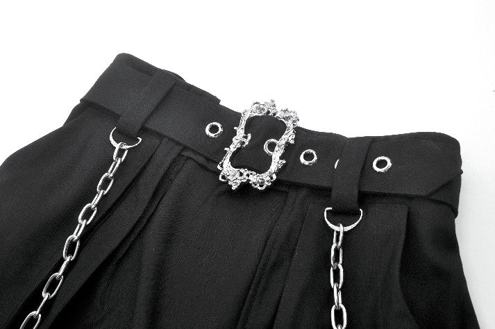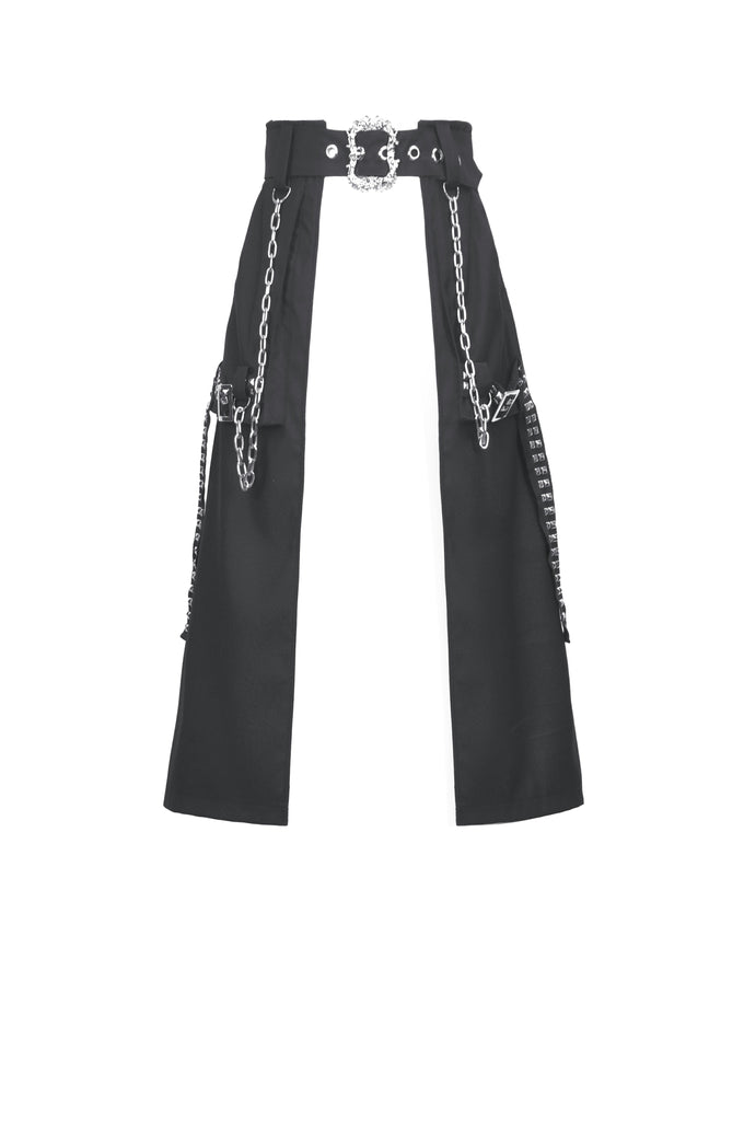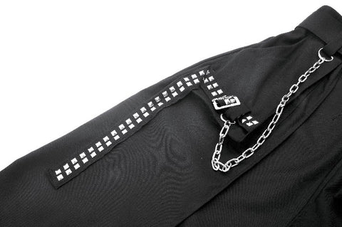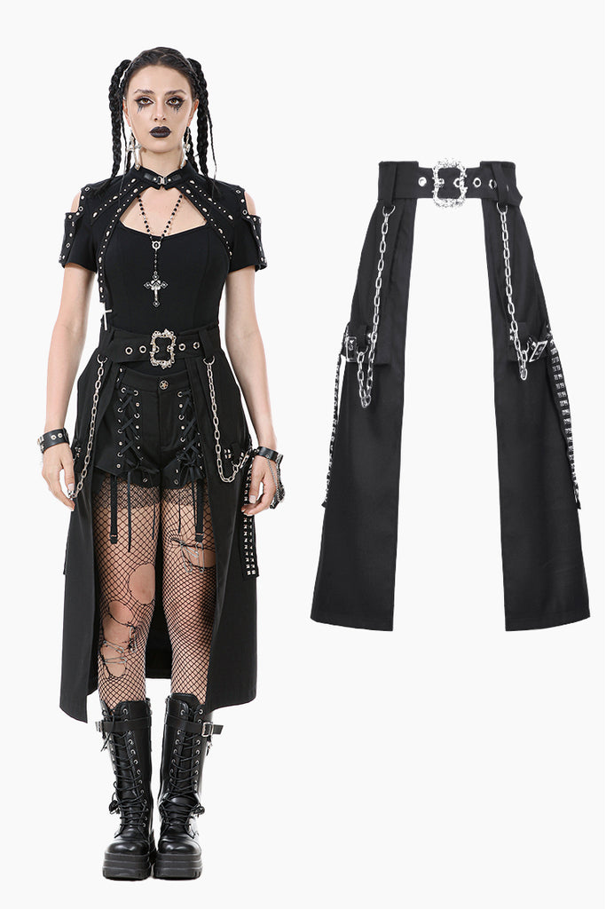 Two large utility pockets adorn the sides, detailed with eyelets and rivets, delivering a raw, industrial feel. Both sides are finished with heavy metal chains, evoking a caged, cyberpunk edge — unapologetically hard and fiercely stylish.