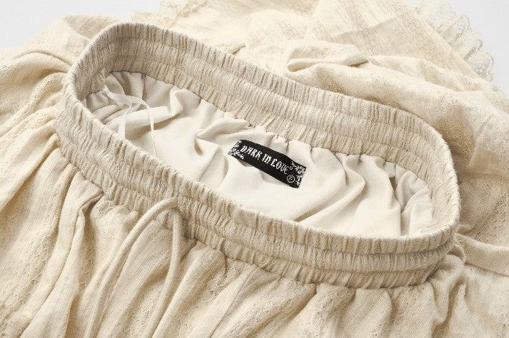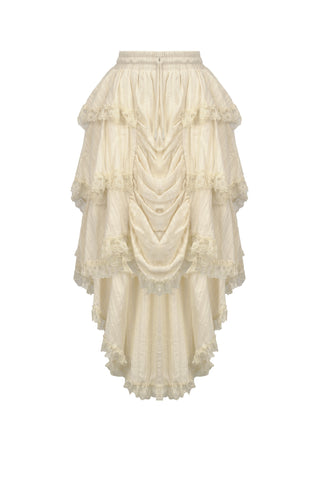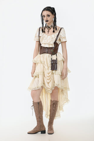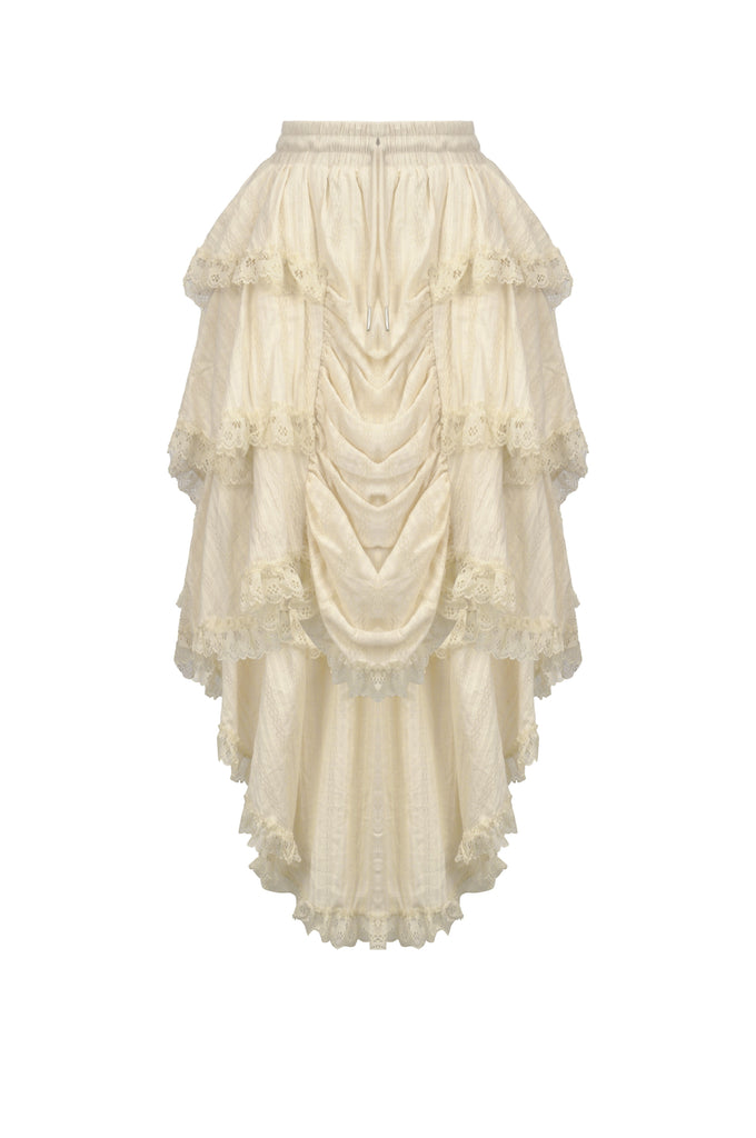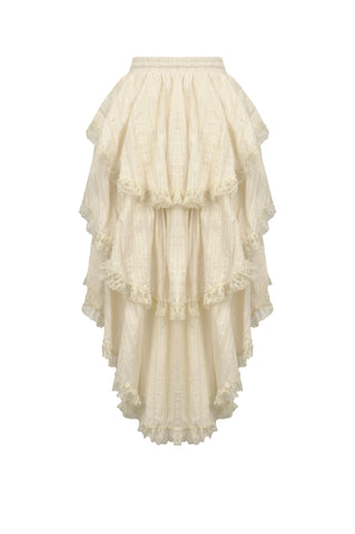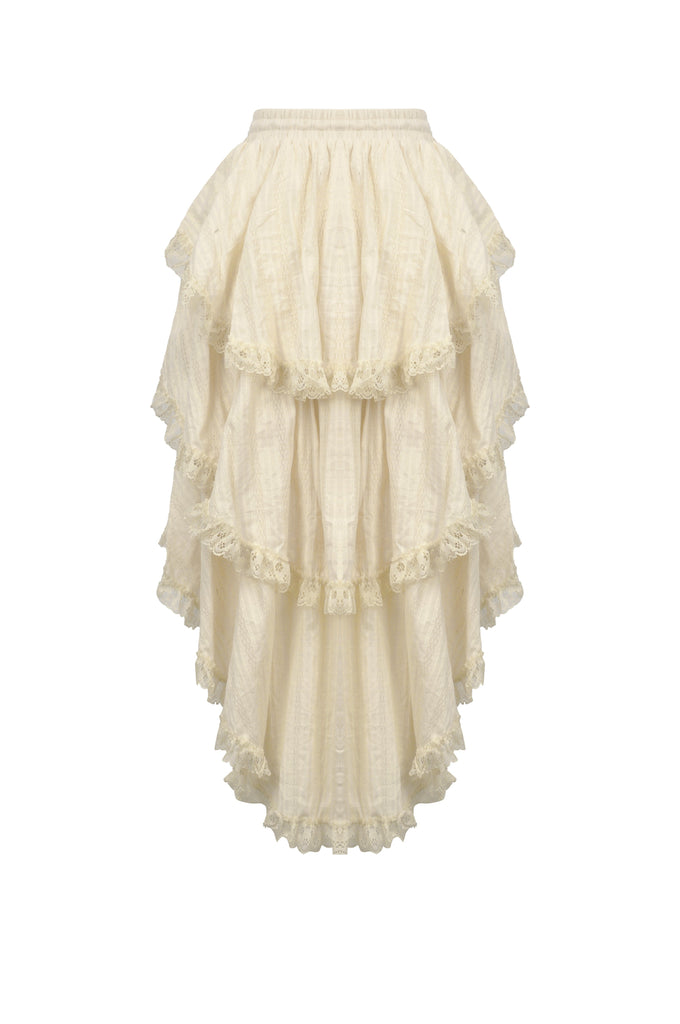 Three-tiered skirt hem detailed with intricate pleated lace layers, evoking the slow-turning gears of time.