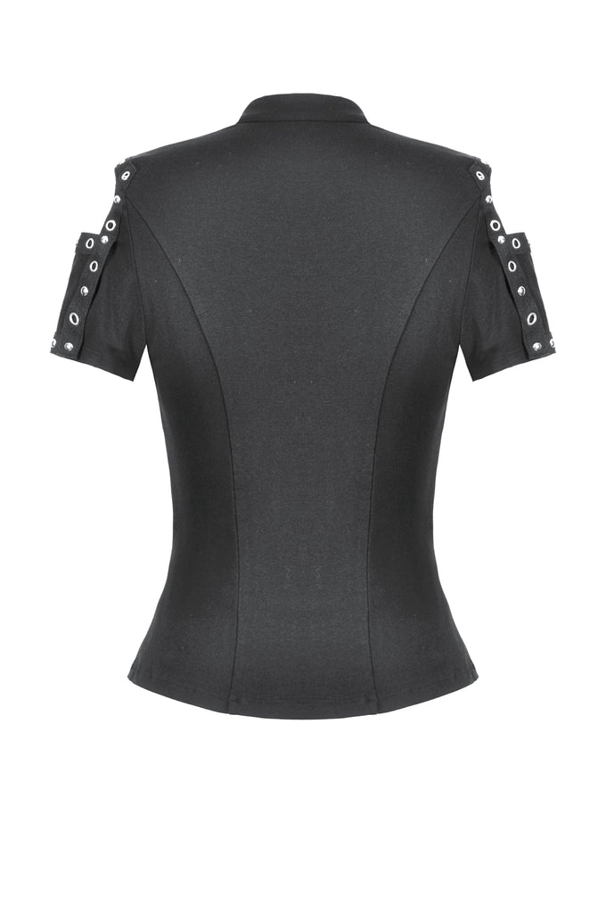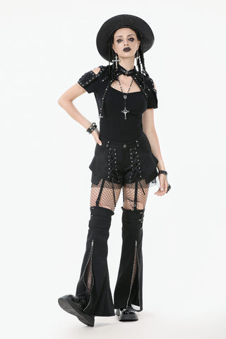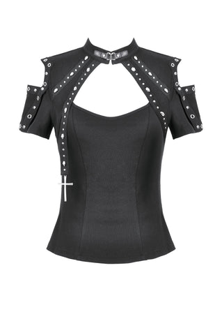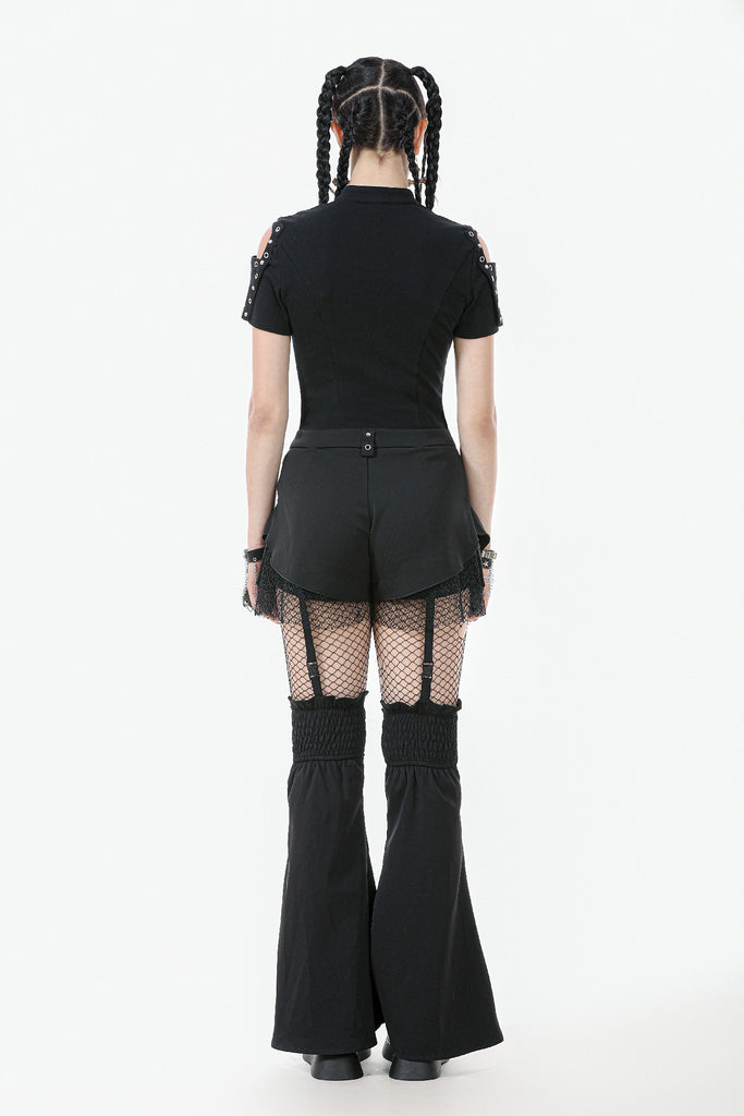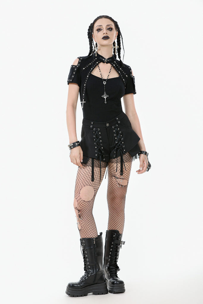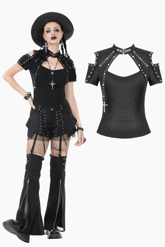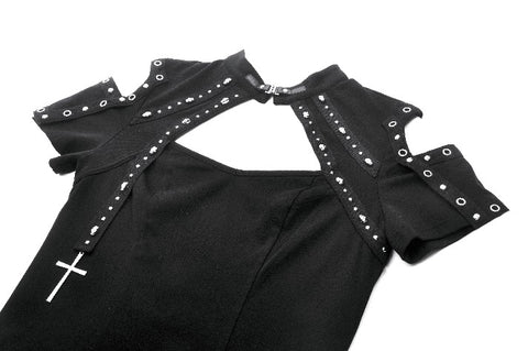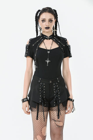 The asymmetrical neckline is accented with dual irregular sword-like straps and bold ring closures, evoking a warrior’s armor. A single studded eyelet strap falls diagonally from the shoulder, breaking symmetry and echoing deconstructed punk vibes. Mesh panels at the waist and hem add both transparency and layering, merging cyber edge with body-conscious sensuality.