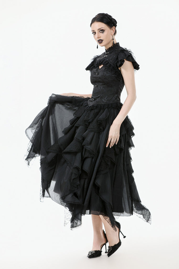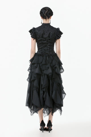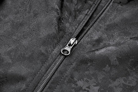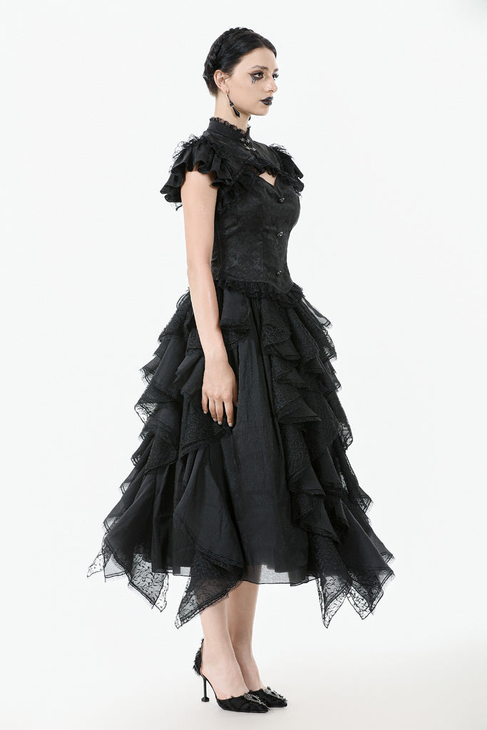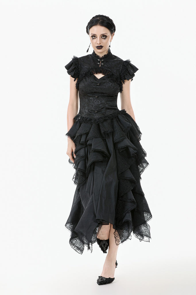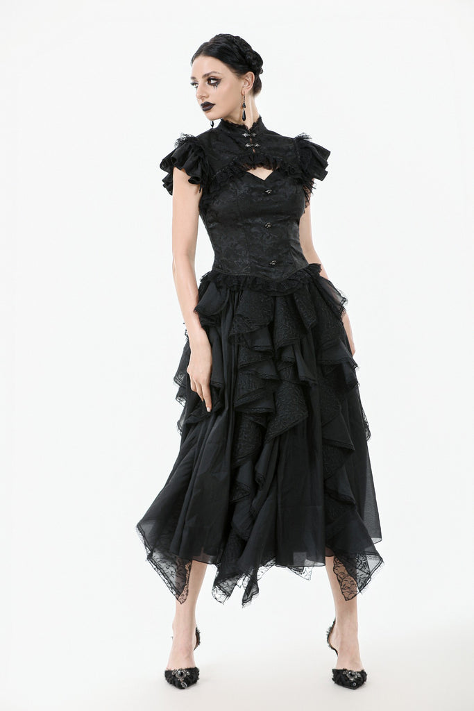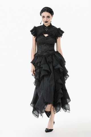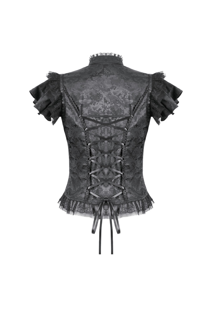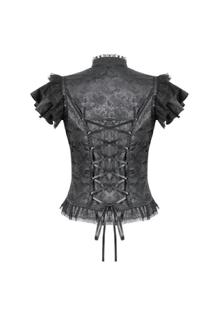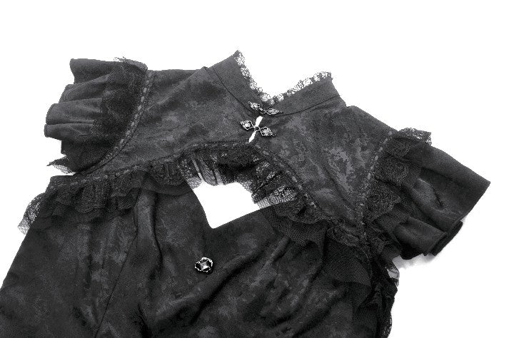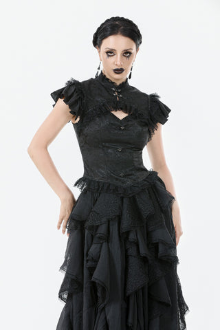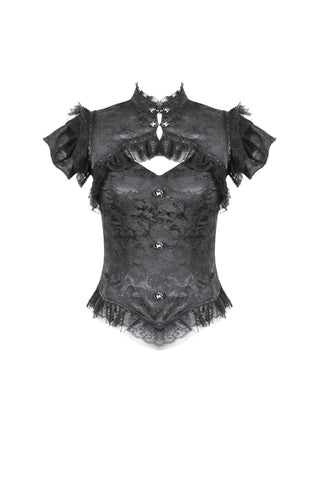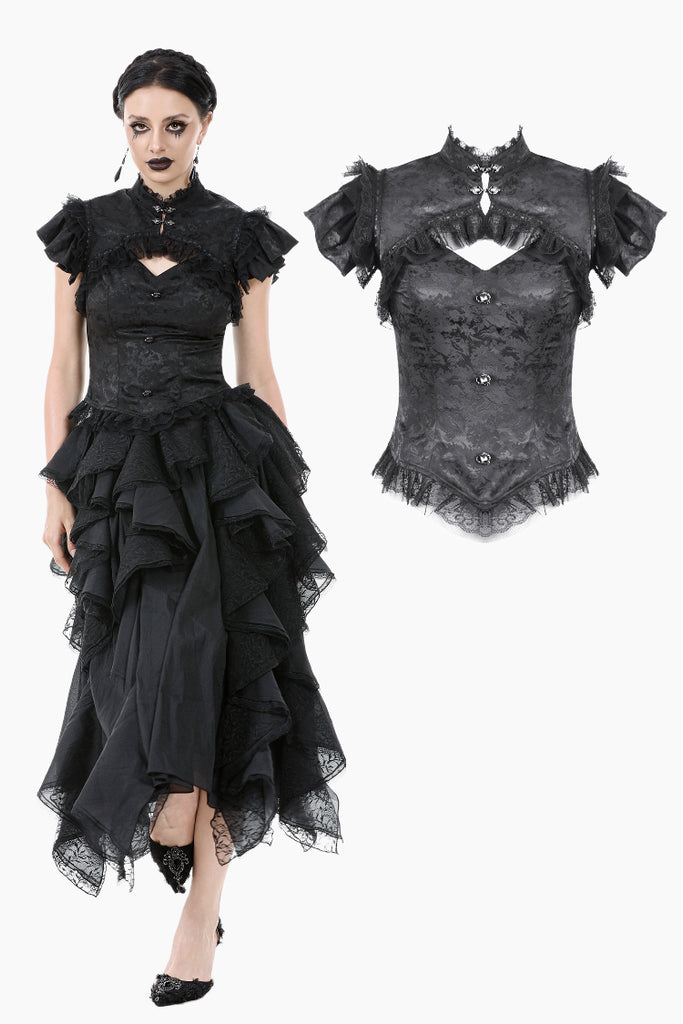 Drenched in dark elegance, this Gothic brocade top is a noble homage to aristocratic rebellion. The sculpted cut-out at the chest recalls vintage silhouettes, framed by a dramatic metal clasp at the neckline—both ornamental and symbolic. Layered lace at the shoulders evokes baroque romance, while the decorative buttons along the front panel bring structured balance. The adjustable lace-up back ensures both fit and flourish, adding a final touch of mystique. Ideal for ceremonial moments or after-dark occasions, this piece radiates timeless power.