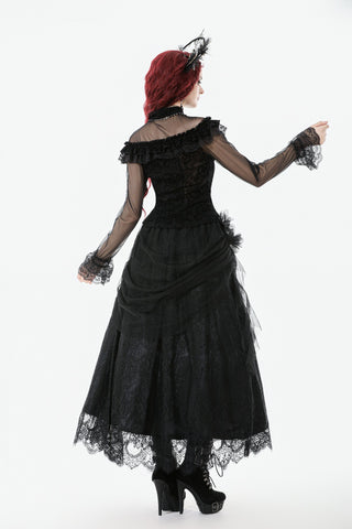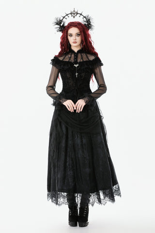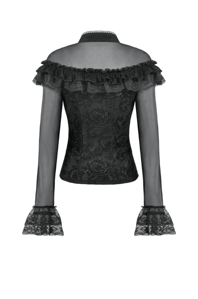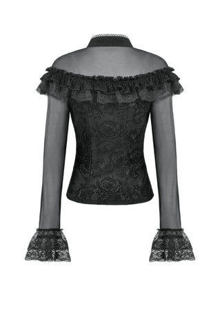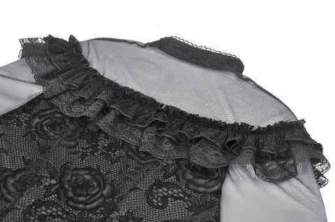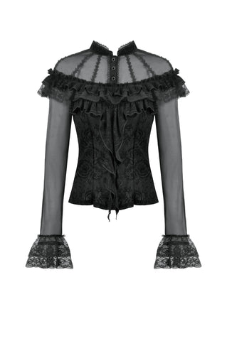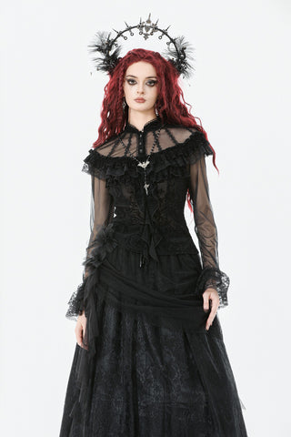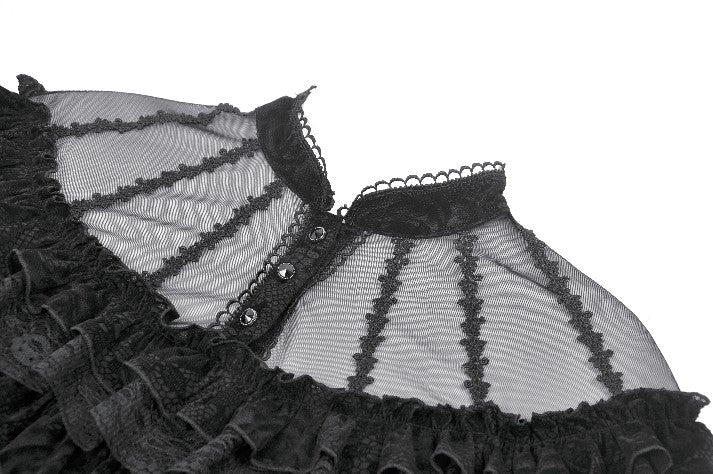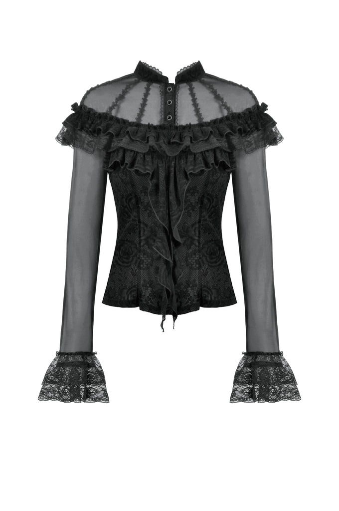 This gothic court-style blouse is crafted from flocked fabric and stretch sheer mesh, embodying both luxury and mystery. The stand collar is trimmed with scalloped lace, while the chest features sheer mesh with delicate floral lace accents. Decorative scalloped lace runs along the placket, fastened with three black gemstone buttons for a refined gothic touch. The front is adorned with triple-layered ruffles—flocked fabric, lace, and cascading lace—adding a dramatic layered effect. Slim-fit mesh sleeves with double-layer lace cuffs complete the design. Perfect for daily wear or standing out at gatherings with an elegant gothic statement.