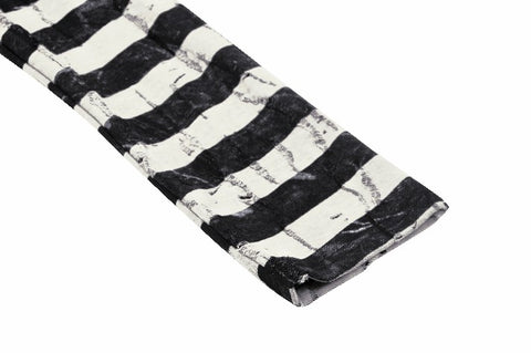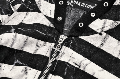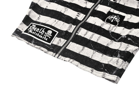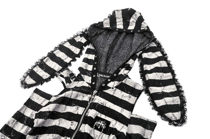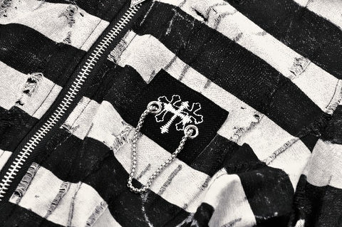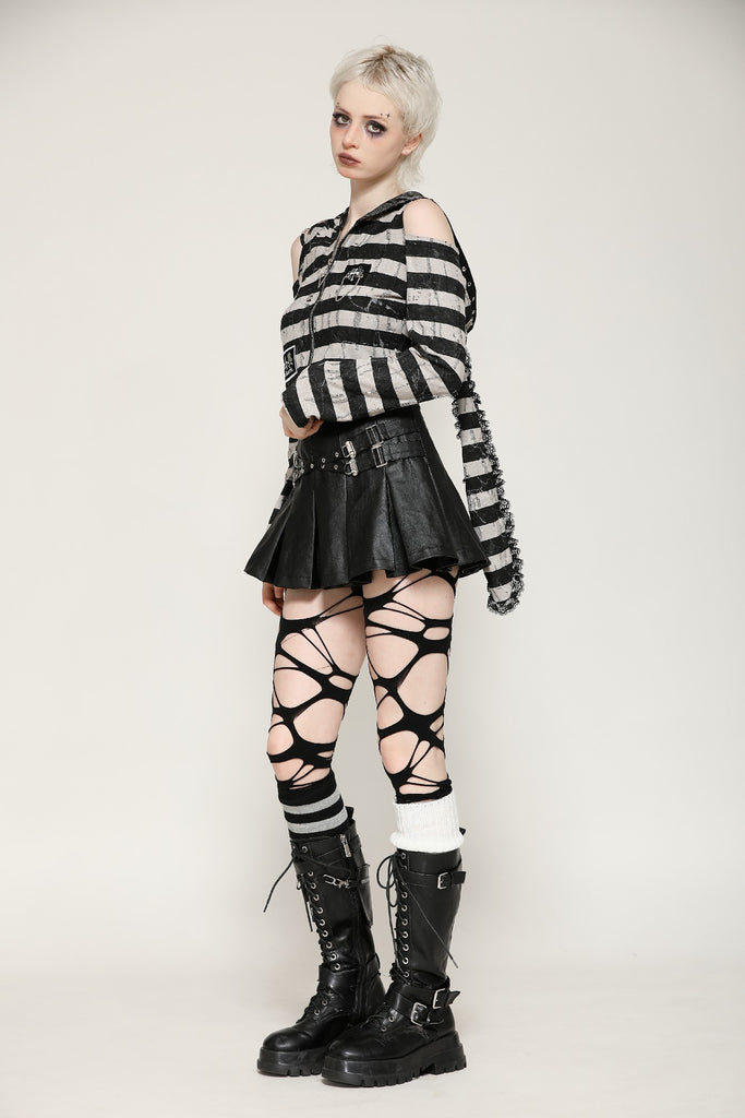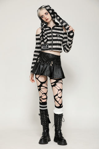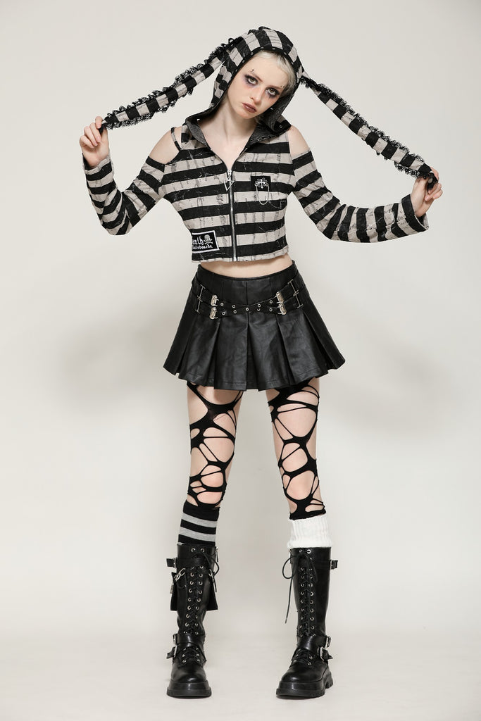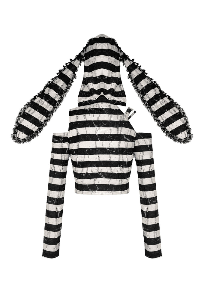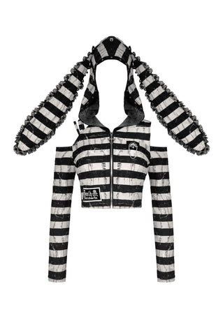 This cropped top features a distressed black and white striped knit fabric, evoking a vintage punk vibe. The design is unique, with long bunny ear hoods adding a playful touch, while the asymmetric shoulder cut enhances its rebellious flair. The punk-style patches on the body are the perfect finishing touch, making this top both quirky and full of personality.