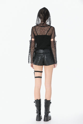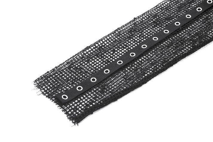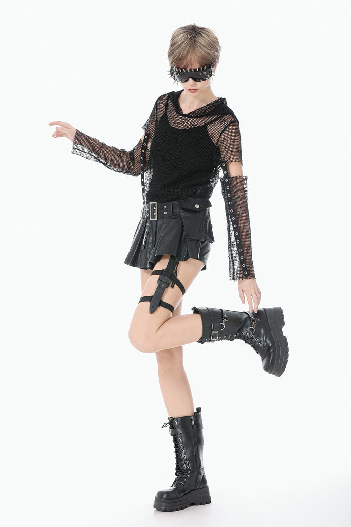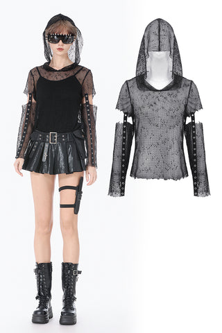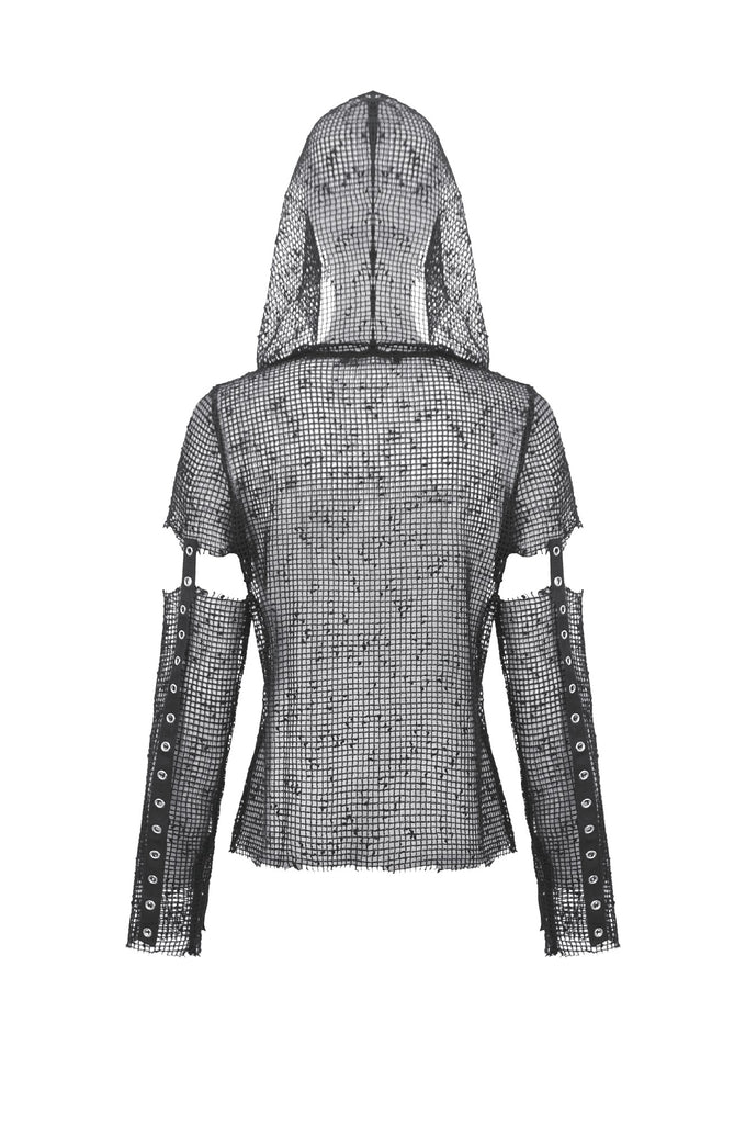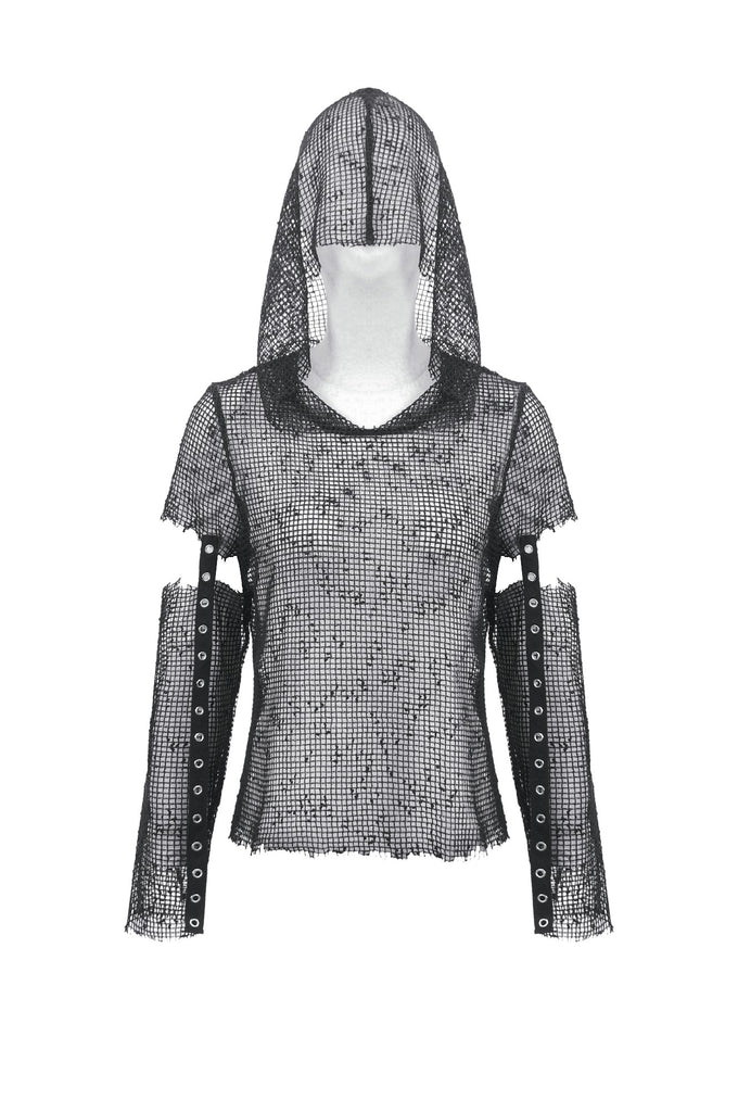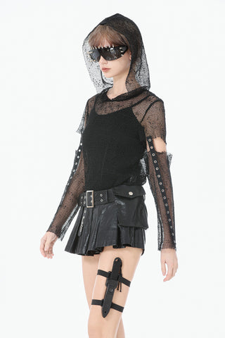 This mesh base top features a fully hollow-out grid fabric for a bold punk and futuristic look. The hood adds a mysterious edge, while the sleeves use a separated construction connected by metal grommet straps for a distinctive deconstructed effect. Lightweight and breathable, it works perfectly for layering or stage styling, delivering strong visual impact and subcultural aesthetics.