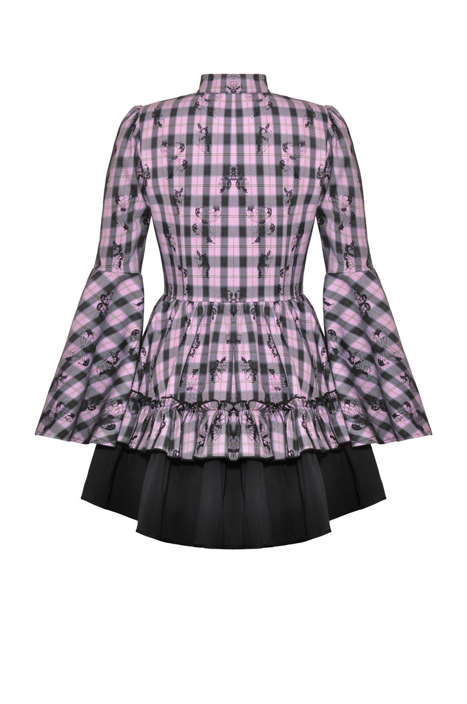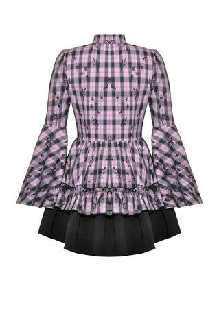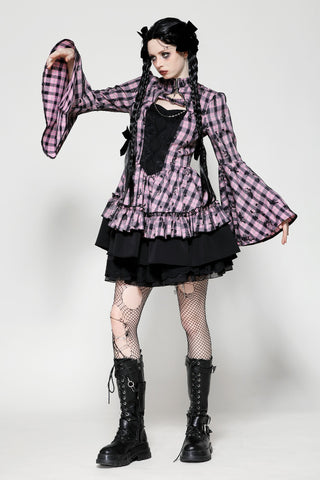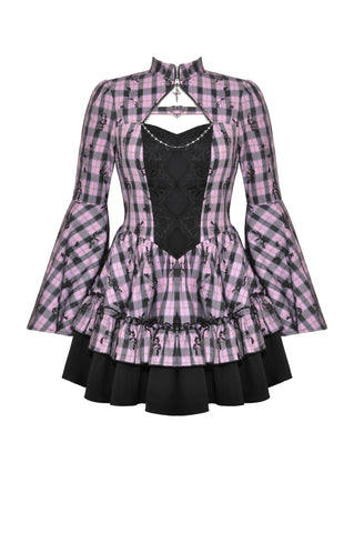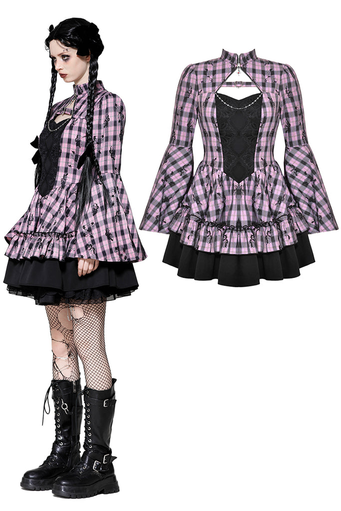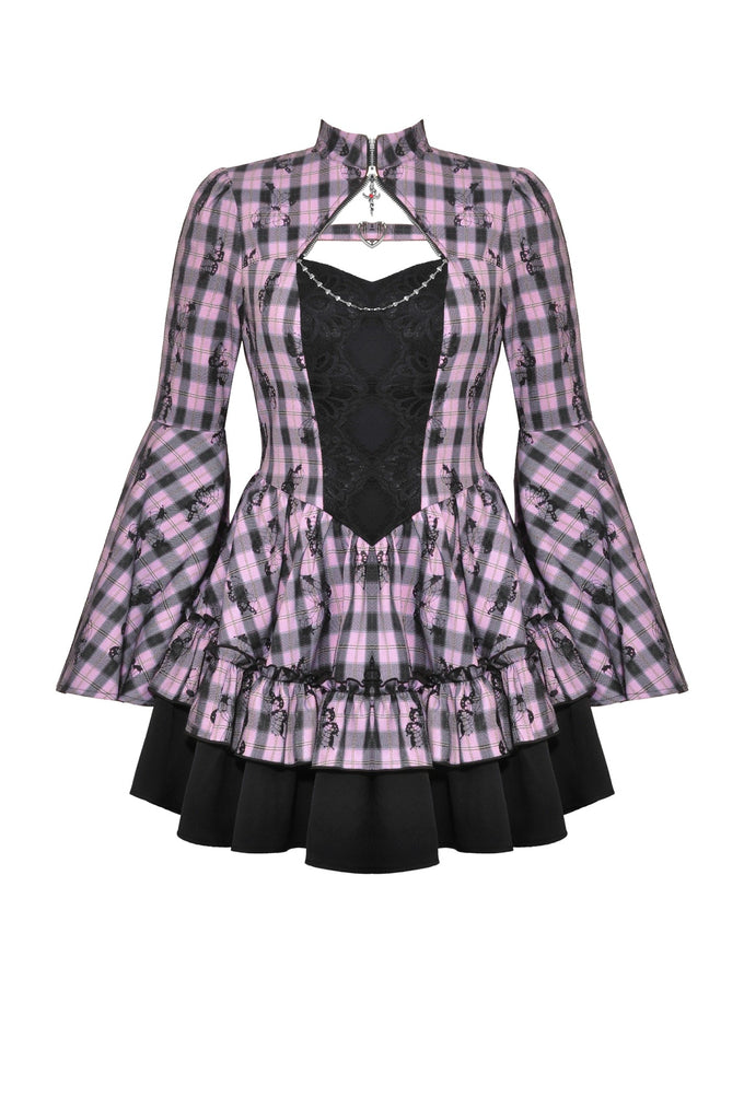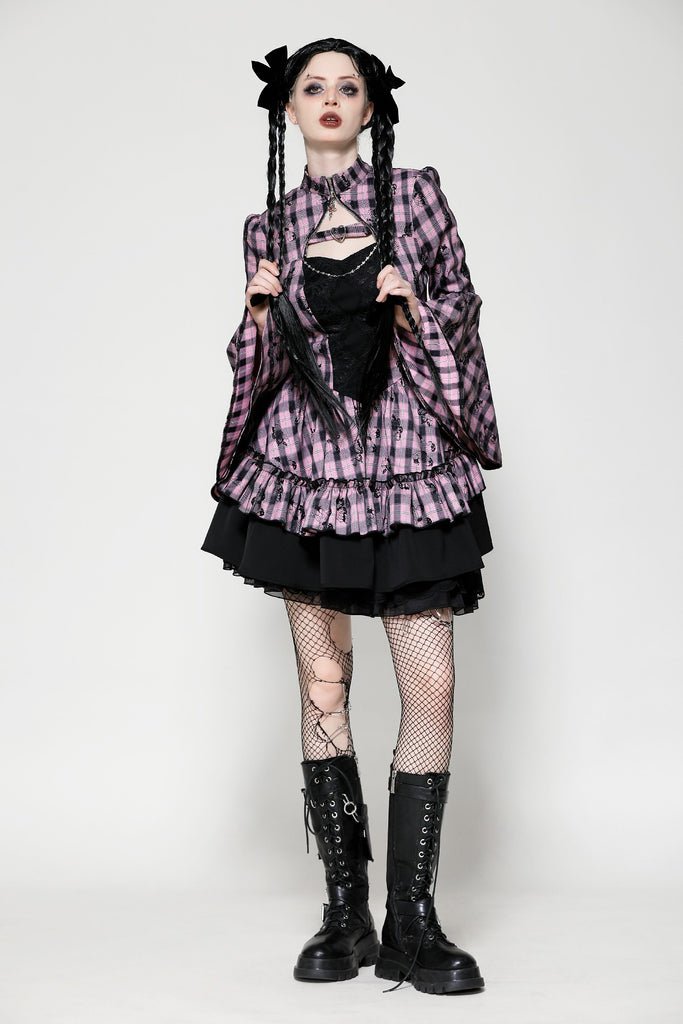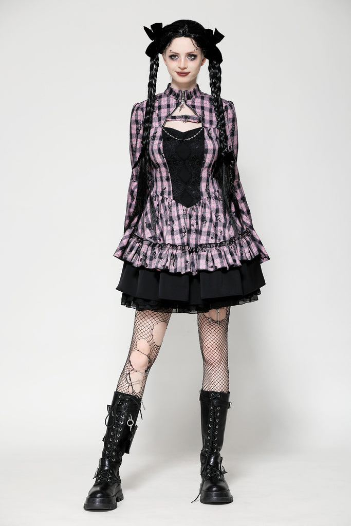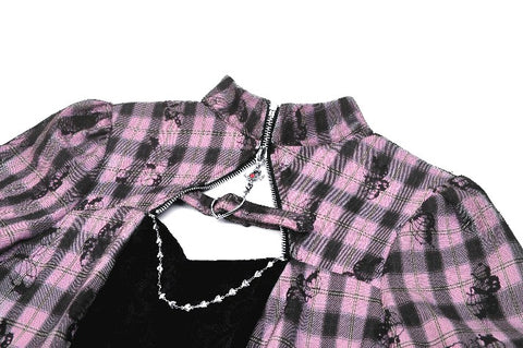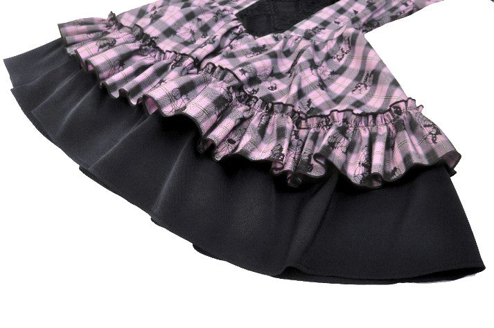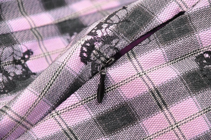 This Lolita plaid dress combines pink checks with butterfly lace for a playful, sensual vibe. The inverted metal zipper features a vintage bronze heart-cross pull, while heart accents on the chest add texture. A double-layered skirt enhances depth, and a concealed back zipper ensures practicality. It blends youthful charm with retro elegance in a bold, unique style.