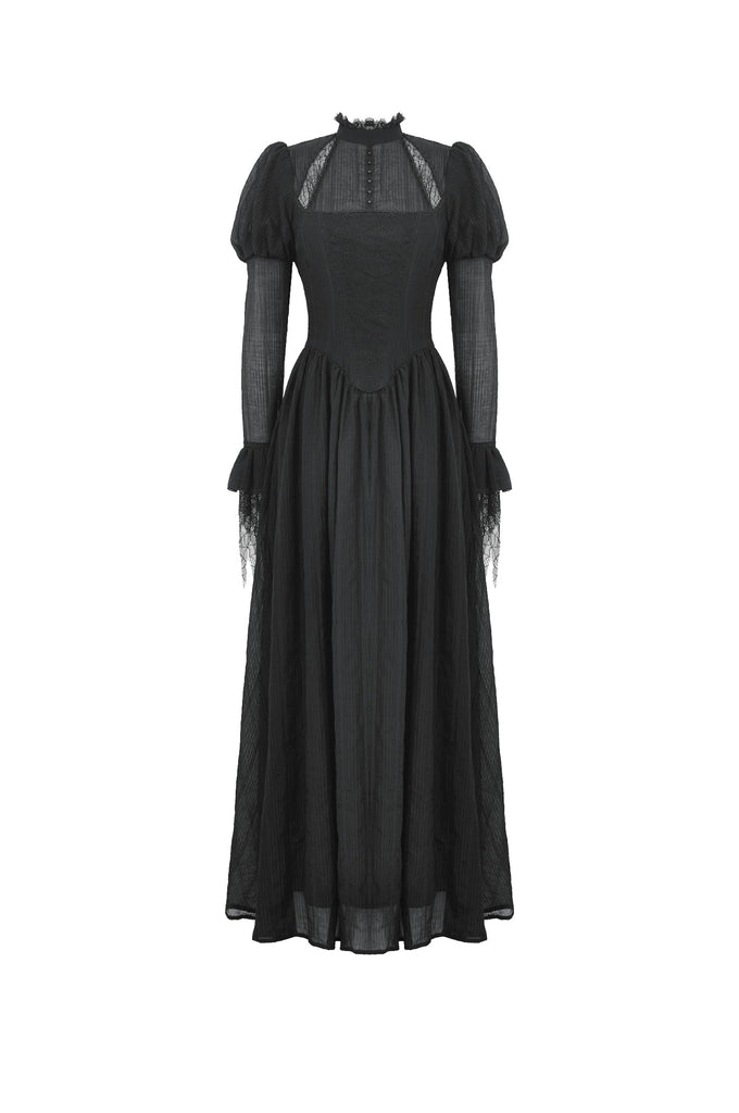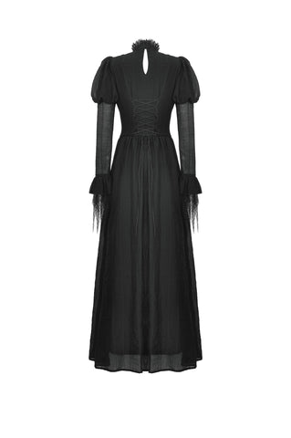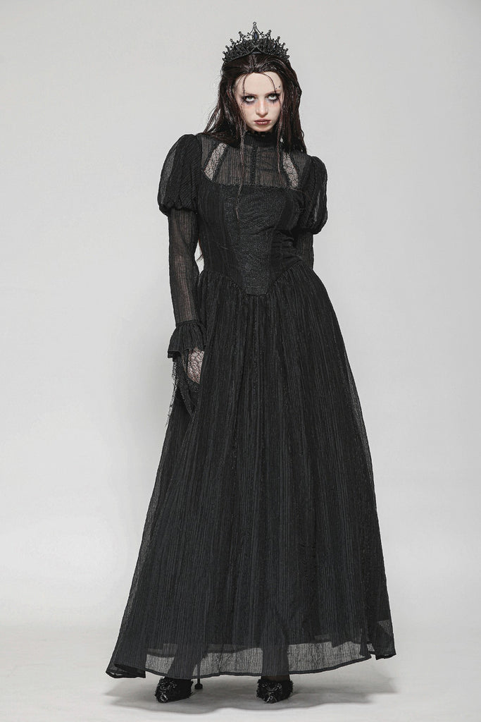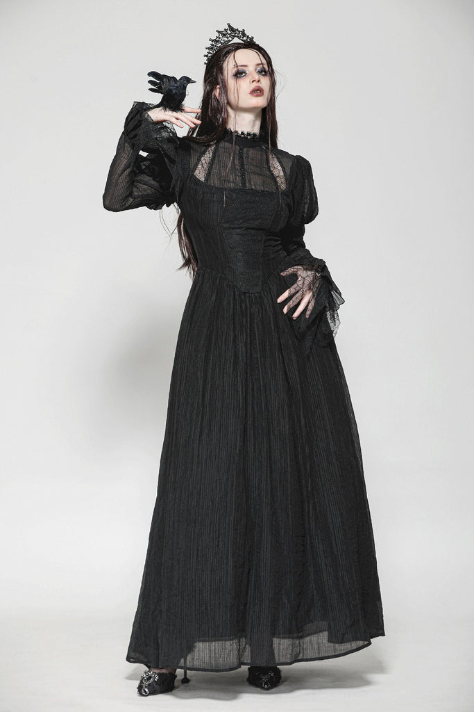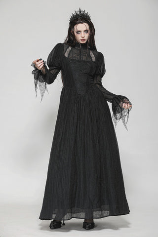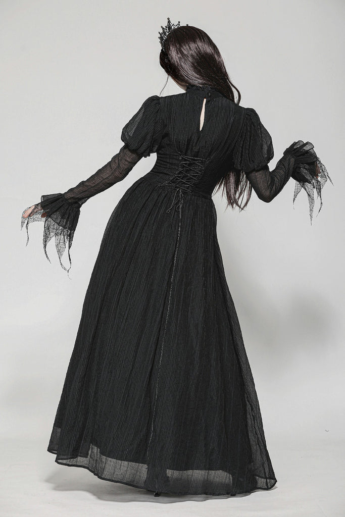 This black Gothic-inspired long dress masterfully combines vintage and mysterious elements, showcasing a sense of solitude and elegance. The puffed princess sleeves and fitted silhouette complement each other, enhancing the wearer's graceful aura. The combination of pleated fabric and spiderweb lace adds a unique and eerie touch, as if the dress carries the chill of an abandoned castle. The distressed cuffs further emphasize the quiet and melancholic atmosphere, making it feel like this dress belongs to the lonely mistress wandering the desolate halls of an ancient mansion, embodying a cold yet sorrowful presence.