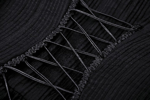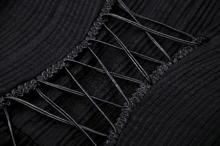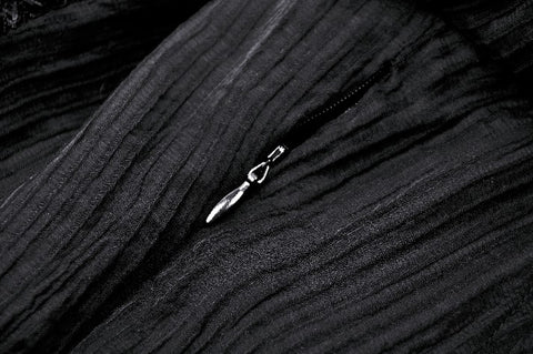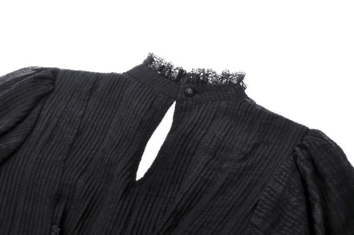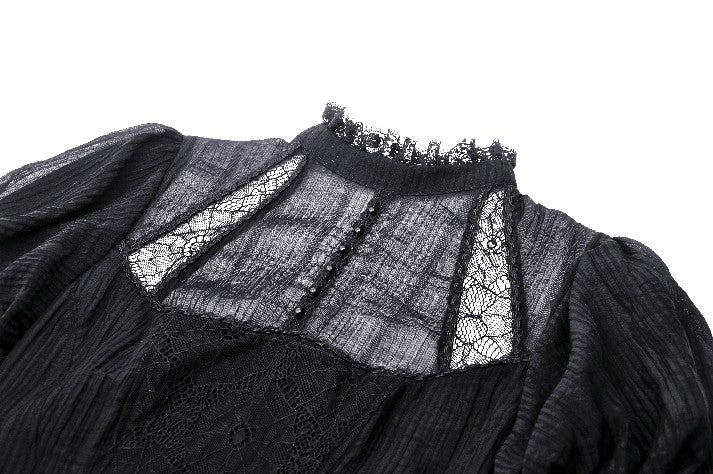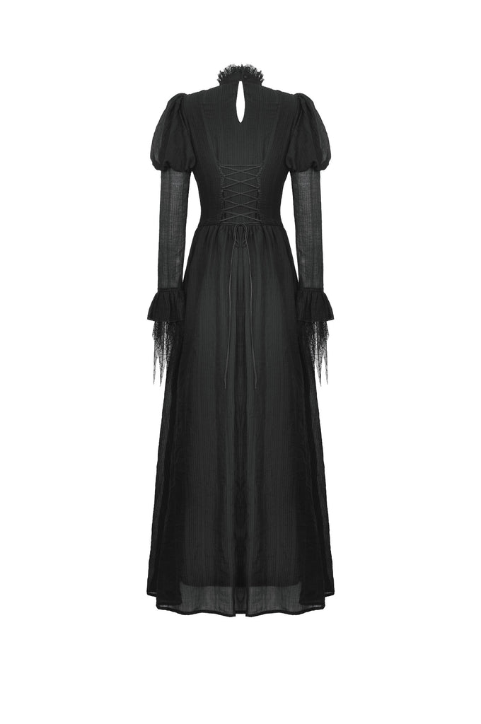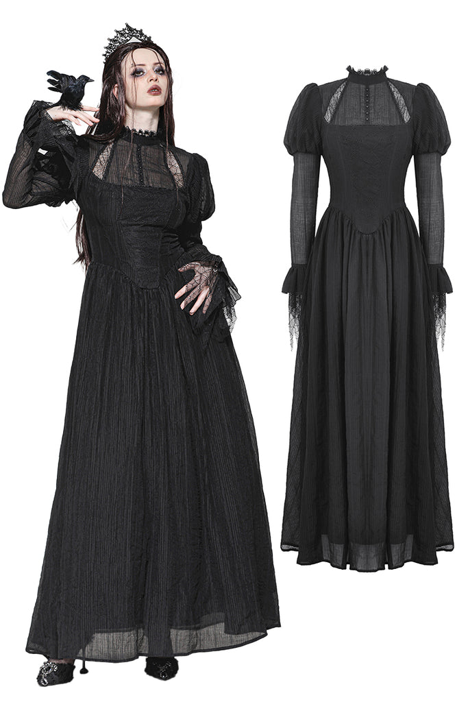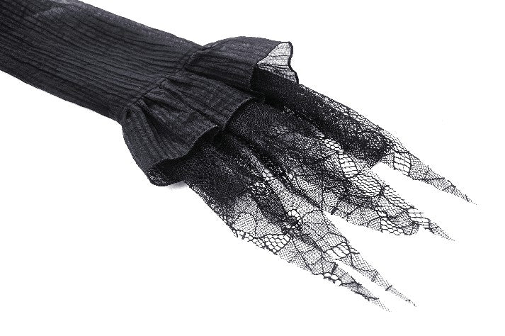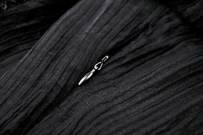 This black Gothic-inspired long dress masterfully combines vintage and mysterious elements, showcasing a sense of solitude and elegance. The puffed princess sleeves and fitted silhouette complement each other, enhancing the wearer's graceful aura. The combination of pleated fabric and spiderweb lace adds a unique and eerie touch, as if the dress carries the chill of an abandoned castle. The distressed cuffs further emphasize the quiet and melancholic atmosphere, making it feel like this dress belongs to the lonely mistress wandering the desolate halls of an ancient mansion, embodying a cold yet sorrowful presence.