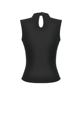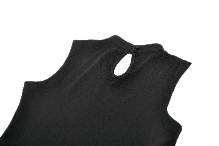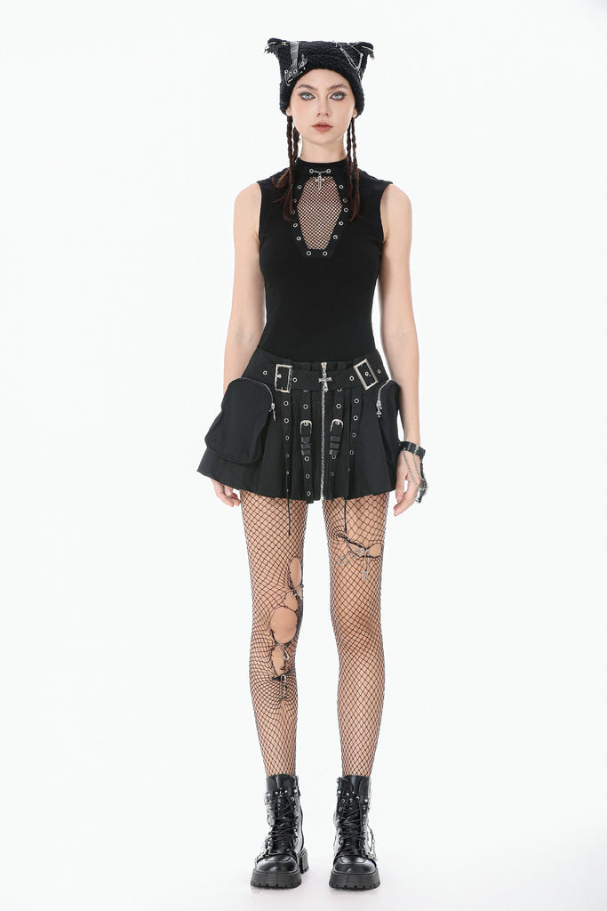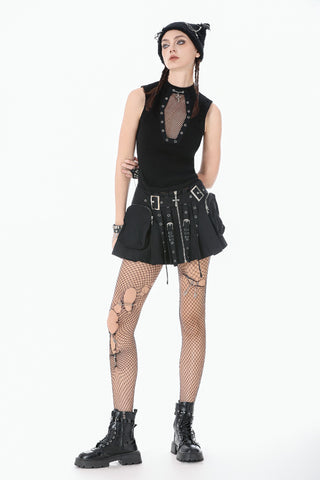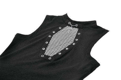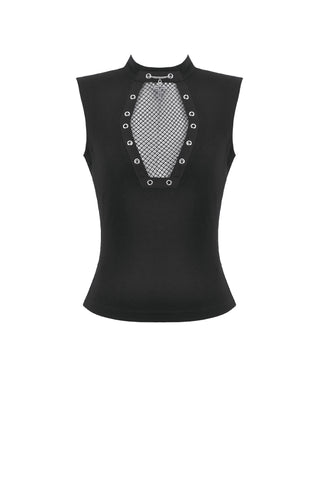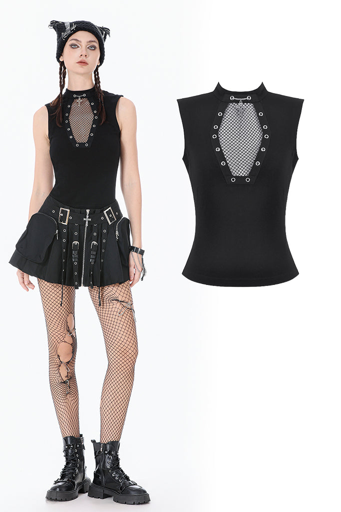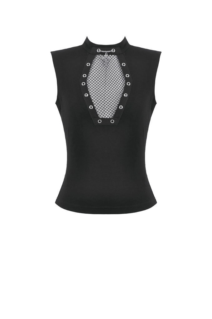This punk top features a coffin-shaped mesh panel at the front, framed by grommet tape for a bold statement look. The stand collar opens at the back for added styling flexibility and ease of wear. Made from stretch knit fabric, it offers a fitted yet comfortable silhouette. A versatile piece that blends dark subculture aesthetics with everyday practicality.