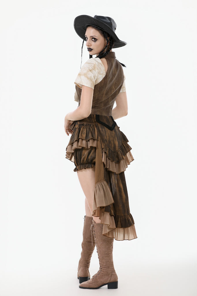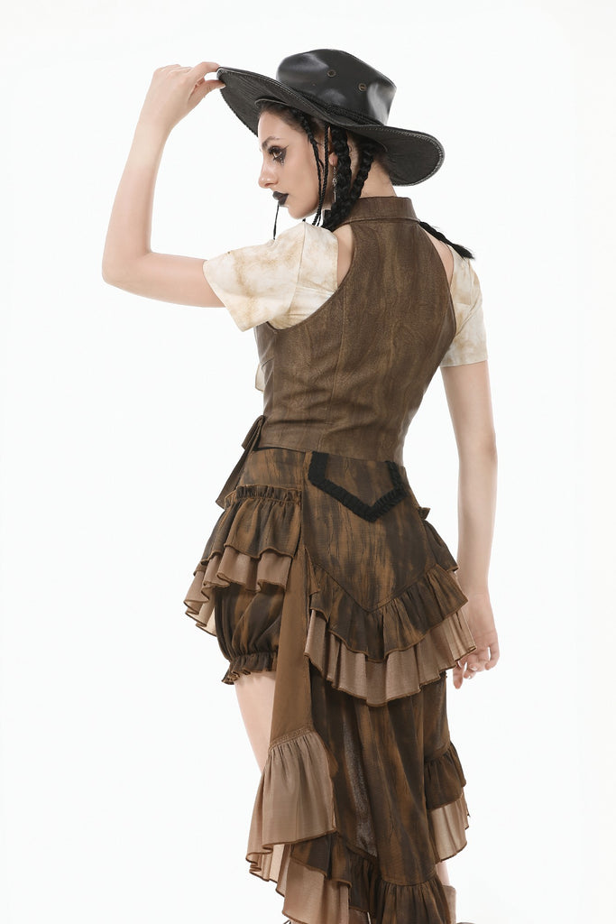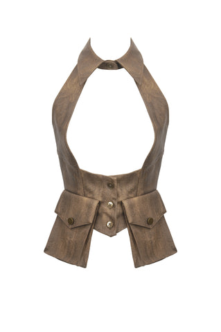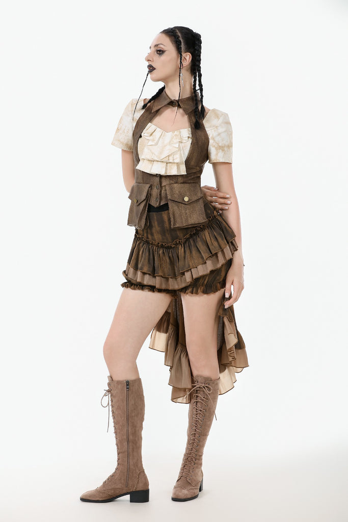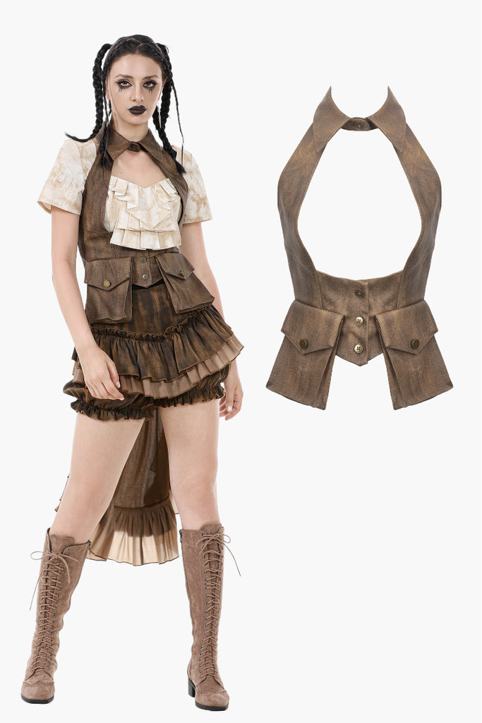 Where invention meets seduction—this steampunk vest brings vintage machinery and gothic elegance into a single striking silhouette. A bold chest cutout reveals just enough edge, framed by a structured turn-down collar that adds timeless character.