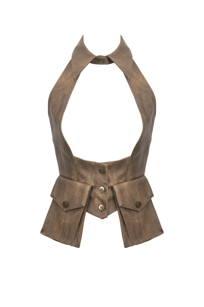 Finished with antique copper buttons, this vest radiates a worn-industrial charm. At the waist, two utility-style pockets blend function with flair, perfect for modern adventurers or wandering alchemists.